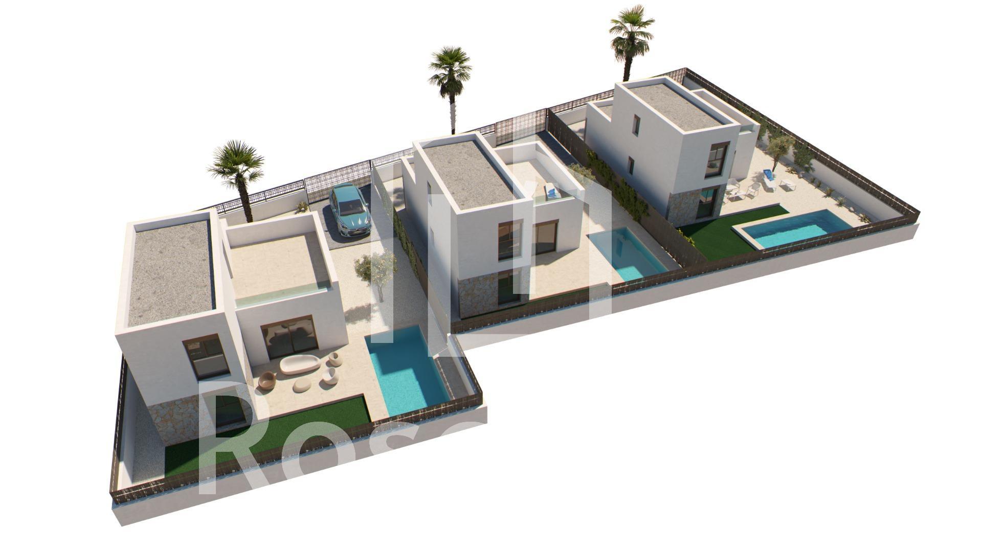Exclusive New-Build Villas in Algorfa Golf Course Area Discover these stunning new-build villas in Algorfa, nestled in the serene surroundings of one of Spain’s most prestigious golf resorts, La Finca Golf & Spa Resort. Located in the southern part of Alicante Province, this exclusive development combines luxurious living with the benefits of resort-style amenities, creating the ideal home for golf enthusiasts and those seeking a relaxed Mediterranean lifestyle. Elegant 3-Bedroom Villas with Private Pool and Modern Design Each villa is thoughtfully designed over two spacious floors, featuring 3 bedrooms and 2 bathrooms. The open-plan kitchen flows seamlessly into the living area, where large windows and sliding glass doors provide abundant natural light and direct access to the terrace and private pool. A convenient private parking space is included on the plot, enhancing the ease and exclusivity of these homes. Premium Features and Smart Home Technology These villas come with a range of high-end features to provide maximum comfort and security. Enjoy the convenience of private indoor parking, electric shutters, ducted air-conditioning, and a sophisticated home automation system. Additionally, a fully fitted alarm system ensures peace of mind. The south/southwest orientation allows for optimal natural lighting year-round, reducing energy consumption by providing warmth and brightness from sunrise to sunset. Bright, Open-Concept Living Spaces with Traditional Touches Designed with an open concept, these homes use large windows and sliding doors to promote cross-ventilation, keeping the interiors fresh and filled with natural light. The architectural design combines modern aesthetics with traditional elements, like stone accents on the façade and wooden details, creating a warm, inviting atmosphere. With an EPC A rating, these villas offer energy efficiency and sustainability, making them an eco-friendly choice for homeowners. Prime Location with Access to Beaches and Key Attractions Set in the well-established town of Algorfa, these villas are just a short drive from the pristine beaches of Guardamar and Torrevieja, where you can enjoy over 300 days of sunshine each year. Nearby, you’ll find shopping centers, fine dining restaurants, and vibrant entertainment venues. Excellent infrastructure and proximity to major roads, including the AP-7 motorway, ensure easy connections to popular destinations like Orihuela, Elche, Murcia, and Alicante. Alicante Airport is only 40 km away, while Murcia Airport is 55 km, making travel convenient. Your Mediterranean Dream Home Awaits – Contact Us Today Don’t miss this opportunity to own a luxurious villa in Algorfa’s most prestigious golf resort area. Experience the perfect blend of modern comfort, traditional charm, and Mediterranean lifestyle. Contact us now to arrange a viewing and discover your dream home.