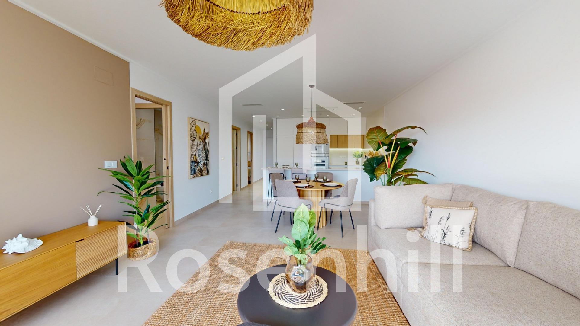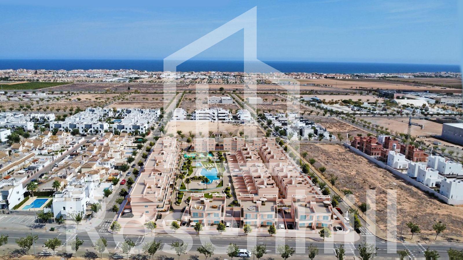 Exclusive New Development in Pilar de la Horadada, Costa Blanca, Spain Modern Homes Close to the Sea Discover this new residential complex in Pilar de la Horadada, a privileged location on the Costa Blanca. Only 2 km from the beach, this project offers a wide variety of 3 bedroom, 2 bathroom properties, with private parking included in the price. The development has spacious communal areas, including a communal swimming pool, landscaped gardens and a children’s play area, ideal for the whole family to enjoy. Different Typologies to suit your Lifestyle This development offers various housing options: Ground floor apartments with private gardens. Middle floor flats with large terraces. Penthouses with private solarium. Ground floor bungalows with private garden. Top floor bungalows with private garden and solarium. Townhouses and semi-detached houses with garden and solarium. All homes have been designed in a modern and functional style, using high quality materials and contemporary finishes. Equipment and Qualities The properties are equipped with: Pre-installation of ducted air conditioning. Exterior aluminium carpentry with thermal break and double glazing. Reinforced access door for greater security. Aerothermal system for efficient hot water production. Built-in wardrobes with LED lighting. Bathroom furniture and screens included. Pilar de la Horadada: A Privileged Place to Live in Pilar de la Horadada is a coastal town at the southern end of the Costa Blanca, with an exceptional climate and an excellent quality of life. Its lively main street offers a wide variety of shops, supermarkets, restaurants and essential services. Just a 5 minute drive away, you will find the stunning beaches of Torre de la Horadada and Mil Palmeras, with golden sand a lovely promenade. In addition, the area has cycle paths, hiking trails and multiple sporting activities. Distances to Key Points Lo Romero Golf Course – 5 km (10 minutes drive). Corvera Airport (Murcia) – 40 km (40 minutes by car). Alicante Airport – 55 km (55 minutes by car). Zenia Boulevard Shopping Centre – 15 km (15 minutes by car). Torre de la Horadada Marina – 3 km (5 minutes by car). Request More Information Today Don’t miss this opportunity to purchase a brand new property in one of the best areas of the Costa Blanca. Contact us now for more details and to arrange a viewing.