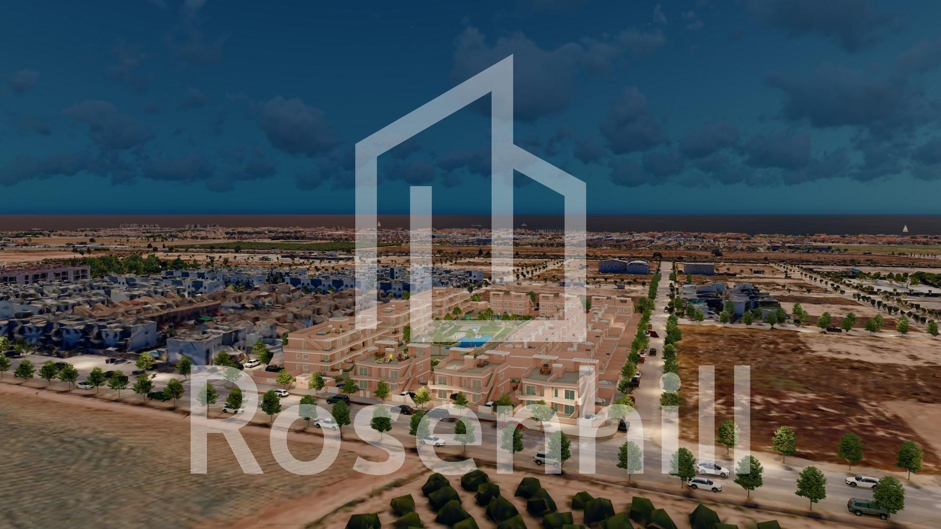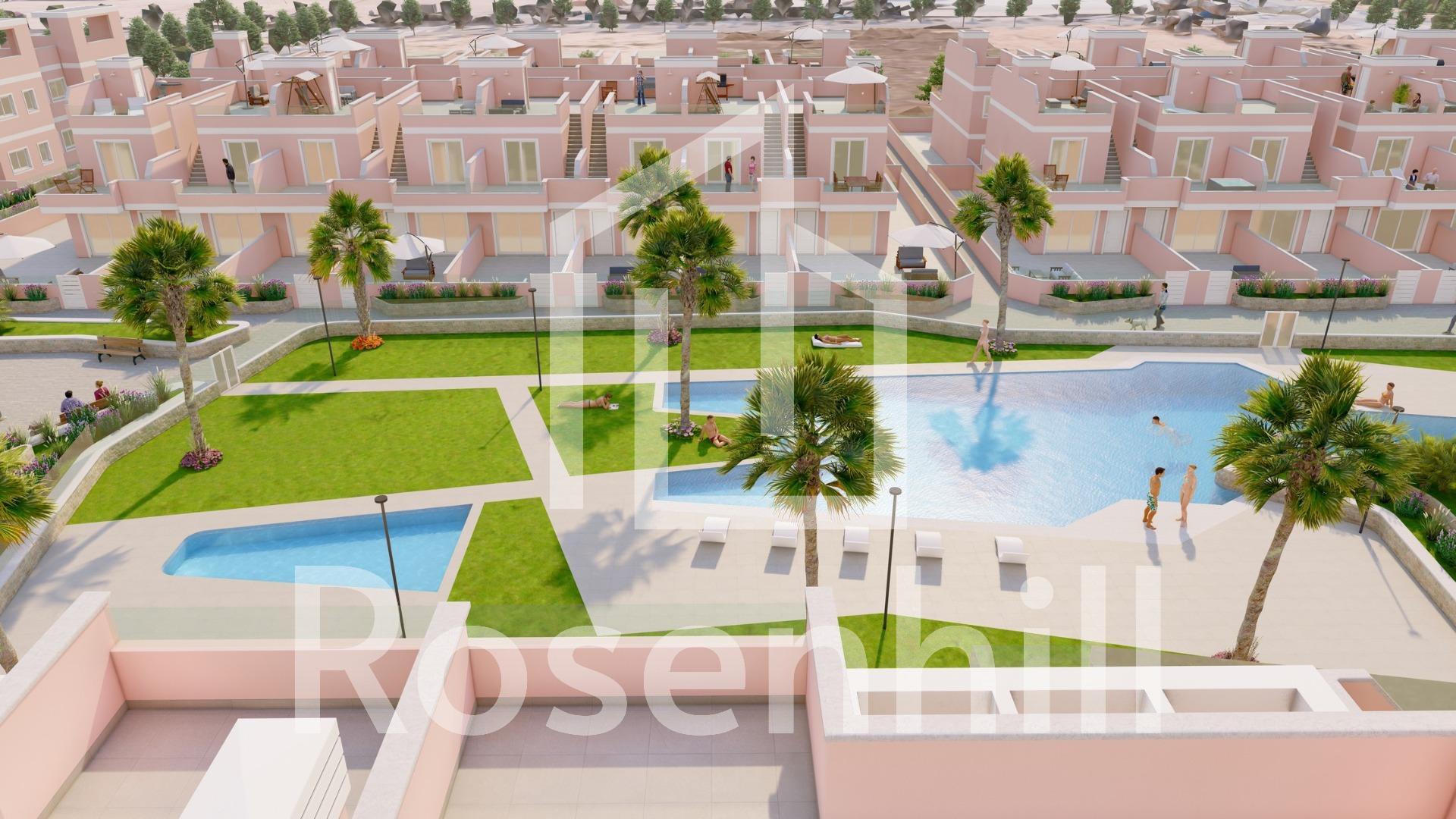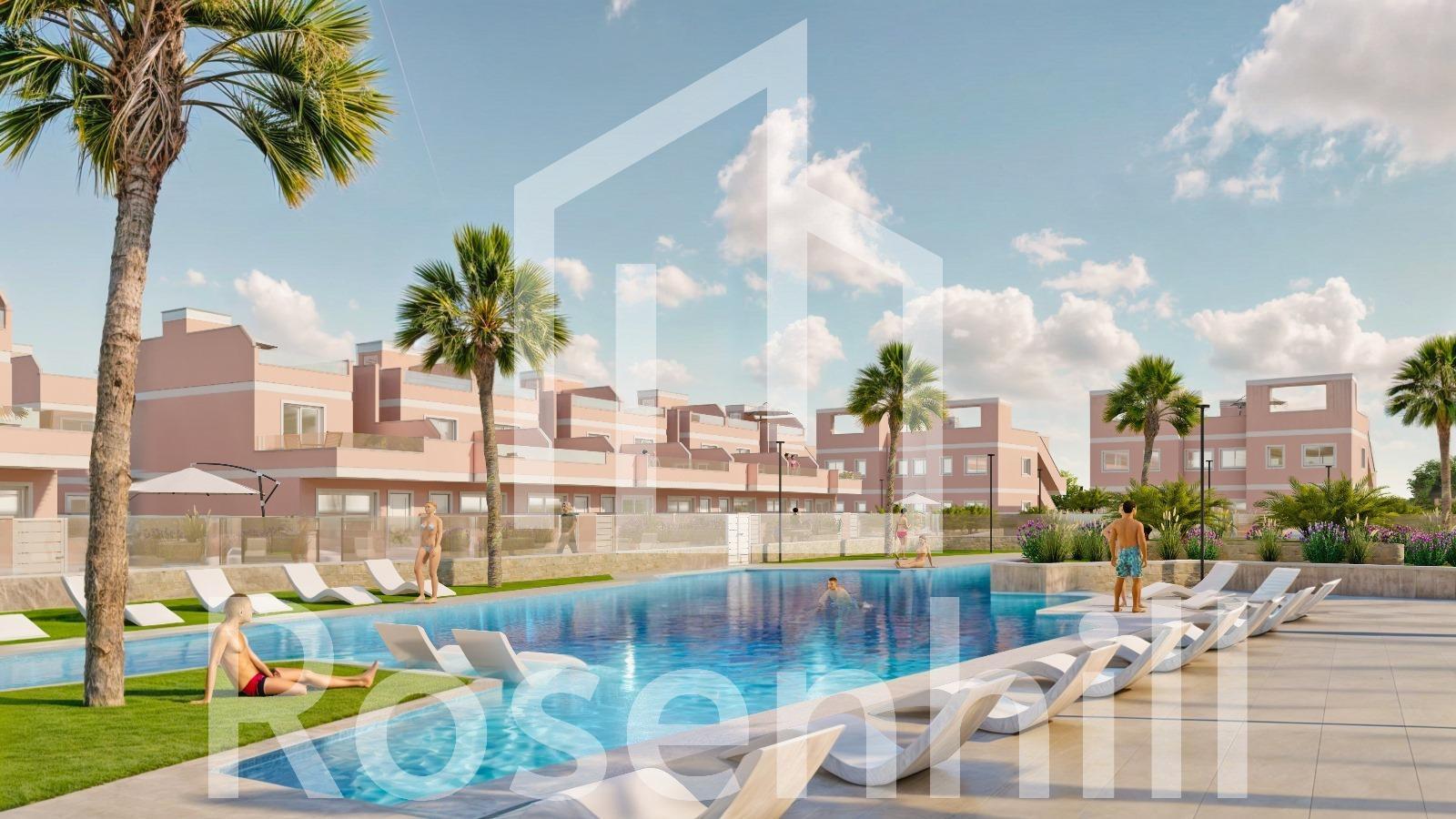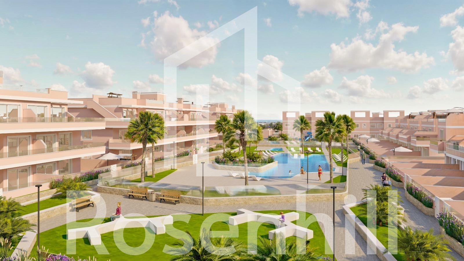 Exclusive New Development in Pilar de la Horadada, Costa Blanca, Spain Modern Homes Close to the Sea Discover this new residential complex in Pilar de la Horadada, a privileged location on the Costa Blanca. Only 2 km from the beach, this project offers a wide variety of 3 bedroom, 2 bathroom properties, with private parking included in the price. The development has spacious communal areas, including a communal swimming pool, landscaped gardens and a children’s play area, ideal for the whole family to enjoy. Different Typologies to suit your Lifestyle This development offers various housing options: Ground floor apartments with private gardens. Middle floor flats with large terraces. Penthouses with private solarium. Ground floor bungalows with private garden. Top floor bungalows with private garden and solarium. Townhouses and semi-detached houses with garden and solarium. All homes have been designed in a modern and functional style, using high quality materials and contemporary finishes. Equipment and Qualities The properties are equipped with: Pre-installation of ducted air conditioning. Exterior aluminium carpentry with thermal break and double glazing. Reinforced access door for greater security. Aerothermal system for efficient hot water production. Built-in wardrobes with LED lighting. Bathroom furniture and screens included. Pilar de la Horadada: A Privileged Place to Live in Pilar de la Horadada is a coastal town at the southern end of the Costa Blanca, with an exceptional climate and an excellent quality of life. Its lively main street offers a wide variety of shops, supermarkets, restaurants and essential services. Just a 5 minute drive away, you will find the stunning beaches of Torre de la Horadada and Mil Palmeras, with golden sand a lovely promenade. In addition, the area has cycle paths, hiking trails and multiple sporting activities. Distances to Key Points Lo Romero Golf Course – 5 km (10 minutes drive). Corvera Airport (Murcia) – 40 km (40 minutes by car). Alicante Airport – 55 km (55 minutes by car). Zenia Boulevard Shopping Centre – 15 km (15 minutes by car). Torre de la Horadada Marina – 3 km (5 minutes by car). Request More Information Today Don’t miss this opportunity to purchase a brand new property in one of the best areas of the Costa Blanca. Contact us now for more details and to arrange a viewing.