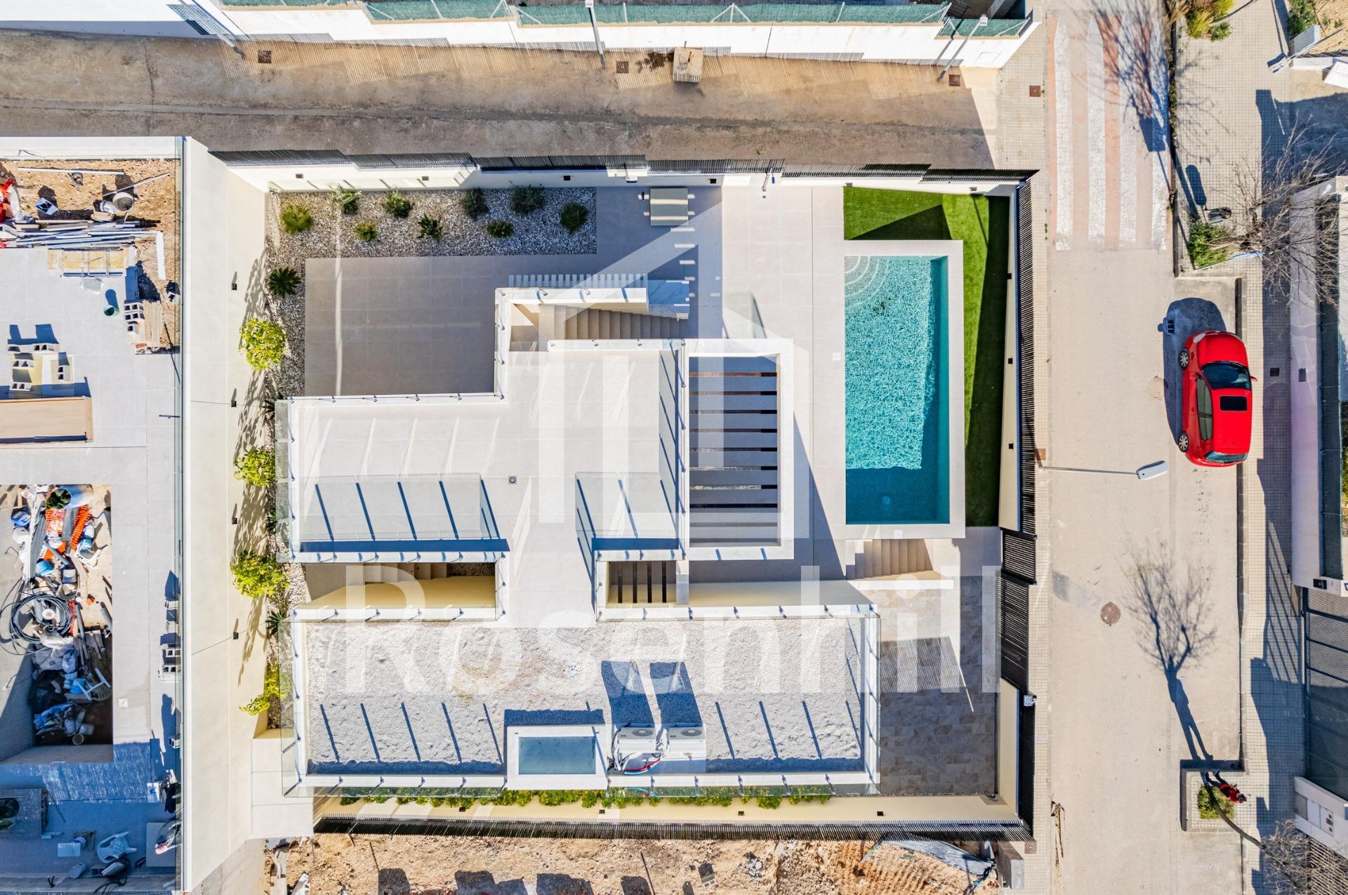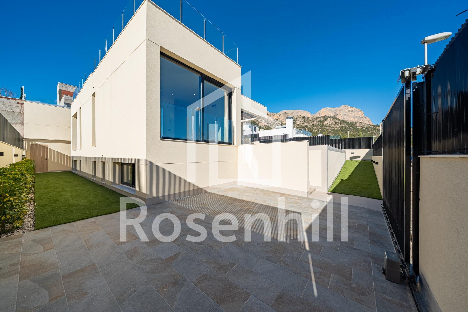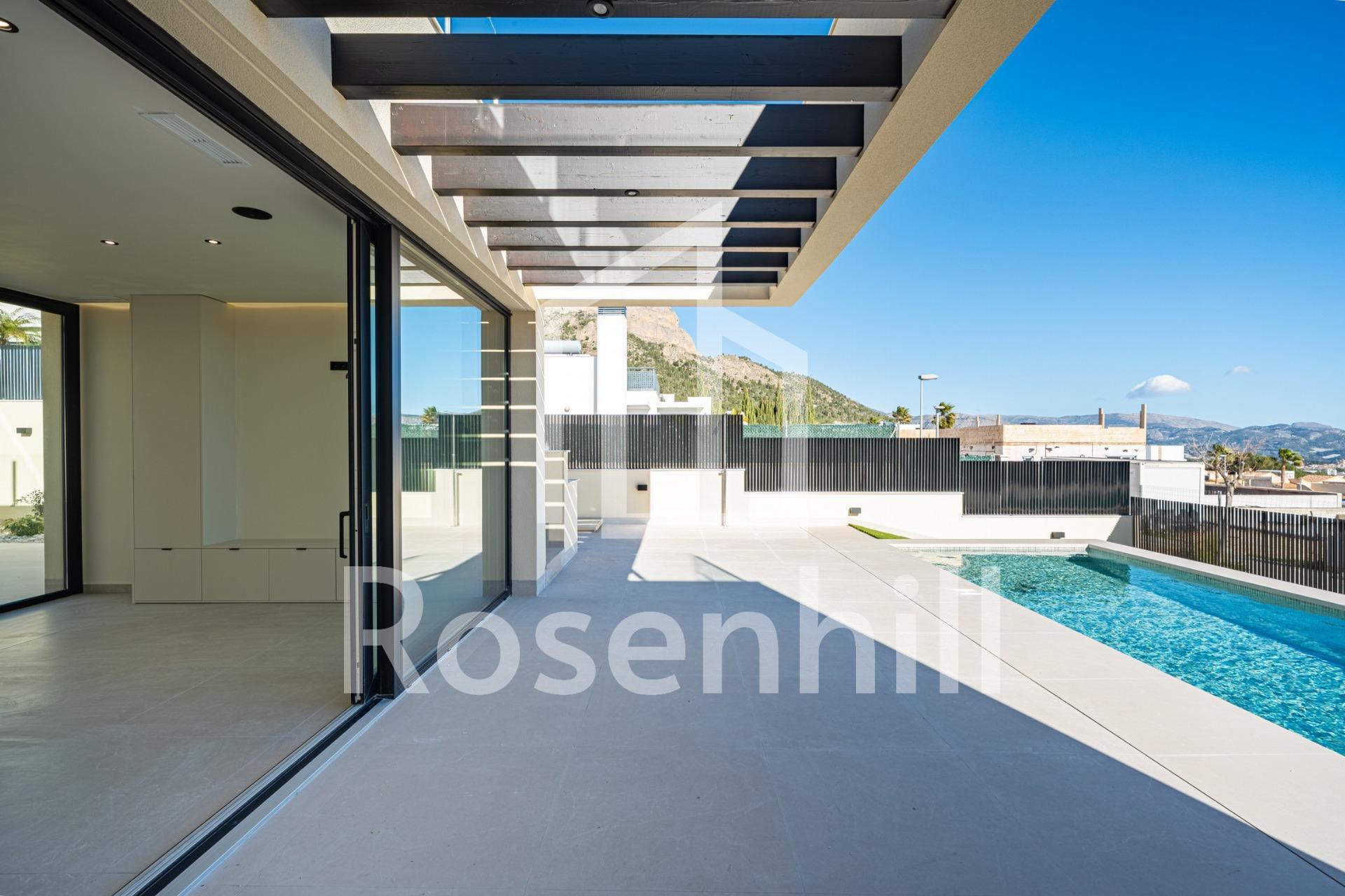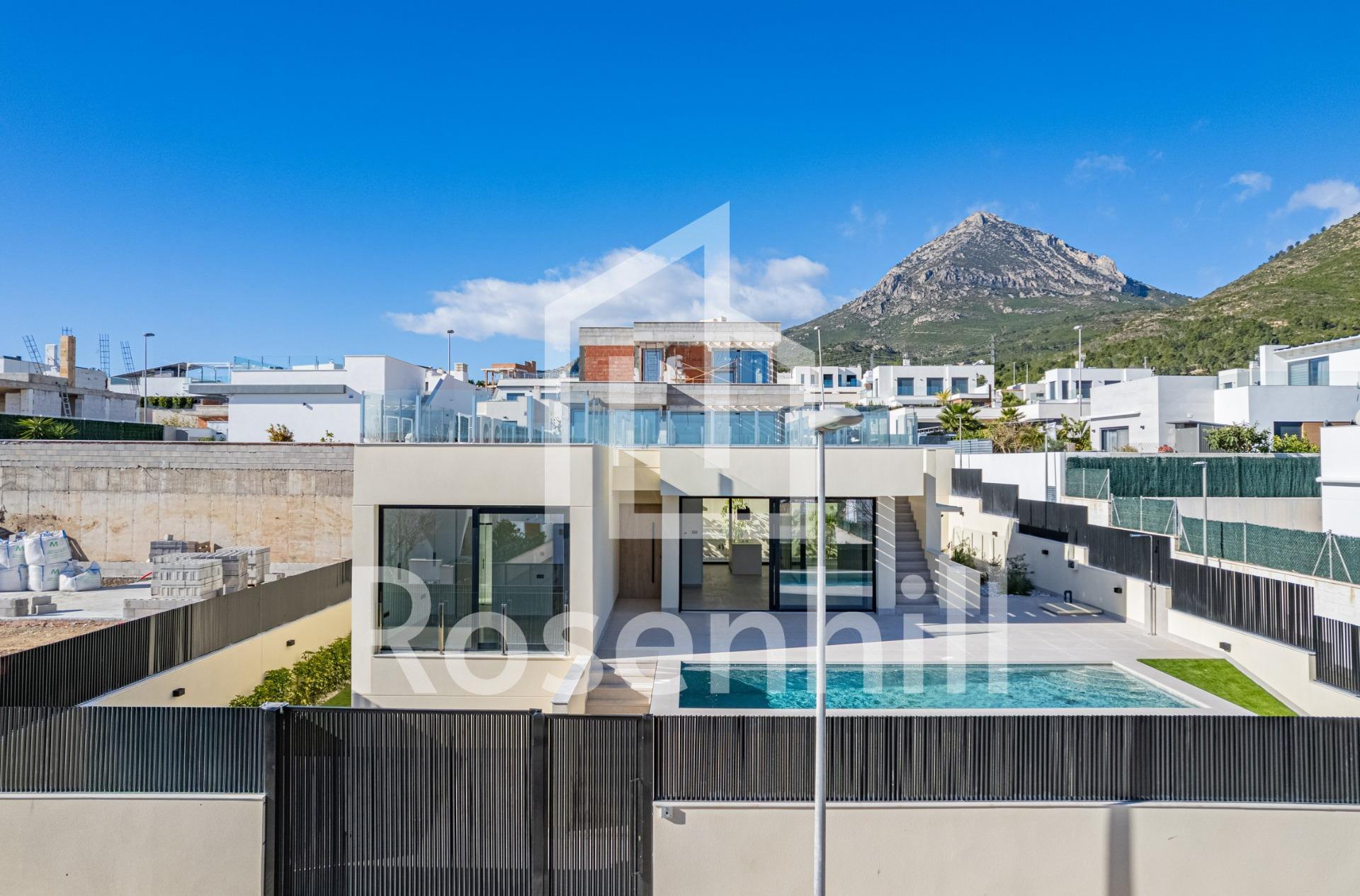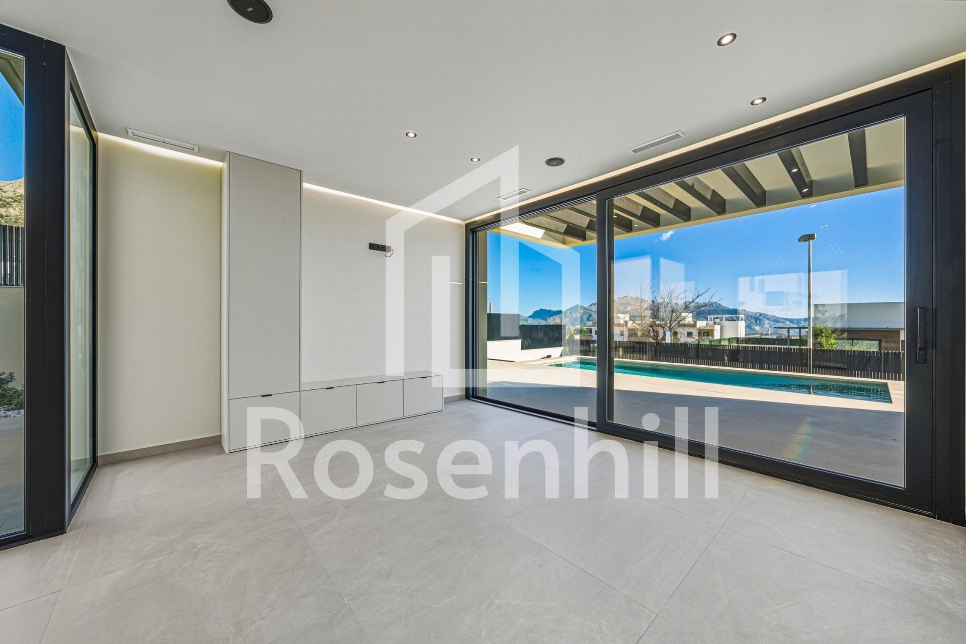 Key Ready New Build Villa with Sea Views in La Alberca Polop Luxury Modern Villa in a Natural Mountain Setting This key ready contemporary villa is located in La Alberca, a quiet residential area of Polop, surrounded by forest and mountains. Positioned in an elevated setting, the property enjoys panoramic views of the Mediterranean Sea, the mountains and the historic town center of Polop. The villa offers privacy, tranquility and excellent connections to the coast and nearby towns. Polop is a charming village in the Marina Baixa region of the Costa Blanca, known for its traditional character and natural surroundings. The property is close to all services in La Nucia, including shops, restaurants, sports centers and schools, while the beaches and vibrant coastal towns are just a short drive away. Spacious Layout Across Main Floor Basement and Solarium The villa is distributed over a main floor, basement and rooftop solarium, offering generous living space and flexibility. On the main floor, a welcoming entrance hall with built in wardrobe leads to two en suite bedrooms, including a master suite with elevable window doors opening to a Juliette balcony and terrace. The open plan living and dining area connects seamlessly to a covered pergola terrace and a private saltwater swimming pool. The basement level features two additional en suite bedrooms with large windows, a flexible playroom or cinema room with water and electricity connections for a bar area, a fully equipped laundry room with Haier appliances and two technical storage rooms. The rooftop solarium provides expansive outdoor space with panoramic sea views and is prepared for future solar panel installation. An outdoor kitchen, multiple storage lockers and Mediterranean style landscaped garden with automatic irrigation complete the exterior. High End Features and Energy Efficiency This villa stands out for its premium finishes and advanced installations, including: Central kitchen island with integrated BOSCH appliances Natural stone countertops indoors and outdoors Underfloor heating pre installation Mitsubishi aerothermal air conditioning system Energy efficiency rating Class A Pre installation for smart home system Saltwater swimming pool with optional heating Private parking for two vehicles Large windows with sun protection glass maximize natural light while ensuring comfort and security. Excellent Location and Distances Polop center 2 km La Nucia 4 km Benidorm 12 km Altea 10 km Beaches 10 km Villaitana Golf 14 km Alicante Airport 65 km Secure Your Dream Home in Polop This exceptional key ready villa combines privacy, design and panoramic views in one of the most attractive inland areas of the Costa Blanca. Contact us today to arrange a private viewing and make this luxury villa in La Alberca Polop your new home.