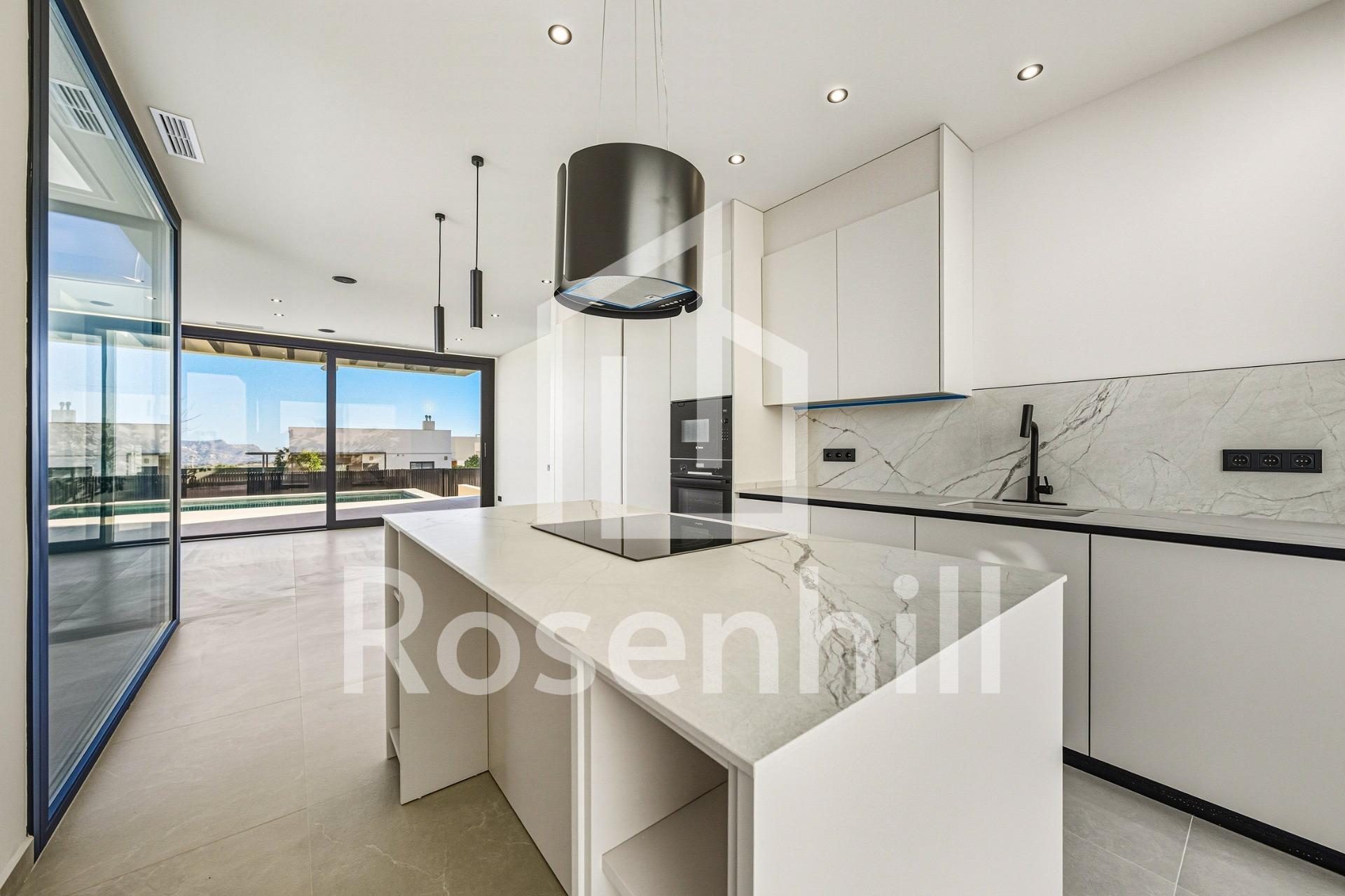 Key Ready New Build Villa with Sea Views in La Alberca Polop Luxury Modern Villa in a Natural Mountain Setting This key ready contemporary villa is located in La Alberca, a quiet residential area of Polop, surrounded by forest and mountains. Positioned in an elevated setting, the property enjoys panoramic views of the Mediterranean Sea, the mountains and the historic town center of Polop. The villa offers privacy, tranquility and excellent connections to the coast and nearby towns. Polop is a charming village in the Marina Baixa region of the Costa Blanca, known for its traditional character and natural surroundings. The property is close to all services in La Nucia, including shops, restaurants, sports centers and schools, while the beaches and vibrant coastal towns are just a short drive away. Spacious Layout Across Main Floor Basement and Solarium The villa is distributed over a main floor, basement and rooftop solarium, offering generous living space and flexibility. On the main floor, a welcoming entrance hall with built in wardrobe leads to two en suite bedrooms, including a master suite with elevable window doors opening to a Juliette balcony and terrace. The open plan living and dining area connects seamlessly to a covered pergola terrace and a private saltwater swimming pool. The basement level features two additional en suite bedrooms with large windows, a flexible playroom or cinema room with water and electricity connections for a bar area, a fully equipped laundry room with Haier appliances and two technical storage rooms. The rooftop solarium provides expansive outdoor space with panoramic sea views and is prepared for future solar panel installation. An outdoor kitchen, multiple storage lockers and Mediterranean style landscaped garden with automatic irrigation complete the exterior. High End Features and Energy Efficiency This villa stands out for its premium finishes and advanced installations, including: Central kitchen island with integrated BOSCH appliances Natural stone countertops indoors and outdoors Underfloor heating pre installation Mitsubishi aerothermal air conditioning system Energy efficiency rating Class A Pre installation for smart home system Saltwater swimming pool with optional heating Private parking for two vehicles Large windows with sun protection glass maximize natural light while ensuring comfort and security. Excellent Location and Distances Polop center 2 km La Nucia 4 km Benidorm 12 km Altea 10 km Beaches 10 km Villaitana Golf 14 km Alicante Airport 65 km Secure Your Dream Home in Polop This exceptional key ready villa combines privacy, design and panoramic views in one of the most attractive inland areas of the Costa Blanca. Contact us today to arrange a private viewing and make this luxury villa in La Alberca Polop your new home.