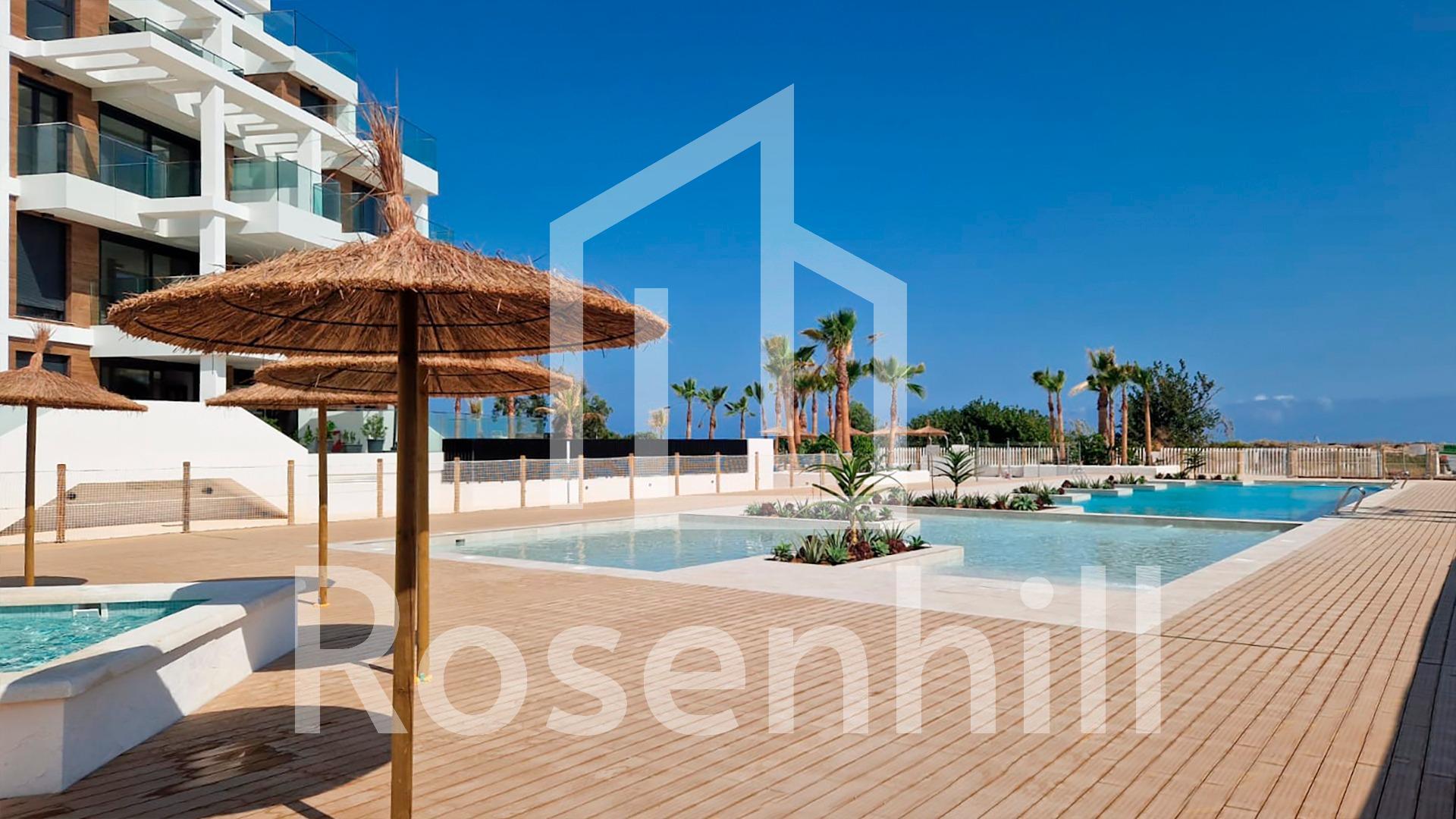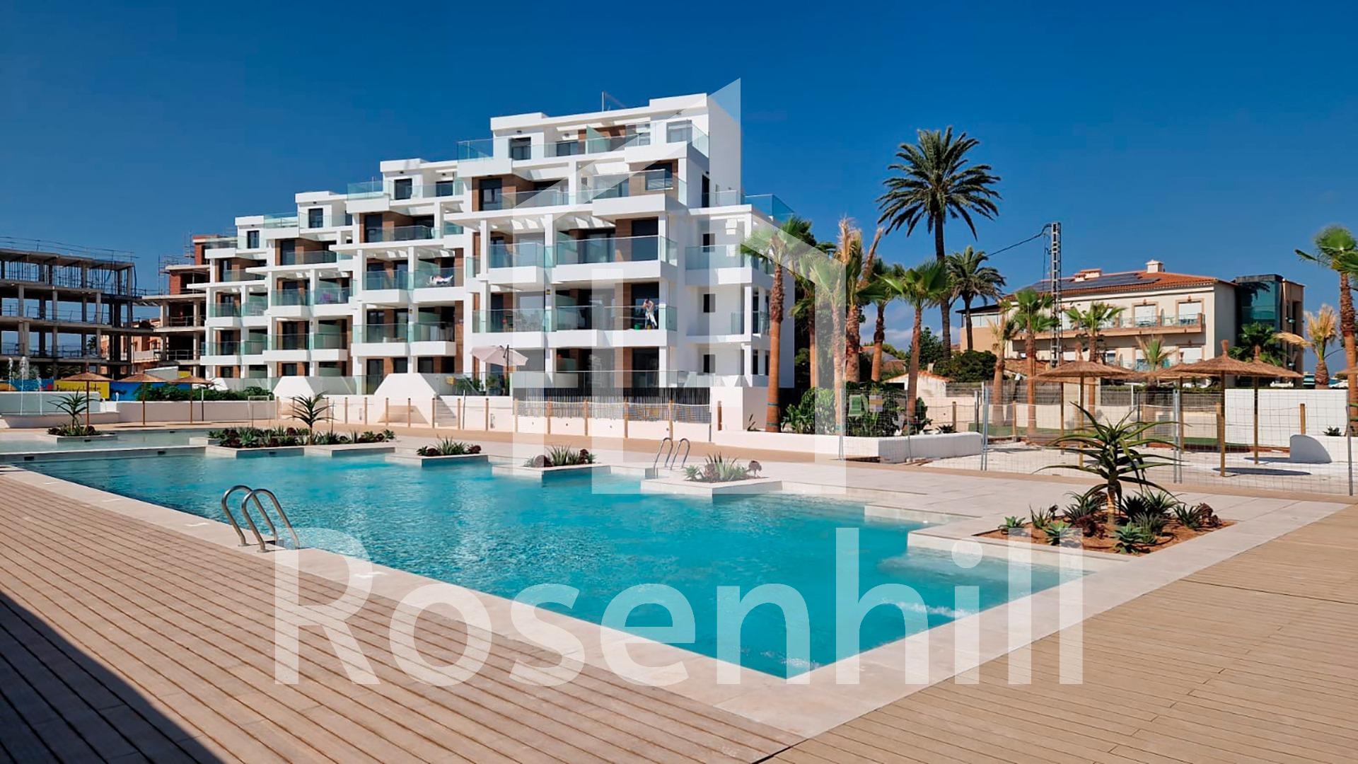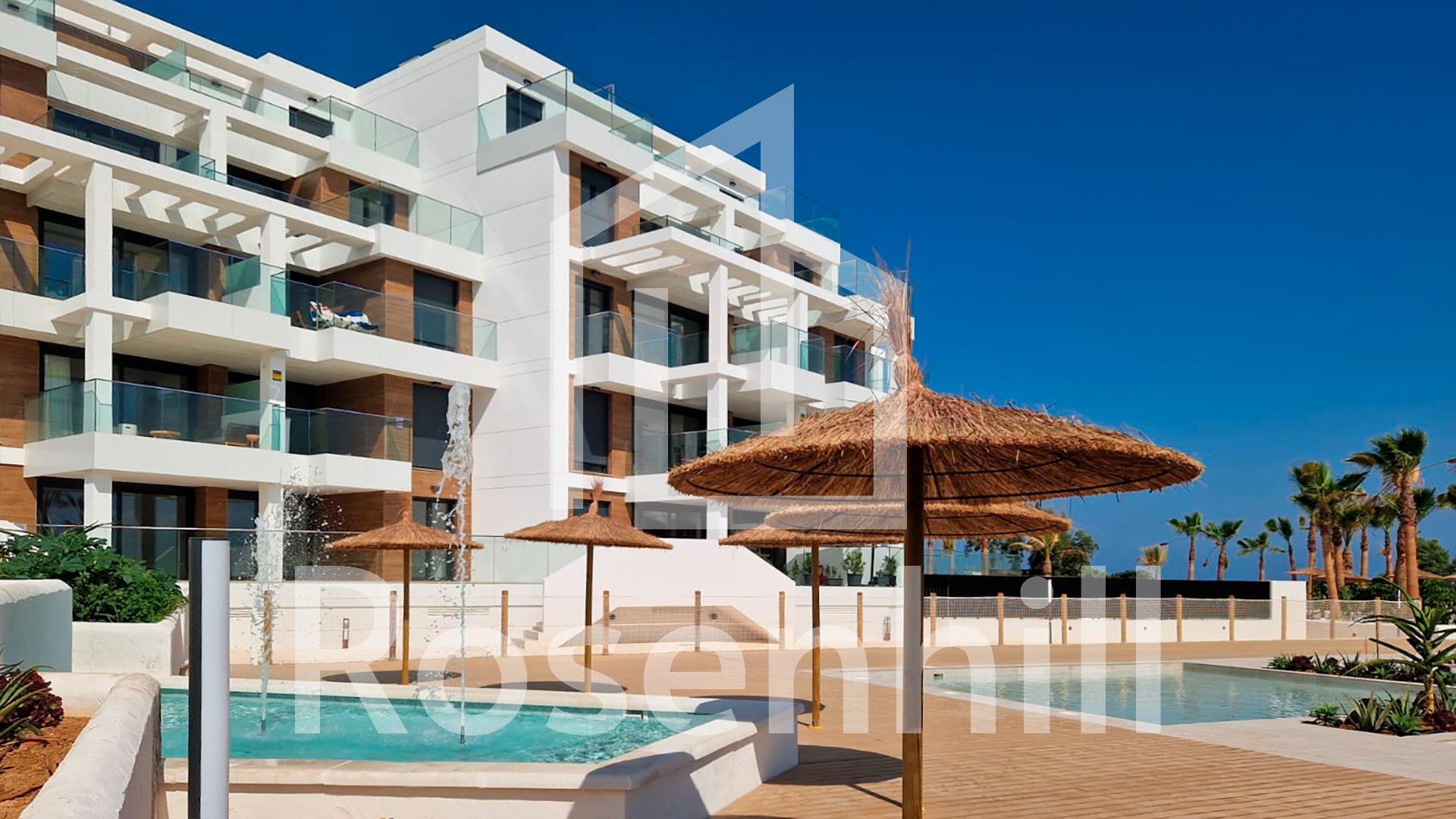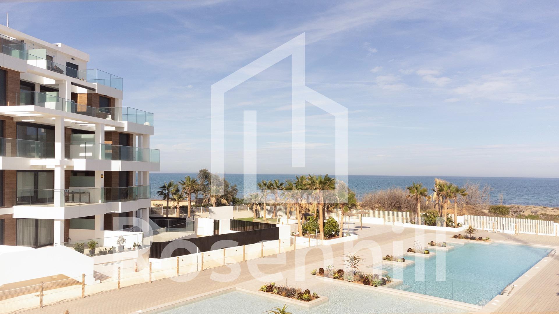MEDITERRANEAN HOUSING A FEW METERS FROM THE SEA Exclusive complex of Mediterranean construction a few meters from the sea. On the beachfront, in front of L´Estanyo beach (7 km from the town center). Apartments and penthouses with two and three bedrooms, all with sea views. Magnificent common areas with a large garden area and two swimming pools, one for children. In an unbeatable location, in the area known as L´Estanyo that gives its name to its beach, with calm waters, an extensive area of golden sand surrounded by all facilities and services, as well as leisure and restaurant venues.
