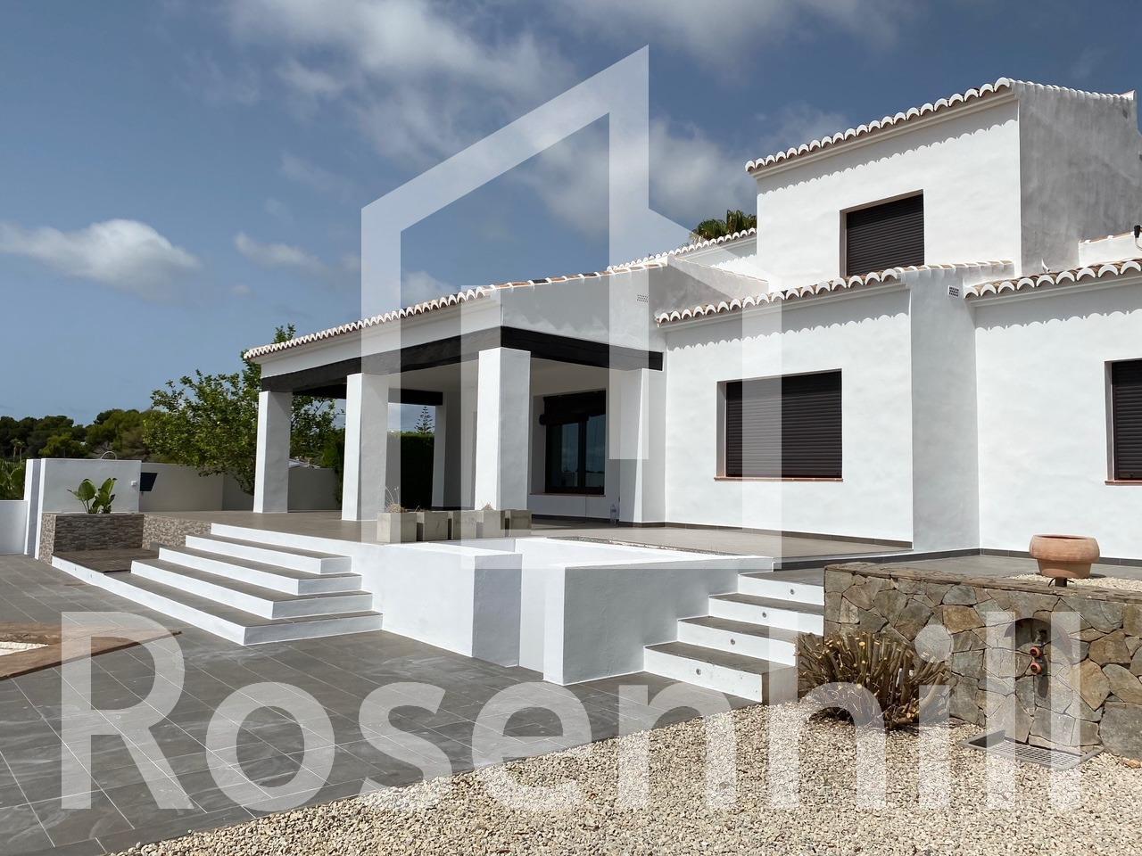 Mediterranean Style Villa with Sea Views for Sale in Moraira, Costa Blanca Elegant Villa with Panoramic Sea Views This beautiful Mediterranean-style villa for sale in Moraira (Costa Blanca, Alicante) offers breathtaking open views of Cape Moraira, the sea and the surrounding coastline. Set on a hilltop, the property enjoys total privacy and tranquility while remaining just 2 km from the vibrant center of Moraira, its golden beaches, supermarkets, restaurants and cafés. Built on a nearly flat plot of 897 m2, the villa provides exceptional comfort, beautiful outdoor spaces and stunning views from all main rooms. Spacious Layout Over Two Floors The villa is distributed over two levels designed to maximize natural light and sea views. On the ground floor, there is a bright living-dining room with a fireplace, a space ready for the installation of a modern kitchen and laundry area (pre-installed plumbing and electricity), and a complete bathroom with a shower. This floor also features a connected yet independent guest apartment with its own entrance, consisting of a living-dining area that could serve as a master suite, a bedroom, a bathroom and an additional space pre-fitted for a dressing room or en-suite bath. The apartment’s entrance showcases a beautifully restored solid wood door, adding authentic Mediterranean charm. On the upper floor, accessed by internal stairs, you will find two comfortable bedrooms, a bathroom and a large solarium terrace with spectacular sea views—perfect for relaxing or enjoying the sunset. Outdoor Living and Mediterranean Charm The villa’s exterior is designed for enjoying the Mediterranean lifestyle to the fullest, featuring spacious terraces, a uniquely shaped private pool with an outdoor shower and an easy-to-maintain garden with automatic irrigation. There is ample space for outdoor dining, sunbathing and entertaining family and friends. High Quality Features and Finishes This property offers modern comfort combined with Mediterranean character, including Aluminum carpentry with wood effect finish and double glazing Motorized blinds and mosquito nets in bedrooms Built-in wardrobes with sliding doors Central heating by radiators Adjustable interior lighting Motorized sliding vehicle gate and pedestrian access Private parking within the plot Prime Location Near Key Amenities Moraira town center and beaches: 2 km La Sella Golf Course: 15 km Port of Moraira: 2 km Shopping centers: 5 km Alicante International Airport: 90 km Experience Mediterranean Living at Its Best This exceptional villa combines privacy, elegance and stunning sea views in one of Costa Blanca’s most desirable locations. Contact us today to arrange a viewing or to request more information about this beautiful home in Moraira.