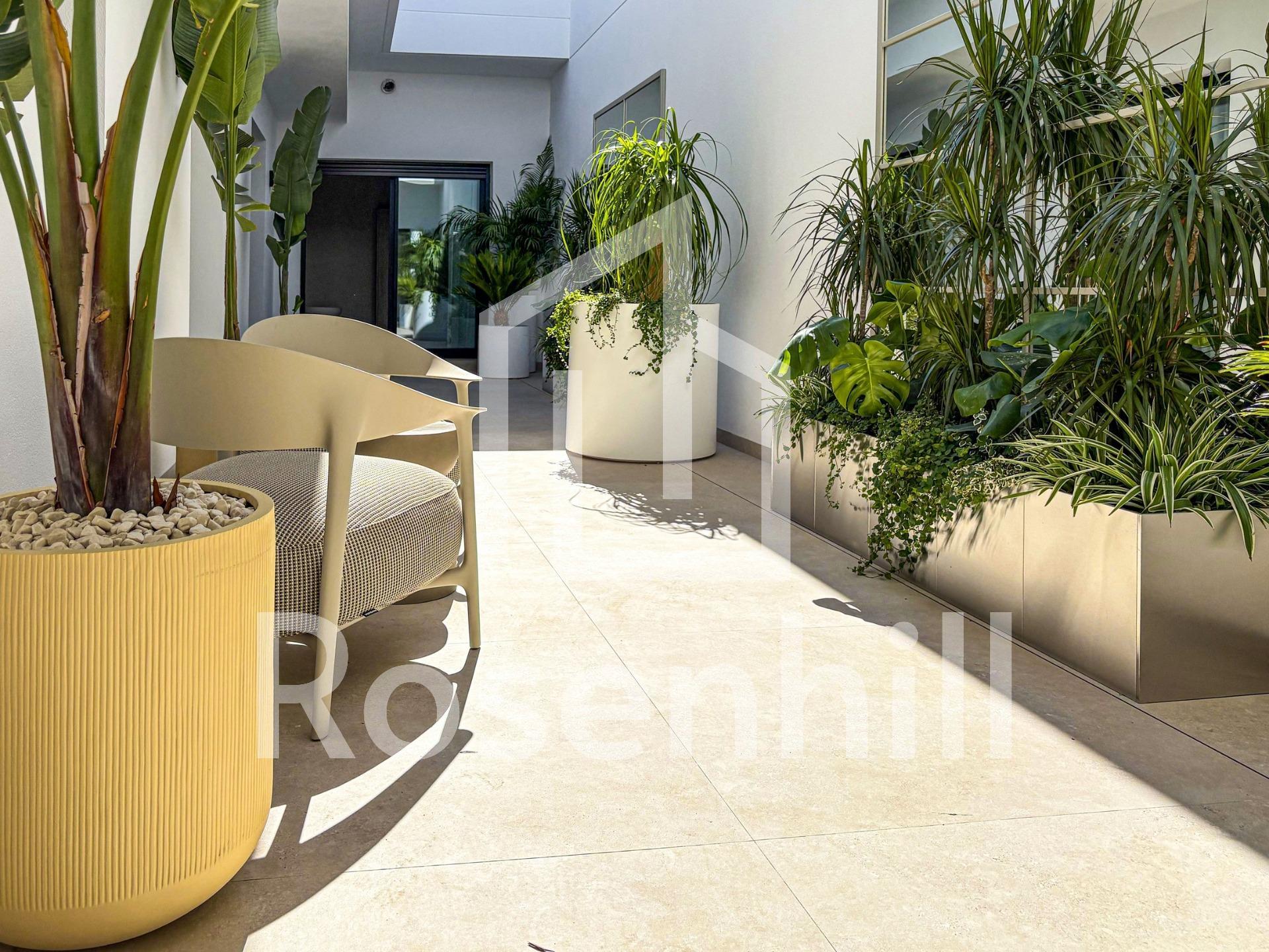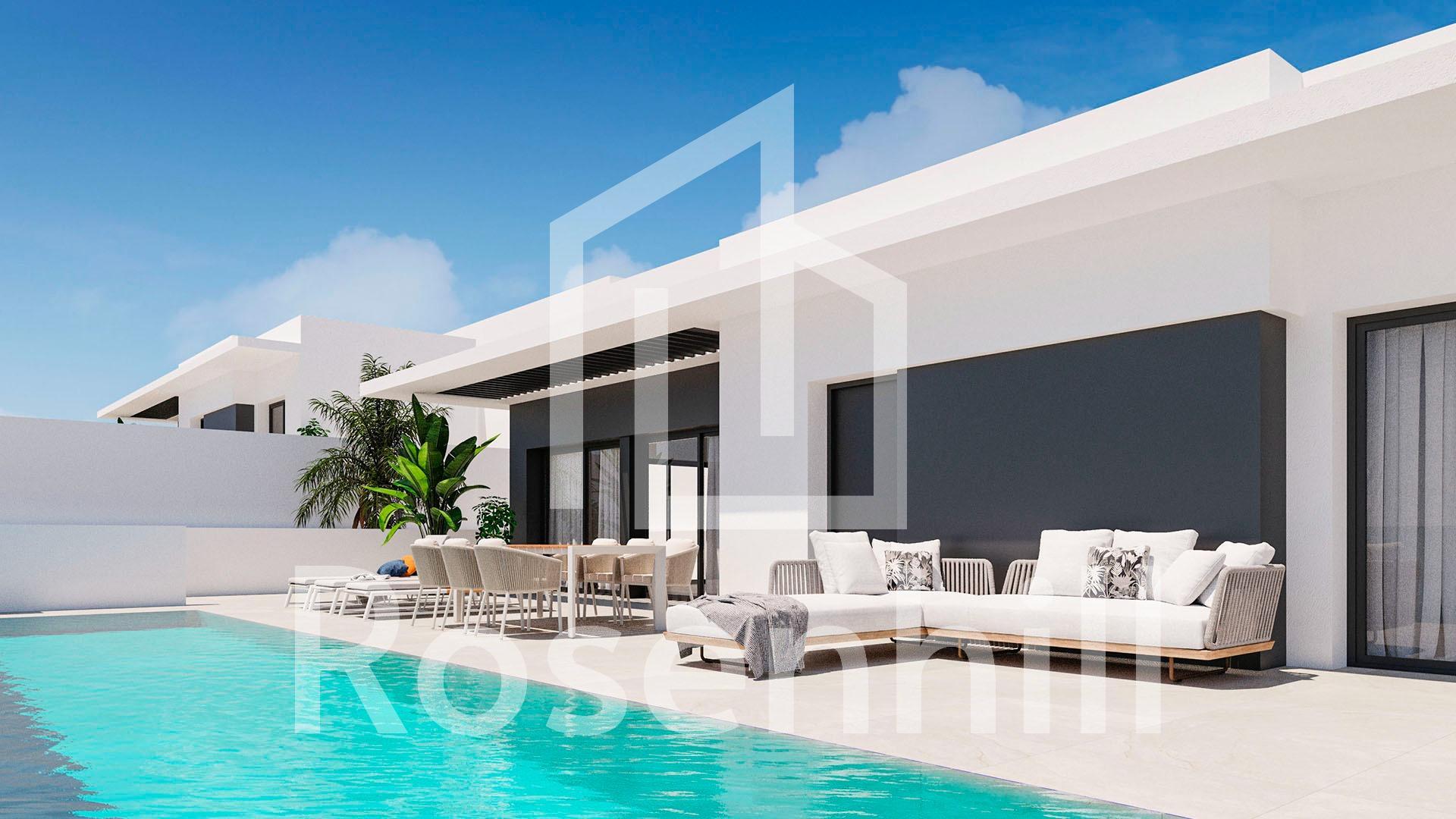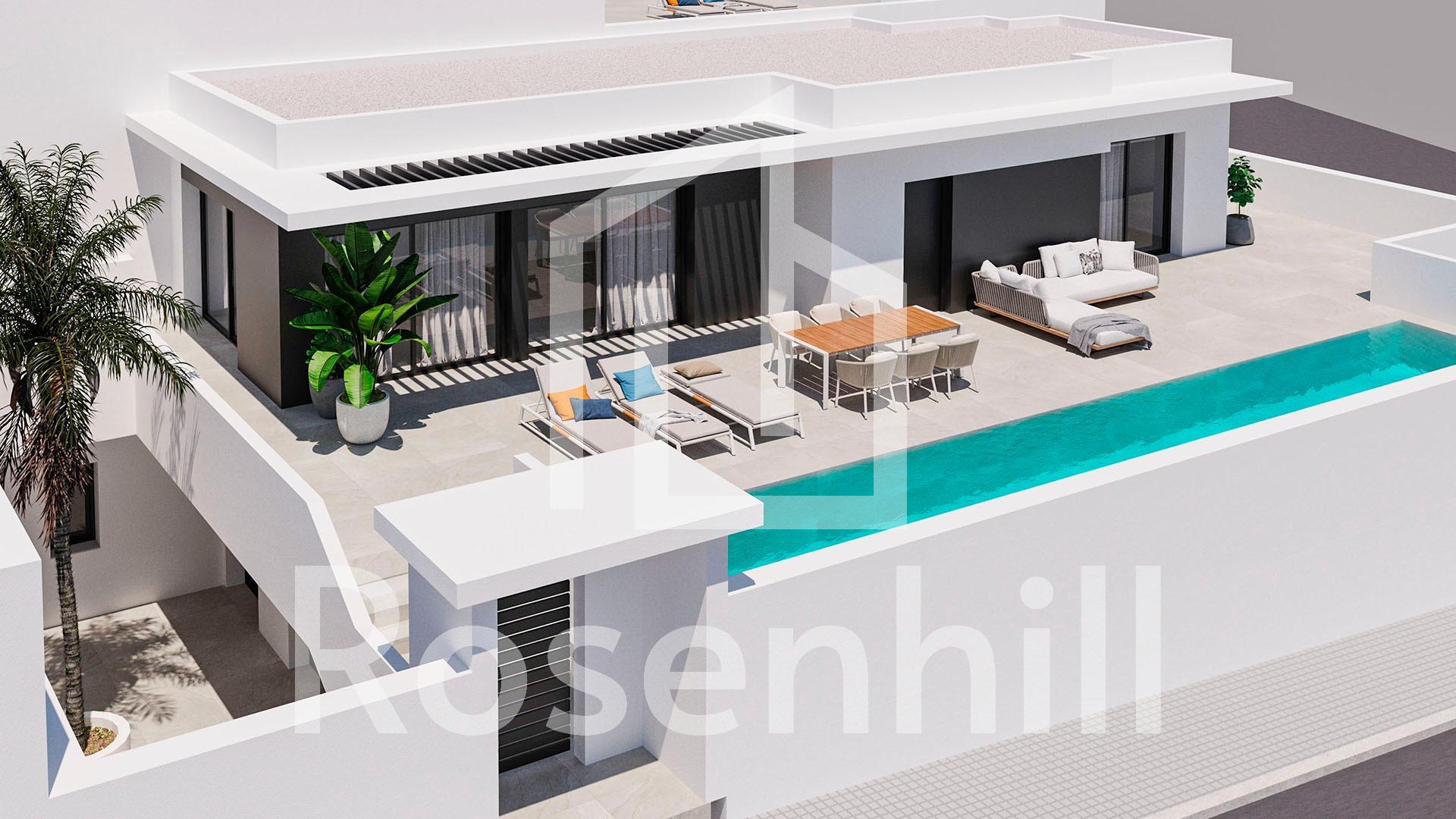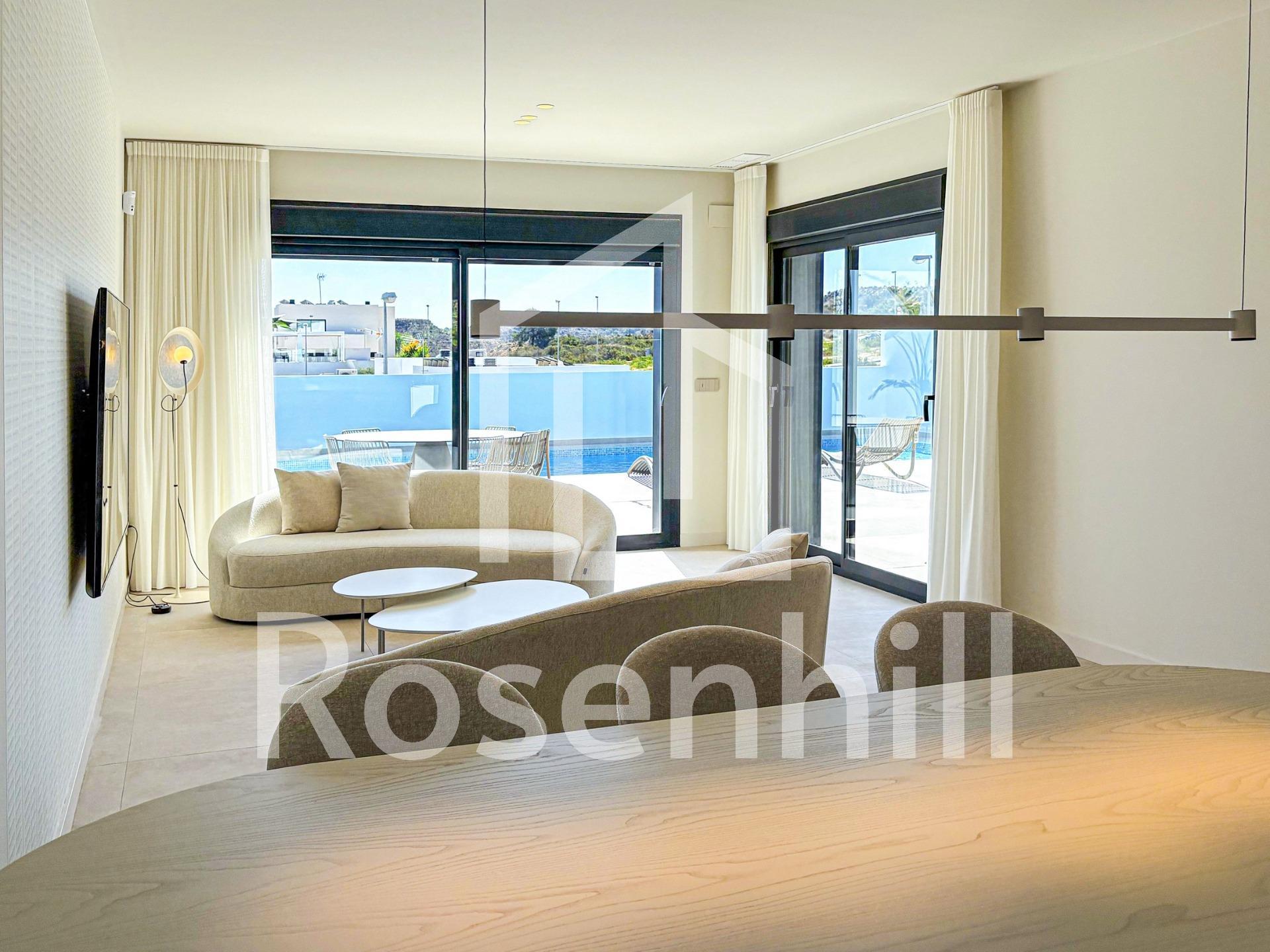 Modern Luxury Villa with Mountain Views in Ciudad Quesada, Costa Blanca Contemporary Design and Exceptional Comfort Discover this elegant new-build villa in Ciudad Quesada, one of the most sought-after residential areas on the Costa Blanca. Set on a 300 m² plot with a beautifully landscaped garden and a private 3×12 m swimming pool, this villa offers the perfect blend of modern architecture, natural beauty, and Mediterranean comfort. The property boasts 265 m² of interior space distributed over two levels, designed to maximize light, space, and functionality. Large windows flood the living areas with natural sunlight while offering breathtaking views of the mountains and surrounding nature. Spacious Layout with Flexible Living Options The villa features 4 bedrooms, with the possibility to create a 5th bedroom or an additional lounge area, adapting perfectly to your lifestyle. On the main floor, you will find an open-plan living and dining area connected to a modern fully equipped kitchen with high-end appliances, creating a seamless flow to the terrace and pool area; ideal for entertaining or relaxing outdoors. On the lower level (underbuild), the remaining bedrooms provide a cool and peaceful atmosphere, with direct access to the garden. The property also includes a closed garage, laundry area, and high-quality finishes throughout. High-End Finishes and Sustainable Features Every detail of this villa has been carefully designed for comfort and efficiency. It includes: Fully furnished kitchen with integrated appliances Bathrooms with furniture, shower screens, and electric towel heaters Air conditioning by ducts (fully installed) Photovoltaic solar panels for energy savings Electric shutters in living room and bedrooms Armoured entrance door for maximum security Prime Location in Ciudad Quesada Nestled in an exclusive and quiet area, this villa enjoys an unbeatable location close to everything. La Marquesa Golf Course is just 1 km away, offering a haven for golf lovers. The Blue Flag beaches of Guardamar del Segura are only 6 km away, while Torrevieja and Orihuela Costa can be reached in under 15 minutes. Alicante International Airport is approximately 40 km (35 minutes), ensuring excellent connectivity. Experience the Mediterranean Lifestyle Surrounded by orange groves, sports clubs, restaurants, and all essential services, Ciudad Quesada offers a vibrant yet peaceful environment. It’s the ideal setting for those seeking a luxury home in the sun; perfect as a permanent residence, vacation retreat, or investment property. Contact us today to schedule a visit and experience the best of Mediterranean living in your new home in Ciudad Quesada.
