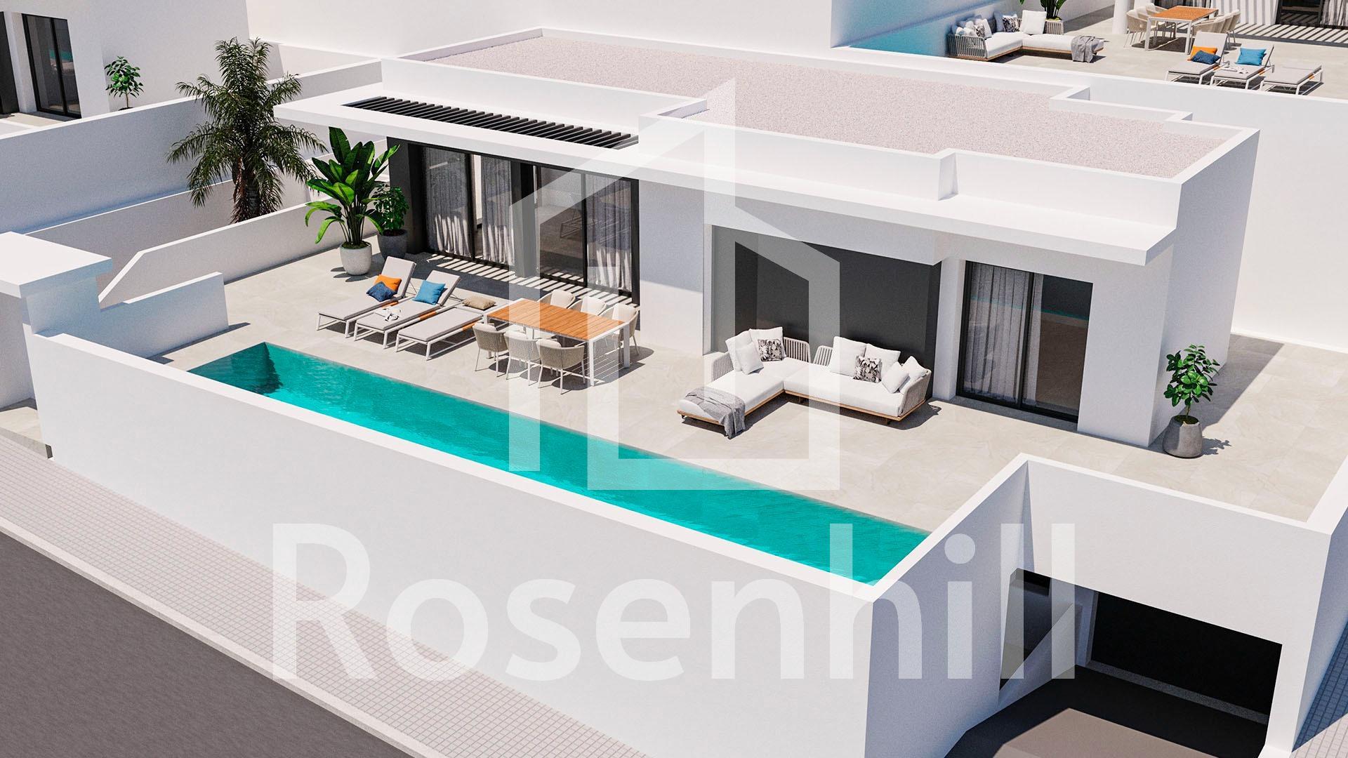 Modern Luxury Villa with Mountain Views in Ciudad Quesada, Costa Blanca Contemporary Design and Exceptional Comfort Discover this elegant new-build villa in Ciudad Quesada, one of the most sought-after residential areas on the Costa Blanca. Set on a 300 m² plot with a beautifully landscaped garden and a private 3×12 m swimming pool, this villa offers the perfect blend of modern architecture, natural beauty, and Mediterranean comfort. The property boasts 265 m² of interior space distributed over two levels, designed to maximize light, space, and functionality. Large windows flood the living areas with natural sunlight while offering breathtaking views of the mountains and surrounding nature. Spacious Layout with Flexible Living Options The villa features 4 bedrooms, with the possibility to create a 5th bedroom or an additional lounge area, adapting perfectly to your lifestyle. On the main floor, you will find an open-plan living and dining area connected to a modern fully equipped kitchen with high-end appliances, creating a seamless flow to the terrace and pool area; ideal for entertaining or relaxing outdoors. On the lower level (underbuild), the remaining bedrooms provide a cool and peaceful atmosphere, with direct access to the garden. The property also includes a closed garage, laundry area, and high-quality finishes throughout. High-End Finishes and Sustainable Features Every detail of this villa has been carefully designed for comfort and efficiency. It includes: Fully furnished kitchen with integrated appliances Bathrooms with furniture, shower screens, and electric towel heaters Air conditioning by ducts (fully installed) Photovoltaic solar panels for energy savings Electric shutters in living room and bedrooms Armoured entrance door for maximum security Prime Location in Ciudad Quesada Nestled in an exclusive and quiet area, this villa enjoys an unbeatable location close to everything. La Marquesa Golf Course is just 1 km away, offering a haven for golf lovers. The Blue Flag beaches of Guardamar del Segura are only 6 km away, while Torrevieja and Orihuela Costa can be reached in under 15 minutes. Alicante International Airport is approximately 40 km (35 minutes), ensuring excellent connectivity. Experience the Mediterranean Lifestyle Surrounded by orange groves, sports clubs, restaurants, and all essential services, Ciudad Quesada offers a vibrant yet peaceful environment. It’s the ideal setting for those seeking a luxury home in the sun; perfect as a permanent residence, vacation retreat, or investment property. Contact us today to schedule a visit and experience the best of Mediterranean living in your new home in Ciudad Quesada.