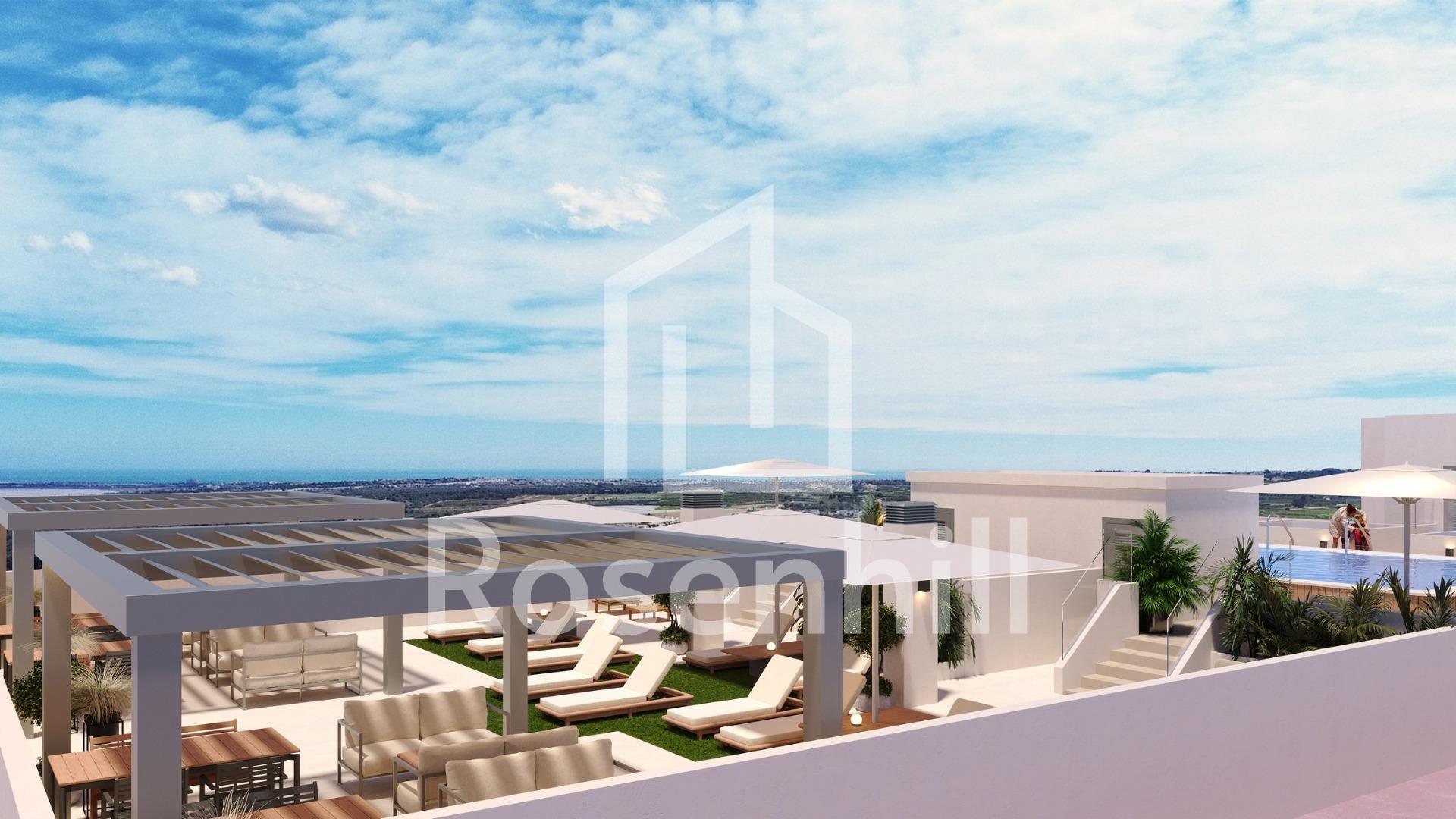 Modern New Build Apartments in the Center of San Miguel de Salinas Contemporary Living in a Healthy Mediterranean Environment Located in the charming town of San Miguel de Salinas, just 10 km from the Mediterranean Sea, this new residential development offers the perfect balance between modern comfort and natural surroundings. The area is well known for its nearby salt lakes and exceptional microclimate, considered one of the healthiest in Europe. This peaceful yet vibrant town allows residents to enjoy the authentic Mediterranean lifestyle while being within walking distance of shops, restaurants, supermarkets and all essential services. San Miguel de Salinas sits slightly inland on the Costa Blanca South, offering open views, fresh air and easy access to beaches, golf courses and shopping areas. Stylish Apartments Designed for Comfort and Efficiency The project consists of two modern buildings separated by a landscaped communal garden area. A total of 56 contemporary apartments are available with 1, 2 or 3 bedrooms, each featuring a private terrace. Every home has been designed with comfort, aesthetics and energy efficiency in mind, using high quality materials and modern insulation systems. Each apartment includes: Armored entrance door Bathrooms with vanity units Pre installation of ducted air conditioning Energy certificate rating A The layout and orientation of the homes ensure natural light throughout the day, creating bright and welcoming interiors ideal for both permanent living and holiday use. Exceptional Communal Areas for Relaxation and Social Life The ground floor communal space is designed as the social heart of the development, surrounded by landscaped gardens, seating areas, bicycle parking and a children’s playground. It is an ideal meeting point for residents of all ages. On the rooftop, an impressive 350 m2 leisure area awaits. This space includes a 70 m2 swimming pool with a separate children’s splash area, pergolas, sun loungers and shaded areas, allowing residents to relax while enjoying panoramic views. The rooftop is easily accessible by one of the three lifts and includes sanitary facilities for added comfort. Excellent Location Close to Key Points of Interest Mediterranean beaches 10 km Zenia Boulevard Shopping Center 9 km Villamartin Golf 6 km Las Colinas Golf 8 km Torrevieja Marina 12 km Alicante Airport 60 km Murcia Corvera Airport 55 km A Smart Investment in Costa Blanca South This residential complex combines modern architecture, quality finishes and a prime central location, making it an excellent choice for living, holiday enjoyment or rental investment. Contact us today for more information or to arrange a visit to these modern apartments in San Miguel de Salinas.