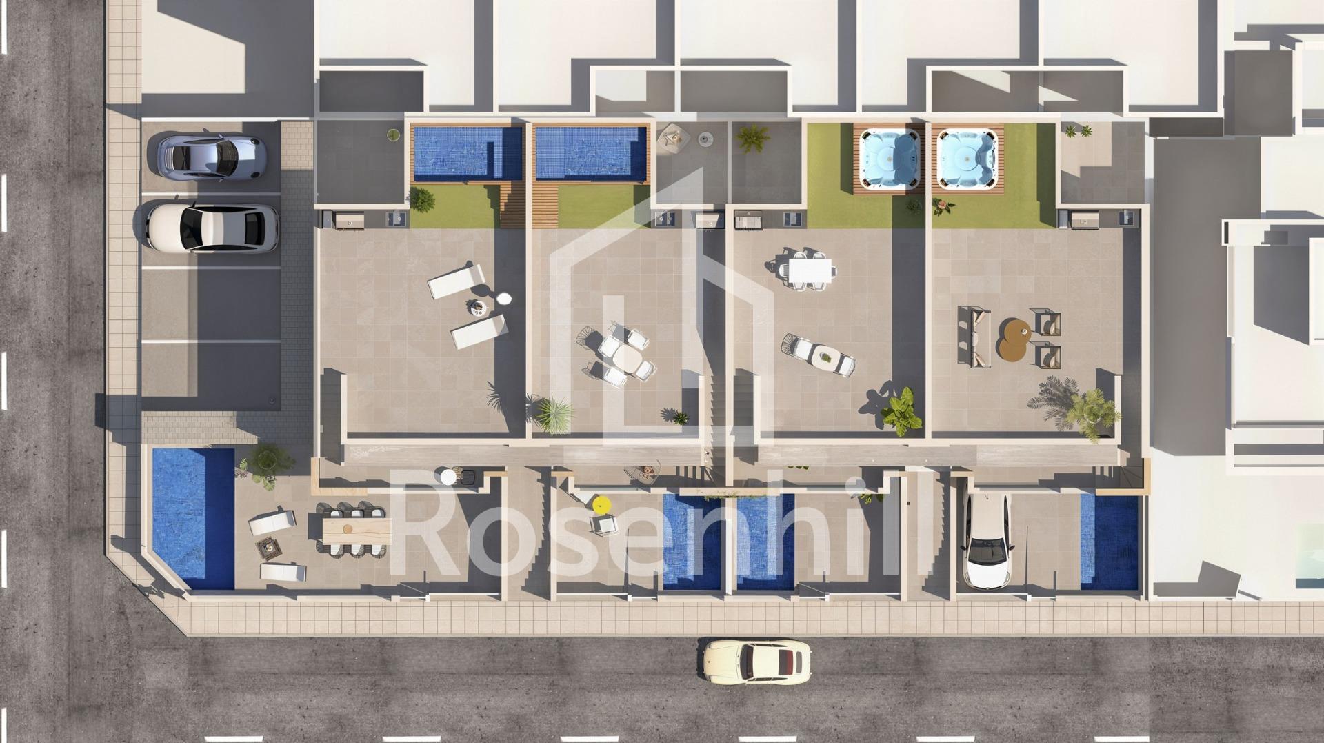 Modern New Build Bungalows for Sale in San Pedro del Pinatar Near the Beach Mediterranean Living in San Pedro del Pinatar Costa Calida Discover an exclusive new development of modern bungalows located in San Pedro del Pinatar, one of the most popular coastal towns on the Costa Calida. Situated in the peaceful residential area of Las Esperanzas, this development offers an ideal combination of comfort, contemporary design and proximity to the sea. San Pedro del Pinatar is well known for its beautiful coastline, natural parks and relaxed Mediterranean lifestyle. The town lies between the calm waters of the Mar Menor and the Mediterranean Sea, offering residents a wide choice of beaches and water sports. The nearby Las Salinas y Arenales de San Pedro del Pinatar Regional Park is a protected natural area famous for its salt lakes, birdlife and scenic walking and cycling routes. This location provides easy access to supermarkets, restaurants, sports facilities and golf courses, while maintaining a peaceful residential atmosphere just minutes from the beach. Exclusive Development of Stylish Bungalows The residential complex consists of only eight carefully designed homes, offering privacy and a boutique style community. The properties feature two bedrooms and two bathrooms, including a master bedroom with ensuite bathroom. Buyers can choose between ground floor bungalows or top floor homes with private solariums. Ground floor properties include a private parking space within the plot and a rear patio. Some units also offer a basement level or a private swimming pool. Top floor bungalows feature a terrace and a spacious private rooftop solarium with a summer kitchen, ideal for outdoor dining and relaxing in the sun. Selected units also include a jacuzzi. These homes also have a private parking space and a storage room on the ground floor. Modern Features and High Quality Finishes Each bungalow has been designed with comfort and energy efficiency in mind, using quality materials and modern installations. Fully equipped kitchen with appliances included Pre installation for ducted air conditioning Motorized shutters and double glazing windows Aluminum exterior carpentry in dark grey finish LED lighting inside and outside the property Security entrance door Water connection on terraces and solariums Private parking space included with every home Some homes offer the additional luxury of a private pool or jacuzzi, providing the perfect setting to enjoy the Mediterranean climate throughout the year. Excellent Location Close to Beaches Golf and Services Mar Menor beaches 1.8 km Dos Mares Shopping Center 3 km Lo Romero Golf 11 km San Pedro Marina 4 km Region de Murcia International Airport 39 km Alicante Elche Airport 78 km The nearby coastal area of Lo Pagan offers a lively promenade with restaurants, cafes and leisure activities, making it a vibrant destination throughout the year. Find Your New Home on the Costa Calida These modern bungalows offer an excellent opportunity to own a stylish new home near the sea, whether as a permanent residence, holiday retreat or investment property. Contact us today to receive more information or arrange a visit to discover your new home in San Pedro del Pinatar.