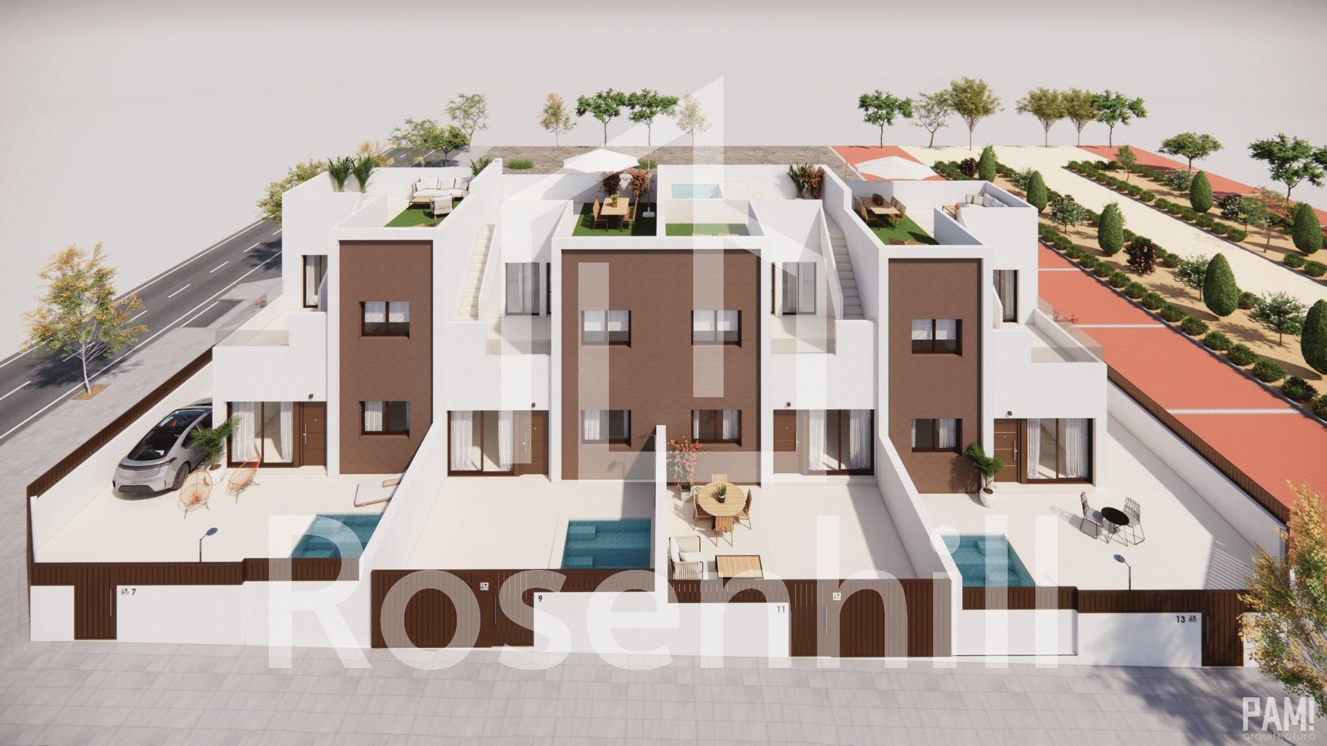 Modern New Build Villas with Optional Private Pool in Pilar de la Horadada Exclusive Development of 4 Contemporary Homes This limited collection of four newly built semi-detached and terraced villas is located in a peaceful area of Pilar de la Horadada, just a few minutes from the town centre and 3 km from the Mediterranean beaches. Designed with a focus on comfort, style and energy efficiency, each home offers spacious living with the option to add a private pool and on-plot parking. Elegant Design and Outdoor Living Each villa includes three bedrooms and two full bathrooms, thoughtfully laid out across a bright and open-plan interior. A private garden and a generous rooftop solarium with pre-installation for an outdoor kitchen provide the perfect spaces to enjoy the Costa Blanca’s year-round sunshine. The optional private pool adds an extra level of comfort for relaxing or entertaining. High-Quality Features and Finishes The homes are equipped with modern materials and finishes to ensure lasting quality and convenience: Armoured front door for added security Exterior carpentry in PVC with thermal break for improved insulation Fully furnished bathrooms with shower screens Underfloor heating in bathrooms for added comfort Aerothermal system for domestic hot water Pre-installed ducted air conditioning throughout Live in Pilar de la Horadada: A Town Full of Charm Pilar de la Horadada is a traditional Spanish town known for its friendly atmosphere and excellent infrastructure. The town offers everything you need for daily living, including supermarkets, restaurants, boutiques, and charming plazas. A short walk brings you to the vibrant centre, where you can enjoy local tapas, cultural events, and weekly markets. Close to Beaches, Golf and Services Torre de la Horadada and Mil Palmeras beaches: 3 km (5 minutes) La Zenia Boulevard shopping centre: 15 km (15 minutes) Lo Romero Golf: 7 km (10 minutes) Corvera Murcia Airport: 40 km (40 minutes) Alicante International Airport: 55 km (55 minutes) Secure Your Costa Blanca Property Now Whether you are looking for a full-time residence, a holiday getaway, or an investment property, these new homes in Pilar de la Horadada offer an unbeatable location, modern features, and Mediterranean lifestyle. Contact us today for more details or to schedule your visit.