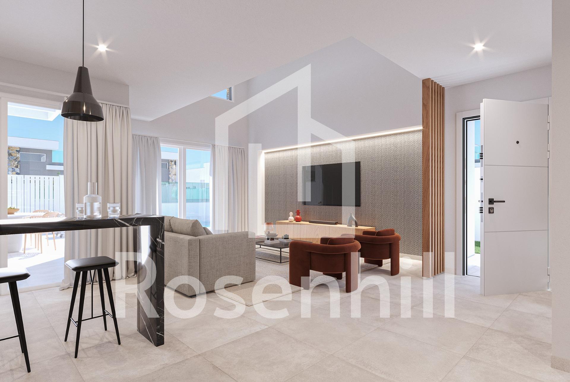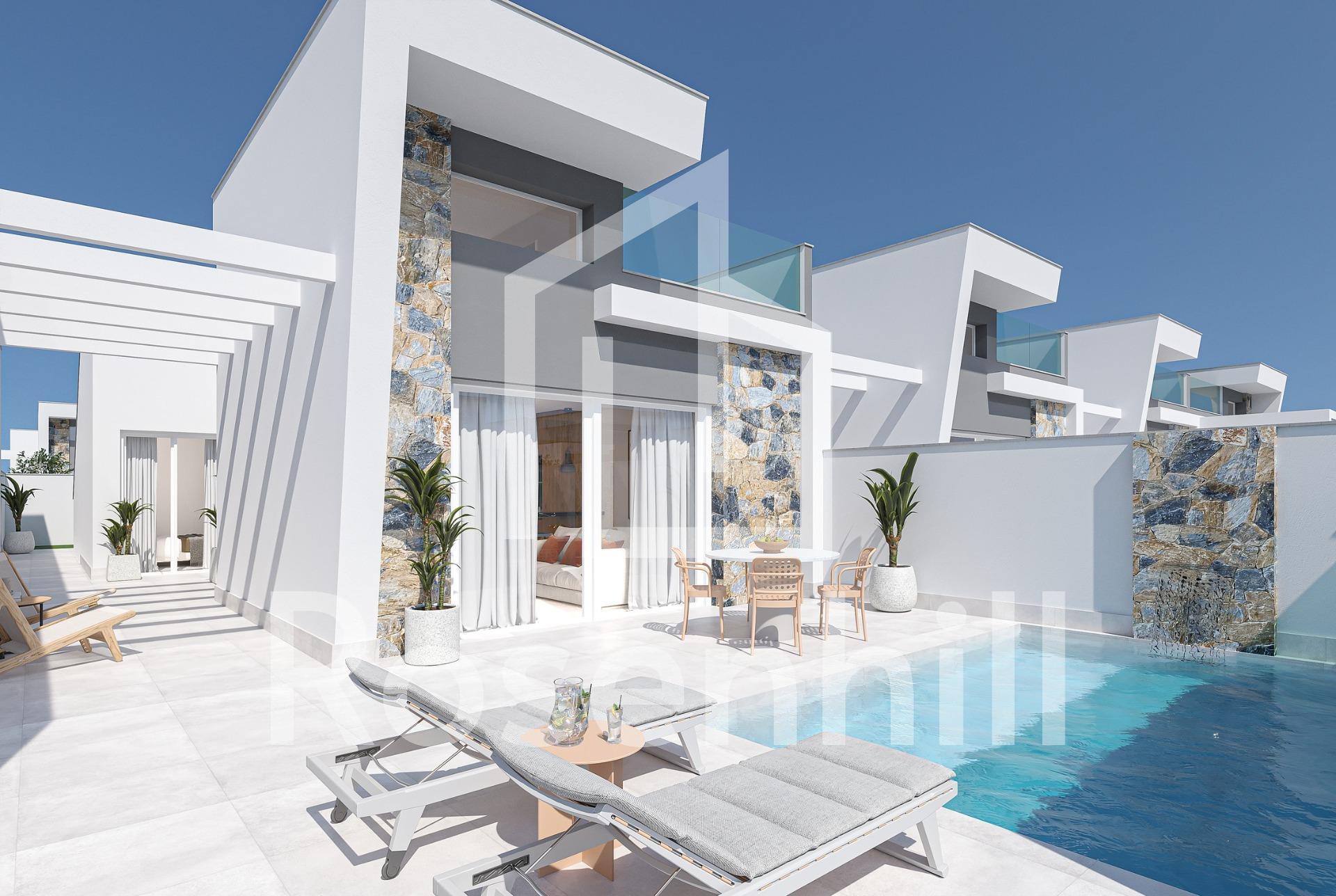 Modern New Construction Villas in Los Alcázares Luxury Living Close to the Beach Discover this exclusive residential development of five single-story villas in the charming town of Los Alcázares. Each villa features a private swimming pool with a cascading waterfall, a spacious solarium for year-round sunshine, and modern interiors designed for comfort and style. With three bedrooms and two bathrooms, these homes are perfect for families, couples, or anyone seeking a luxurious retreat. The kitchens come fully equipped with sleek black appliances, while the double-height ceiling in the living area enhances the sense of space and light. Premium Features for a Comfortable Lifestyle These villas are constructed with high-quality materials and offer thoughtful details that ensure a modern and convenient living experience: White aluminum or PVC exterior carpentry with double-glazed windows for optimal solar protection. Fully equipped bathrooms, including built-in niches in showers, mirrors with lighting, and vanity units. Fitted wardrobes in bedrooms with built-in drawers. High-efficiency water heater for sustainable energy consumption. Air conditioning pre-installation via ductwork in living rooms and bedrooms. Private swimming pool with built-in seating, steps, a waterfall feature, and underwater lighting. Artificial grass and a summer kitchen with a countertop and outlet for a mini-fridge on the solarium. Prime Location in Los Alcázares Located just 1.5 km from the pristine beaches of the Mar Menor, these villas offer the perfect balance of tranquility and convenience. Los Alcázares is renowned for its vibrant coastal lifestyle, water sports, and year-round sunshine. The nearby Serena Golf course is only 2 km away, making it ideal for golf enthusiasts. Accessibility to Key Points of Interest Los Alcázares enjoys excellent connectivity to major cities and attractions: Murcia-Corvera Airport: 30 km (20 minutes by car) Alicante Airport: 90 km (1 hour by car) Cartagena: 25 km Zenia Boulevard Shopping Center: 35 km Serena Golf: 2 km Your Dream Home Awaits Embrace the Mediterranean lifestyle in these exquisite new construction villas in Los Alcázares. Whether you’re looking for a permanent home or a holiday retreat, these properties offer everything you need for a comfortable and luxurious living experience. Contact us today to schedule a viewing or request more information!