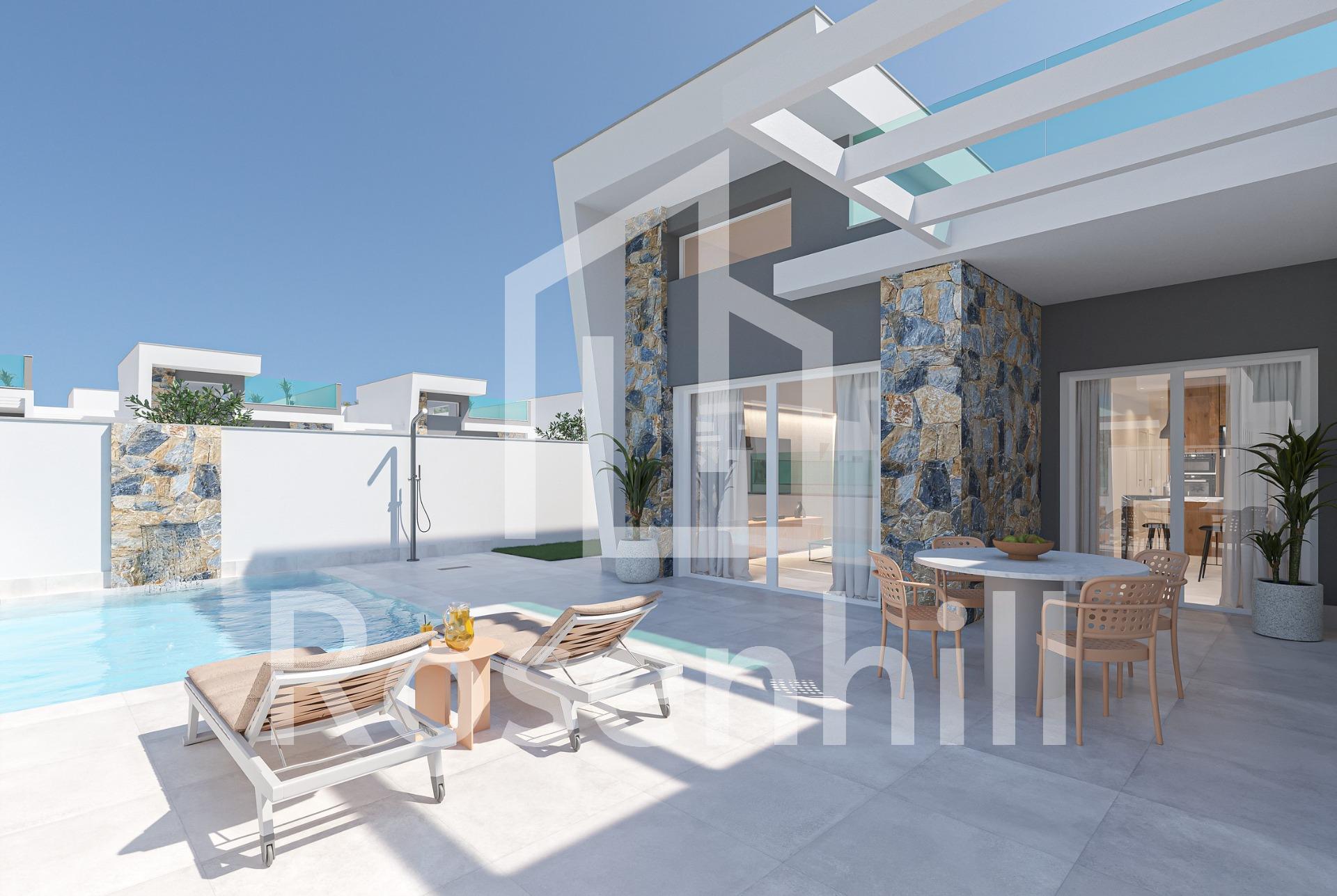 Modern New Construction Villas in Los Alcázares Luxury Living Close to the Beach Discover this exclusive residential development of five single-story villas in the charming town of Los Alcázares. Each villa features a private swimming pool with a cascading waterfall, a spacious solarium for year-round sunshine, and modern interiors designed for comfort and style. With three bedrooms and two bathrooms, these homes are perfect for families, couples, or anyone seeking a luxurious retreat. The kitchens come fully equipped with sleek black appliances, while the double-height ceiling in the living area enhances the sense of space and light. Premium Features for a Comfortable Lifestyle These villas are constructed with high-quality materials and offer thoughtful details that ensure a modern and convenient living experience: White aluminum or PVC exterior carpentry with double-glazed windows for optimal solar protection. Fully equipped bathrooms, including built-in niches in showers, mirrors with lighting, and vanity units. Fitted wardrobes in bedrooms with built-in drawers. High-efficiency water heater for sustainable energy consumption. Air conditioning pre-installation via ductwork in living rooms and bedrooms. Private swimming pool with built-in seating, steps, a waterfall feature, and underwater lighting. Artificial grass and a summer kitchen with a countertop and outlet for a mini-fridge on the solarium. Prime Location in Los Alcázares Located just 1.5 km from the pristine beaches of the Mar Menor, these villas offer the perfect balance of tranquility and convenience. Los Alcázares is renowned for its vibrant coastal lifestyle, water sports, and year-round sunshine. The nearby Serena Golf course is only 2 km away, making it ideal for golf enthusiasts. Accessibility to Key Points of Interest Los Alcázares enjoys excellent connectivity to major cities and attractions: Murcia-Corvera Airport: 30 km (20 minutes by car) Alicante Airport: 90 km (1 hour by car) Cartagena: 25 km Zenia Boulevard Shopping Center: 35 km Serena Golf: 2 km Your Dream Home Awaits Embrace the Mediterranean lifestyle in these exquisite new construction villas in Los Alcázares. Whether you’re looking for a permanent home or a holiday retreat, these properties offer everything you need for a comfortable and luxurious living experience. Contact us today to schedule a viewing or request more information!