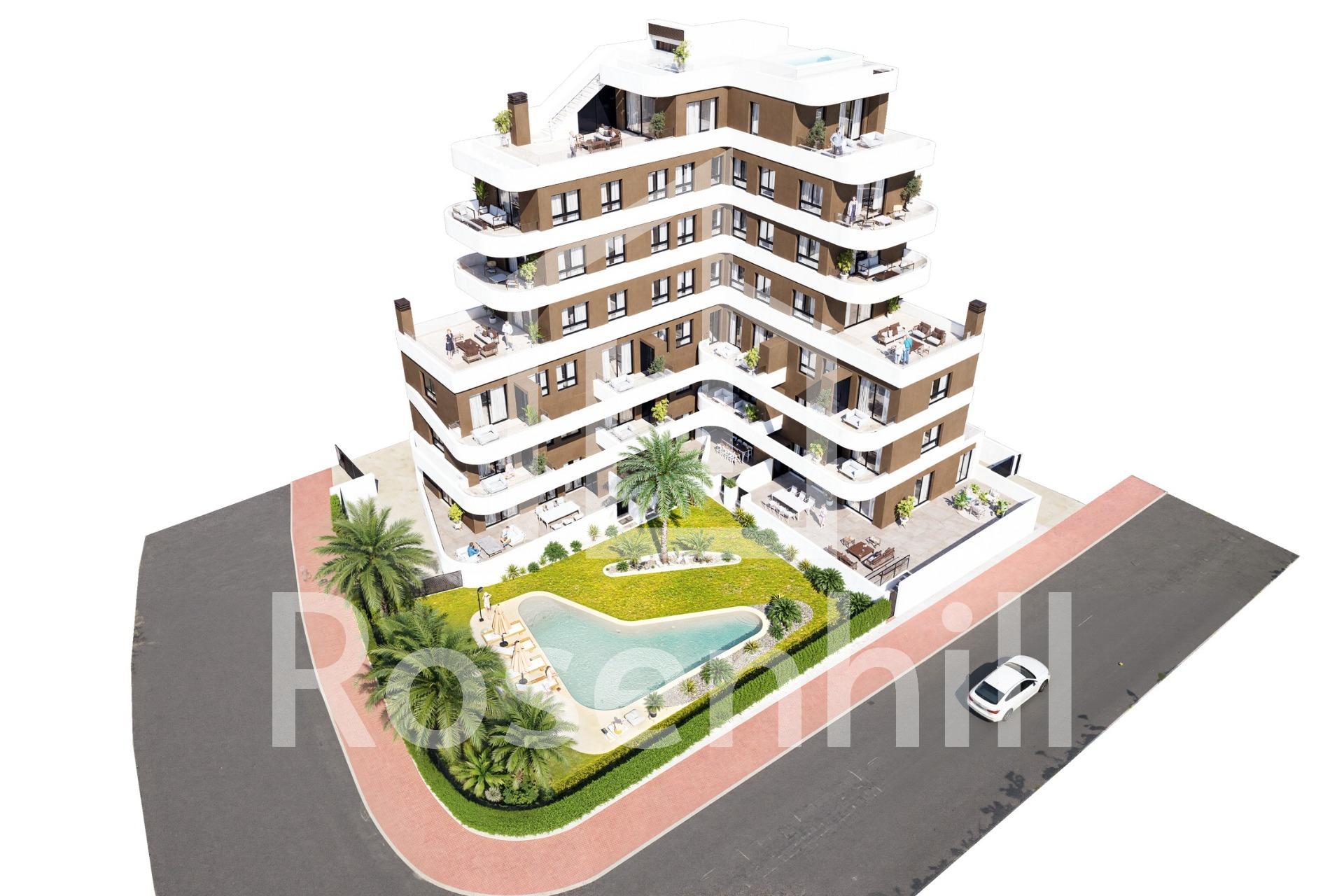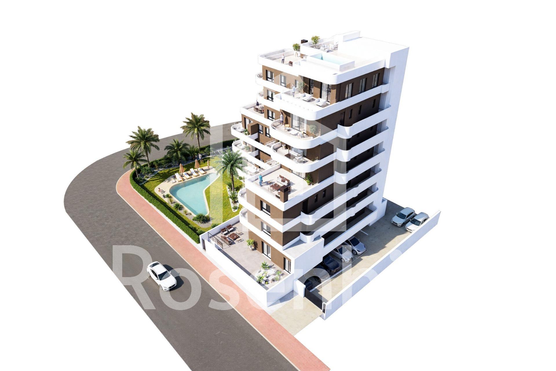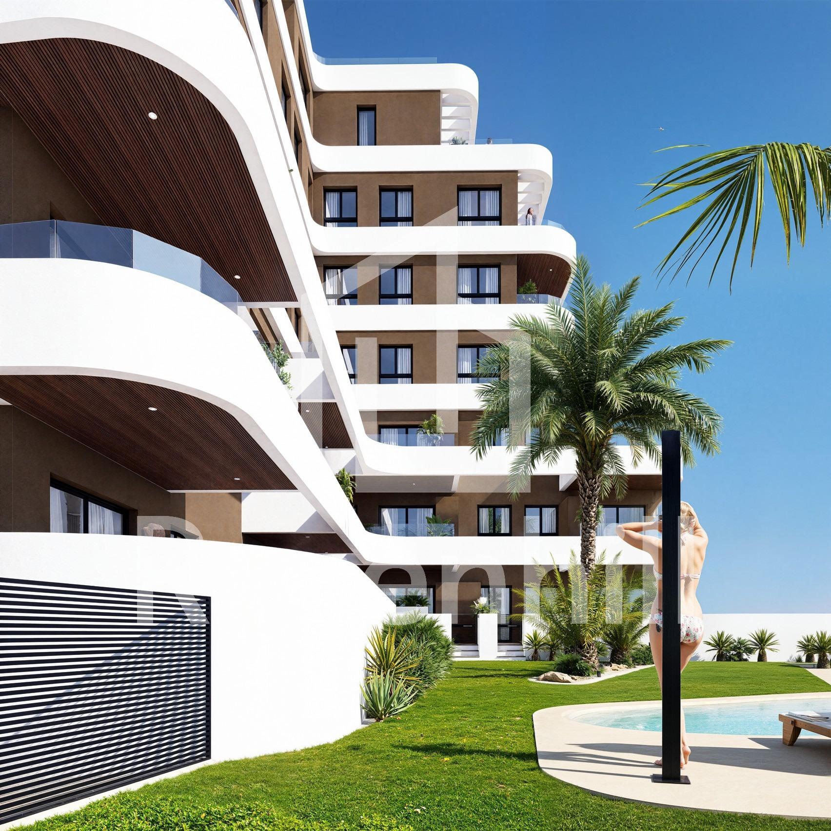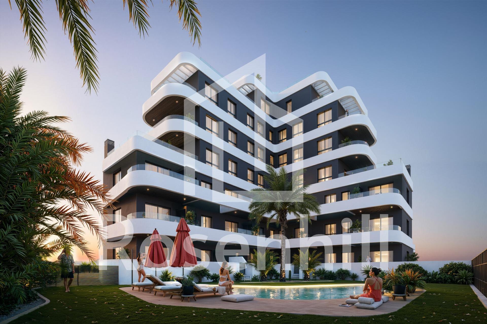 New Build Apartments in Guardamar del Segura – Modern Living Just 1.4 km from the Beach Discover a new residential development in Guardamar del Segura, Alicante, offering just 19 exclusive, modern homes designed for comfortable, contemporary living on the Costa Blanca. Ideally located just 1.4 km from the beach and a short walk from the town center, this development combines style, practicality, and a prime coastal setting. Exclusive Residential Project with Limited Availability This boutique development features 2 and 3-bedroom apartments with a range of layouts to suit different needs: Ground-floor units with spacious private terraces Mid-level apartments with generous balconies or open terraces. A spectacular penthouse with a private solarium and swimming pool Each property showcases elegant, curved architectural lines, glass railings, and modern finishes—ideal for both year-round residence or a luxurious holiday retreat. Premium Finishes and Energy-Efficient Features Designed for comfort and sustainability, each home includes: Reinforced front door for added security Fully furnished kitchen with appliances included Energy-efficient aerothermal system for hot water Private parking space included in the price The building also features a communal swimming pool and landscaped garden areas, perfect for enjoying the sunny Mediterranean climate. Prime Location in Guardamar del Segura Situated in a well-connected and vibrant part of Guardamar, this development provides easy access to nature, beaches, and essential services. Residents enjoy proximity to supermarkets, restaurants, medical centers, parks, and the town’s famous pine forest and dunes. Key distances: Guardamar town center – 1 km Closest beach – 1.4 km Marina – 2 km Reina Sofía Park – 1.5 km La Marquesa Golf (Ciudad Quesada) – 9 km Habaneras Shopping Center (Torrevieja) – 13 km Alicante-Elche Airport – 33 km Public transport connections include direct bus lines to Alicante and Torrevieja, offering easy access without the need for a car. Secure Your Apartment on the Costa Blanca Whether you’re looking for a permanent residence, vacation property, or smart investment, this new development in Guardamar del Segura is the perfect choice. Contact us today to learn more or reserve your new home by the sea.