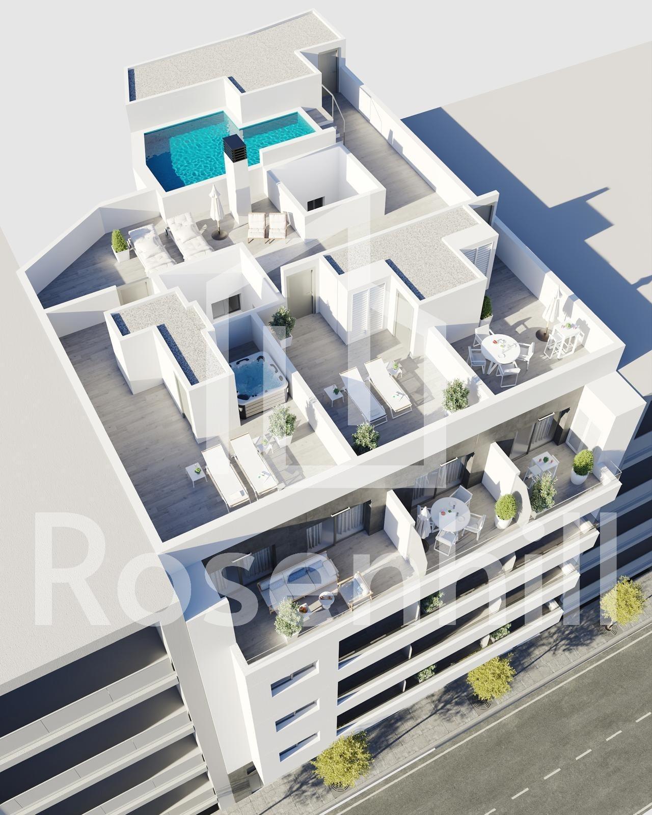 New Build Apartments in Torrevieja Just 400 m from Playa del Cura Prime Location in the Heart of Torrevieja Discover these brand new apartments and penthouses in one of the most sought after areas of Torrevieja, only 400 m from Playa del Cura and just 150 m from the seafront promenade. Located in the city centre, this vibrant neighborhood offers all essential services within walking distance, including supermarkets, shops, restaurants, cafes and public transport. Torrevieja is a well known coastal city on the Costa Blanca, famous for its mild Mediterranean climate, lively atmosphere and year round lifestyle by the sea. Modern Apartments with Spacious Layouts This exclusive new development consists of only 12 apartments and penthouses with 2 or 3 bedrooms, designed to offer comfort, functionality and contemporary style. Middle floor apartments feature generous terraces, while the penthouses enjoy an additional private solarium, ideal for sunbathing or outdoor dining. All homes include an open plan kitchen connected to the living and dining area, creating bright and welcoming interiors. Bedrooms come with fitted wardrobes, and bathrooms are fully equipped with furniture, mirrors and shower screens. Optional underground parking spaces and storage rooms are available at an extra cost. Quality Finishes and Energy Efficient Features The apartments are built with high quality materials and a strong focus on energy efficiency. Exterior aluminum carpentry includes thermal break technology and double glazing for thermal and acoustic insulation. Motorized shutters add comfort and security. Each home has pre installation for ducted air conditioning and heating, reinforced entrance doors and white lacquered interior doors. Hot water is produced through an aerothermal system, reducing energy consumption and improving sustainability. Rooftop Solarium with Communal Pool Residents can enjoy an exclusive rooftop solarium with a communal swimming pool, accessible by lift or stairs. This private area is perfect for relaxing, sunbathing and enjoying open views over the city. It provides a peaceful retreat above the lively streets of Torrevieja and adds significant value to the development. Torrevieja Lifestyle and Surroundings Torrevieja is known for its long coastline, sandy beaches and iconic salt lagoons. The Natural Park of La Mata and Torrevieja lagoons is approximately 5 km away and offers walking trails and unique landscapes. Several golf courses such as Villamartin Golf and Las Colinas Golf are within 12 to 18 km. Torrevieja Marina and port are around 1 km away. Alicante Airport is approximately 45 km and Murcia International Airport around 65 km, both with excellent European connections. Your Coastal Home Awaits Do not miss this opportunity to own a modern new build apartment close to the beach in Torrevieja. Contact us today for more information or to arrange a private viewing.