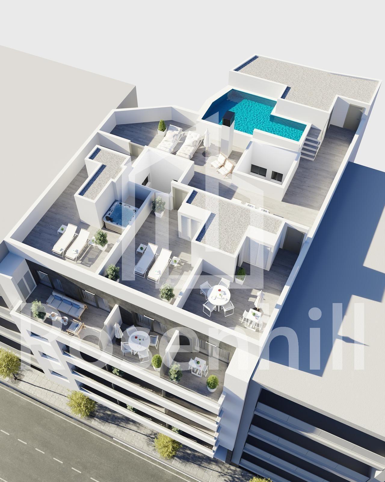 New Build Apartments in Torrevieja Just 400 m from Playa del Cura Prime Location in the Heart of Torrevieja Discover these brand new apartments and penthouses in one of the most sought after areas of Torrevieja, only 400 m from Playa del Cura and just 150 m from the seafront promenade. Located in the city centre, this vibrant neighborhood offers all essential services within walking distance, including supermarkets, shops, restaurants, cafes and public transport. Torrevieja is a well known coastal city on the Costa Blanca, famous for its mild Mediterranean climate, lively atmosphere and year round lifestyle by the sea. Modern Apartments with Spacious Layouts This exclusive new development consists of only 12 apartments and penthouses with 2 or 3 bedrooms, designed to offer comfort, functionality and contemporary style. Middle floor apartments feature generous terraces, while the penthouses enjoy an additional private solarium, ideal for sunbathing or outdoor dining. All homes include an open plan kitchen connected to the living and dining area, creating bright and welcoming interiors. Bedrooms come with fitted wardrobes, and bathrooms are fully equipped with furniture, mirrors and shower screens. Optional underground parking spaces and storage rooms are available at an extra cost. Quality Finishes and Energy Efficient Features The apartments are built with high quality materials and a strong focus on energy efficiency. Exterior aluminum carpentry includes thermal break technology and double glazing for thermal and acoustic insulation. Motorized shutters add comfort and security. Each home has pre installation for ducted air conditioning and heating, reinforced entrance doors and white lacquered interior doors. Hot water is produced through an aerothermal system, reducing energy consumption and improving sustainability. Rooftop Solarium with Communal Pool Residents can enjoy an exclusive rooftop solarium with a communal swimming pool, accessible by lift or stairs. This private area is perfect for relaxing, sunbathing and enjoying open views over the city. It provides a peaceful retreat above the lively streets of Torrevieja and adds significant value to the development. Torrevieja Lifestyle and Surroundings Torrevieja is known for its long coastline, sandy beaches and iconic salt lagoons. The Natural Park of La Mata and Torrevieja lagoons is approximately 5 km away and offers walking trails and unique landscapes. Several golf courses such as Villamartin Golf and Las Colinas Golf are within 12 to 18 km. Torrevieja Marina and port are around 1 km away. Alicante Airport is approximately 45 km and Murcia International Airport around 65 km, both with excellent European connections. Your Coastal Home Awaits Do not miss this opportunity to own a modern new build apartment close to the beach in Torrevieja. Contact us today for more information or to arrange a private viewing.