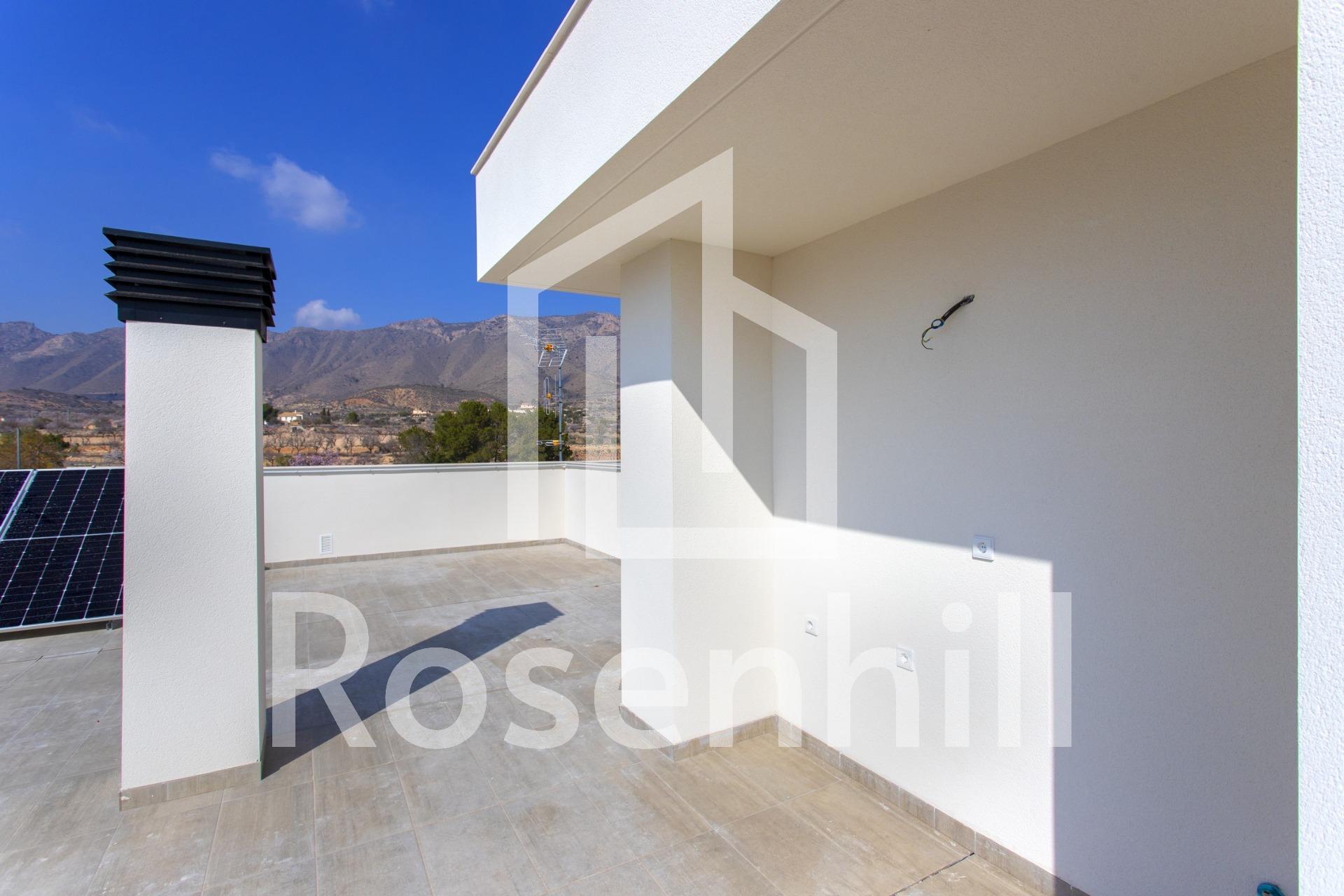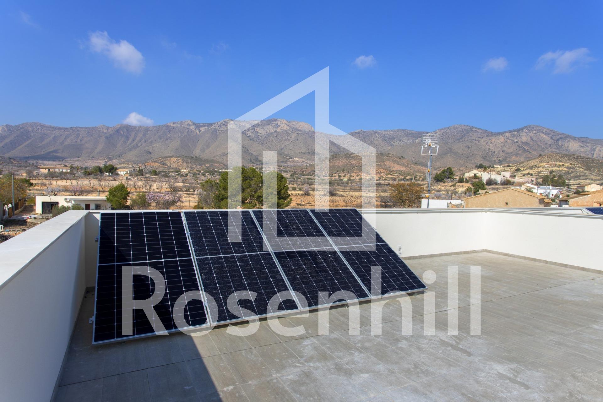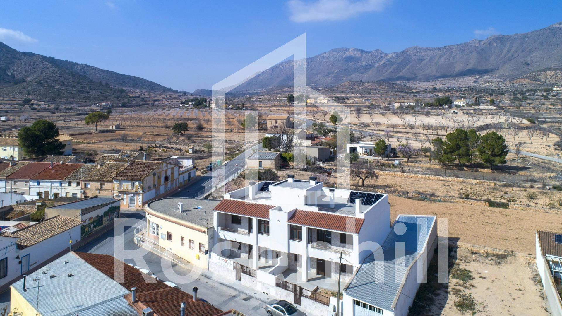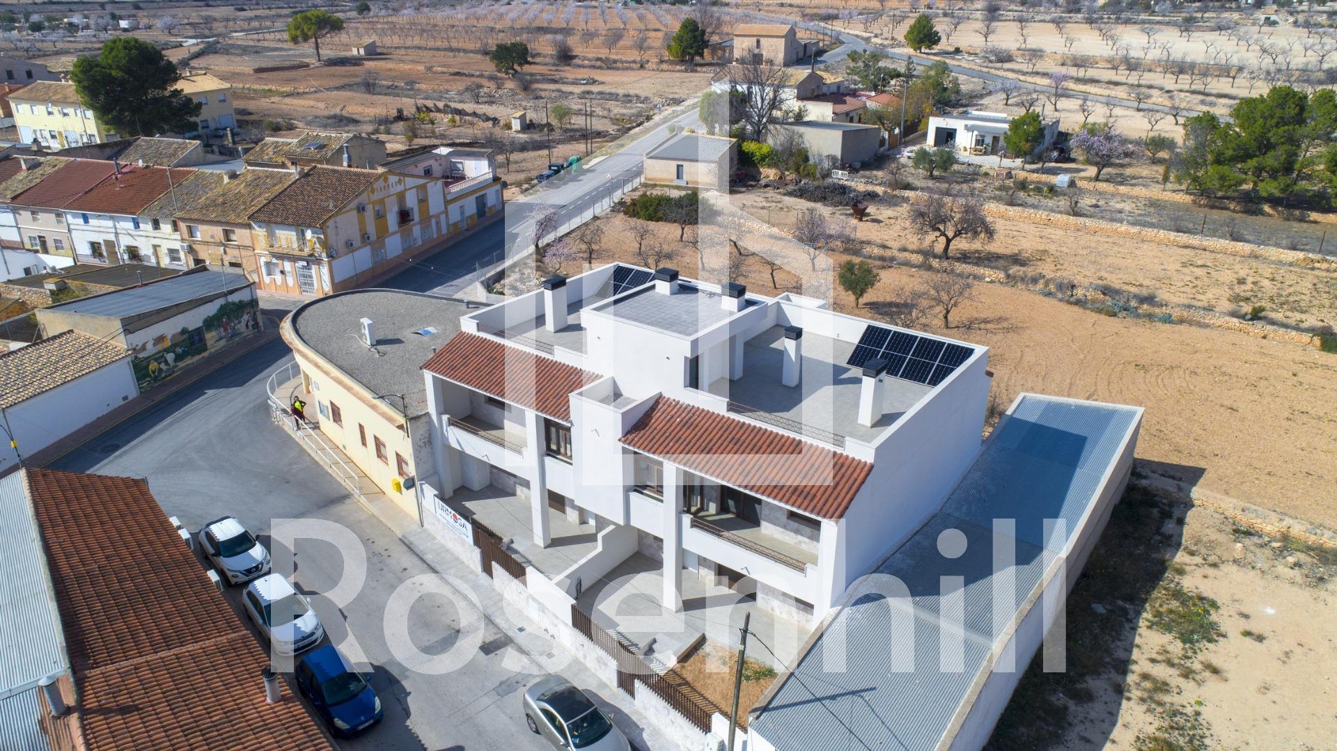 NEW BUILD BUNGALOWS IN HONDON DE LAS NIEVES New Build 4 bungalows located in Hondón de las Nieves (Alicante) All bungalows have 3 bedrooms with fitted wardrobes, 2 bathrooms, large living room, fitted kitchen and terrace. The properties are available on the ground floor with front and rear terrace/garden and on the top floor with terrace and private solarium. The first floor properties have photovoltaic panels on the roof for energy saving. The kitchens are fully furnished and finished with granite or synthetic agglomerate worktops (silestone or simular). The bathrooms are finished with high quality sanitary ware and taps with built-in cistern. These homes have pre-installation for ducted air conditioning with heat pump, forced ventilation with heat recovery, aerothermal system for domestic hot water, the most modern thermal and acoustic insulation, aluminium exterior carpentry with thermal bridge break and shutters. Hondón de las Nieves is a town in the Valencian Community, Spain. It is located in the southwest of the province of Alicante, in the region of Vinalopó Medio. The beaches and Alicante Airport are closely just 30 minutes drive away.
