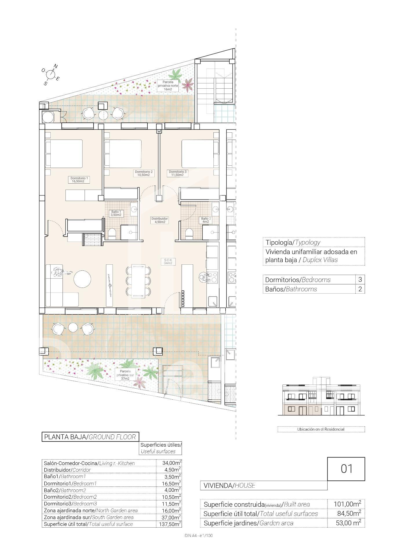 NEW BUILD BUNGALOWS IN HONDON DE LAS NIEVES New Build 4 bungalows located in Hondón de las Nieves (Alicante) All bungalows have 3 bedrooms with fitted wardrobes, 2 bathrooms, large living room, fitted kitchen and terrace. The properties are available on the ground floor with front and rear terrace/garden and on the top floor with terrace and private solarium. The first floor properties have photovoltaic panels on the roof for energy saving. The kitchens are fully furnished and finished with granite or synthetic agglomerate worktops (silestone or simular). The bathrooms are finished with high quality sanitary ware and taps with built-in cistern. These homes have pre-installation for ducted air conditioning with heat pump, forced ventilation with heat recovery, aerothermal system for domestic hot water, the most modern thermal and acoustic insulation, aluminium exterior carpentry with thermal bridge break and shutters. Hondón de las Nieves is a town in the Valencian Community, Spain. It is located in the southwest of the province of Alicante, in the region of Vinalopó Medio. The beaches and Alicante Airport are closely just 30 minutes drive away.