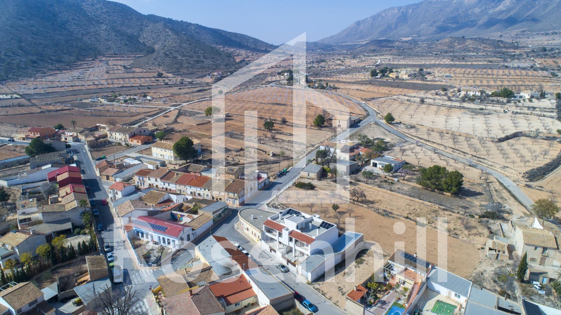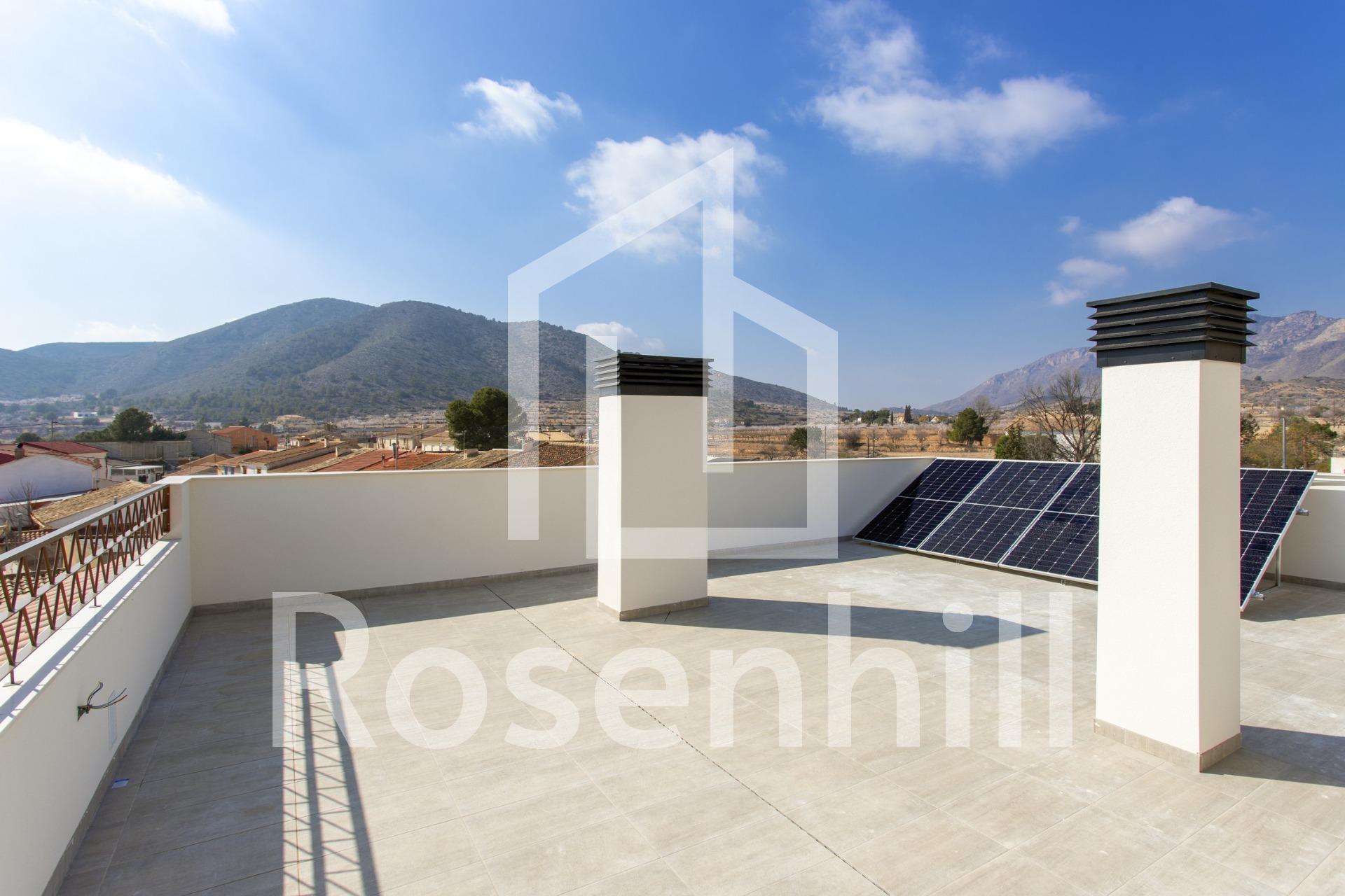 NEW BUILD BUNGALOWS IN HONDON DE LAS NIEVES New Build 4 bungalows located in Hondón de las Nieves (Alicante) All bungalows have 3 bedrooms with fitted wardrobes, 2 bathrooms, large living room, fitted kitchen and terrace. The properties are available on the ground floor with front and rear terrace/garden and on the top floor with terrace and private solarium. The first floor properties have photovoltaic panels on the roof for energy saving. The kitchens are fully furnished and finished with granite or synthetic agglomerate worktops (silestone or simular). The bathrooms are finished with high quality sanitary ware and taps with built-in cistern. These homes have pre-installation for ducted air conditioning with heat pump, forced ventilation with heat recovery, aerothermal system for domestic hot water, the most modern thermal and acoustic insulation, aluminium exterior carpentry with thermal bridge break and shutters. Hondón de las Nieves is a town in the Valencian Community, Spain. It is located in the southwest of the province of Alicante, in the region of Vinalopó Medio. The beaches and Alicante Airport are closely just 30 minutes drive away.