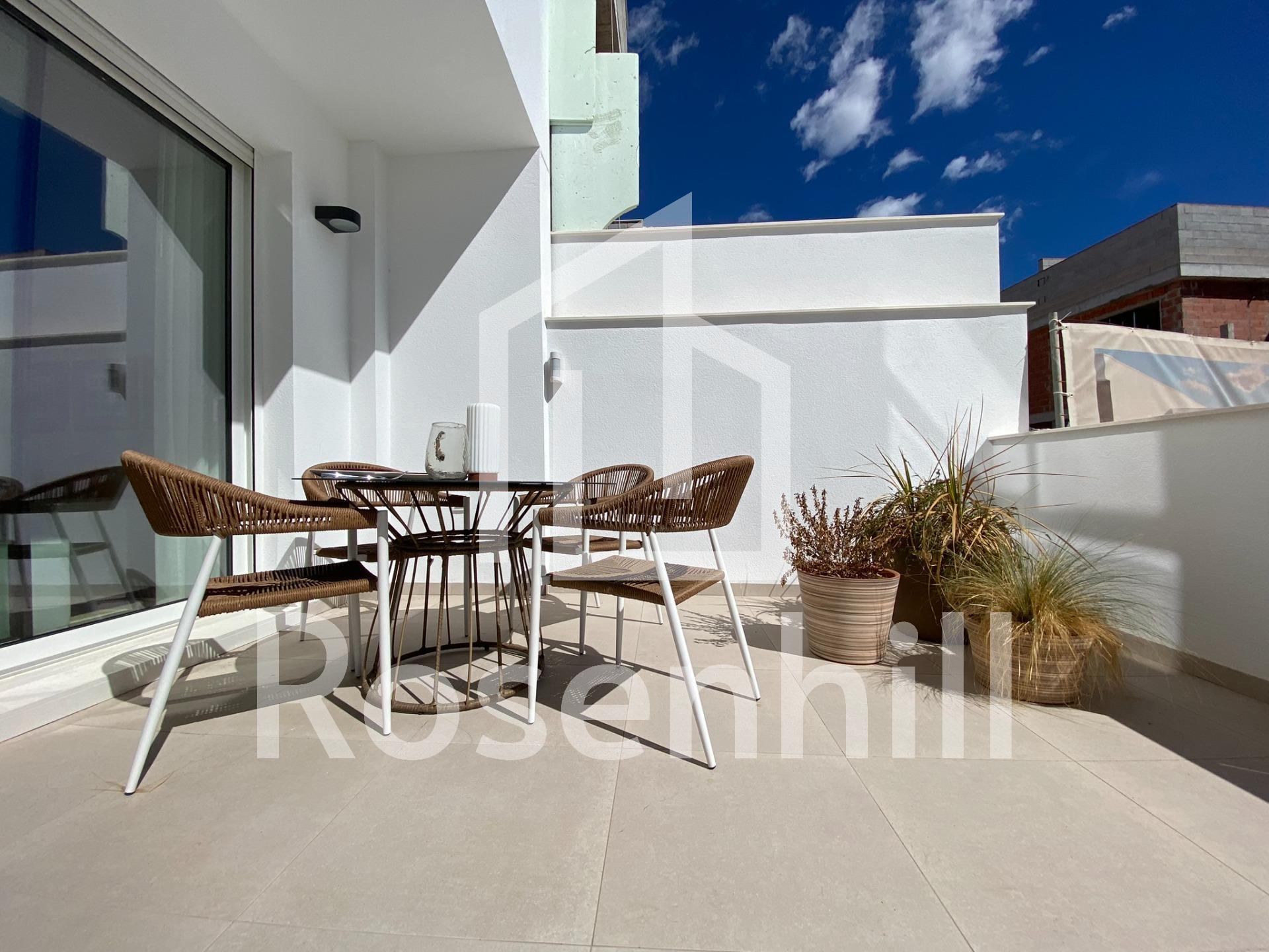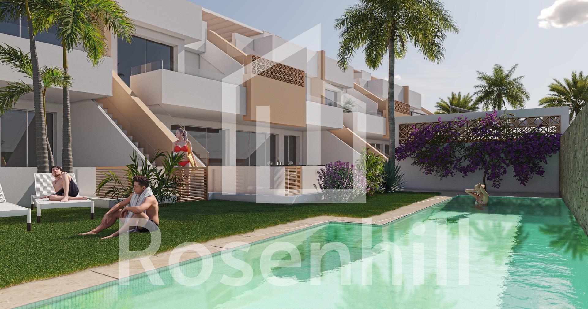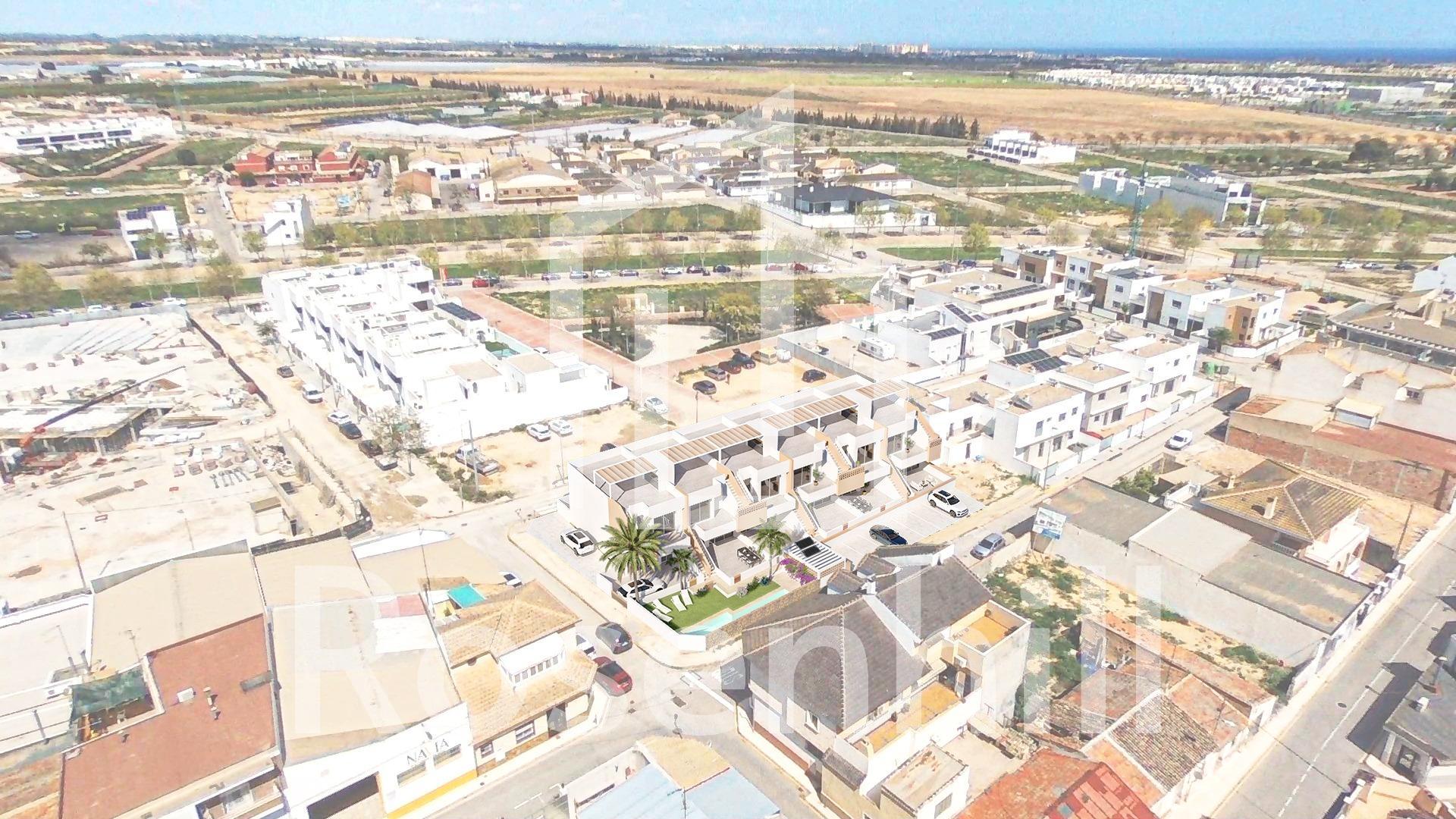 New Build Bungalows in Pilar de la Horadada Near the Beach and Town Centre Contemporary Living in the Heart of Costa Blanca Welcome to a boutique residential complex of 12 new build bungalows located in Pilar de la Horadada, a vibrant coastal town at the southern tip of the Costa Blanca. This prime location offers the perfect blend of tranquil Mediterranean living and convenience, with all essential services, shops, restaurants, and amenities within walking distance. The beautiful sandy beaches of Torre de la Horadada and Mil Palmeras are just 3 km away, ideal for relaxed beach days or water sports. Choice of Ground Floor or Top Floor Bungalows This exclusive development offers two types of modern homes to suit your lifestyle: Ground floor bungalows with 3 bedrooms, 2 bathrooms, and large private front and rear terraces with direct access to the communal pool and gardens. Top floor bungalows with 2 bedrooms, 2 bathrooms, and an expansive private rooftop solarium, complete with a summer kitchen, pergola, and guest toilet. All homes feature bright open-plan living areas, fully equipped kitchens, ducted air conditioning, and private parking. Bedrooms include built-in wardrobes and the bathrooms benefit from underfloor heating for added comfort. Premium Features for Modern Mediterranean Living The homes are designed with high-quality finishes and practical features, including: Armoured front door with aluminium finish Electric shutters in living room and bedrooms Aerothermal hot water system Kitchen appliances from BALAY or equivalent Rooftop solariums with artificial grass, outdoor shower, lighting, and full summer kitchen with dishwasher, small fridge, induction hob, and extractor. Strategic Location with Excellent Connectivity Pilar de la Horadada is well connected to major points of interest along the Costa Blanca and Costa Cálida: Beaches (Torre de la Horadada / Mil Palmeras) – 3 km Lo Romero Golf Course – 6 km Corvera Airport (Murcia) – 40 km Alicante Airport – 55 km Zenia Boulevard Shopping Centre – 14 km Marina of San Pedro del Pinatar – 11 km Your Ideal Home in the Sun Whether you’re looking for a holiday escape, a year-round residence, or a rental investment, these bungalows in Pilar de la Horadada offer excellent value and quality in one of the Costa Blanca’s most desirable towns. Contact us today to arrange a viewing or request more information!