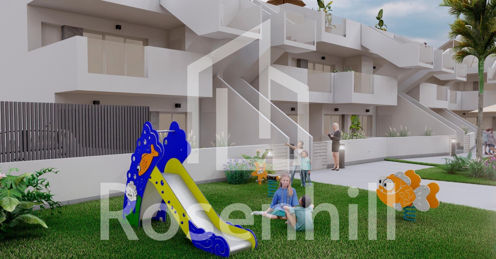 NEW BUILD BUNGALOWS IN ROLDAN New Build gated residential complex of bungalow apartments located in Roldán, Murcia. These exclusive bungalows are designed with 3 bedrooms and 2 bathrooms, terrace on the ground floor and with 2 bedrooms and 2 bathrooms and solarium for the upper floor. The interiors, elegant and functional, have high quality floors, fully fitted kitchens in white combined with imitation wood, including electrical appliances. The bathrooms have a vanity unit with washbasin and light. The bedrooms include lined wardrobes with drawers and sliding doors and each property has pre-installation for ducted air conditioning. The exteriors are not less impressive, including a communal swimming pool and a beautiful sport area and childrens playground on artificial grass to enjoy. Each property has parking space. Storerooms are optional at an extra cost. Roldan itself is a traditional town with all the local amenities you will need including Supermarkets, Restaurants, Bars, Health Clinic, Pharmacy, Police Station, Petrol Station, Mechanics, Dentists, Doctors and more. The nearby golf resorts of La Torre, & Terrazas are easily accessible, Corvera Airport is 15 minutes away & the beaches of the Mar Menor just 20 minutes drive.