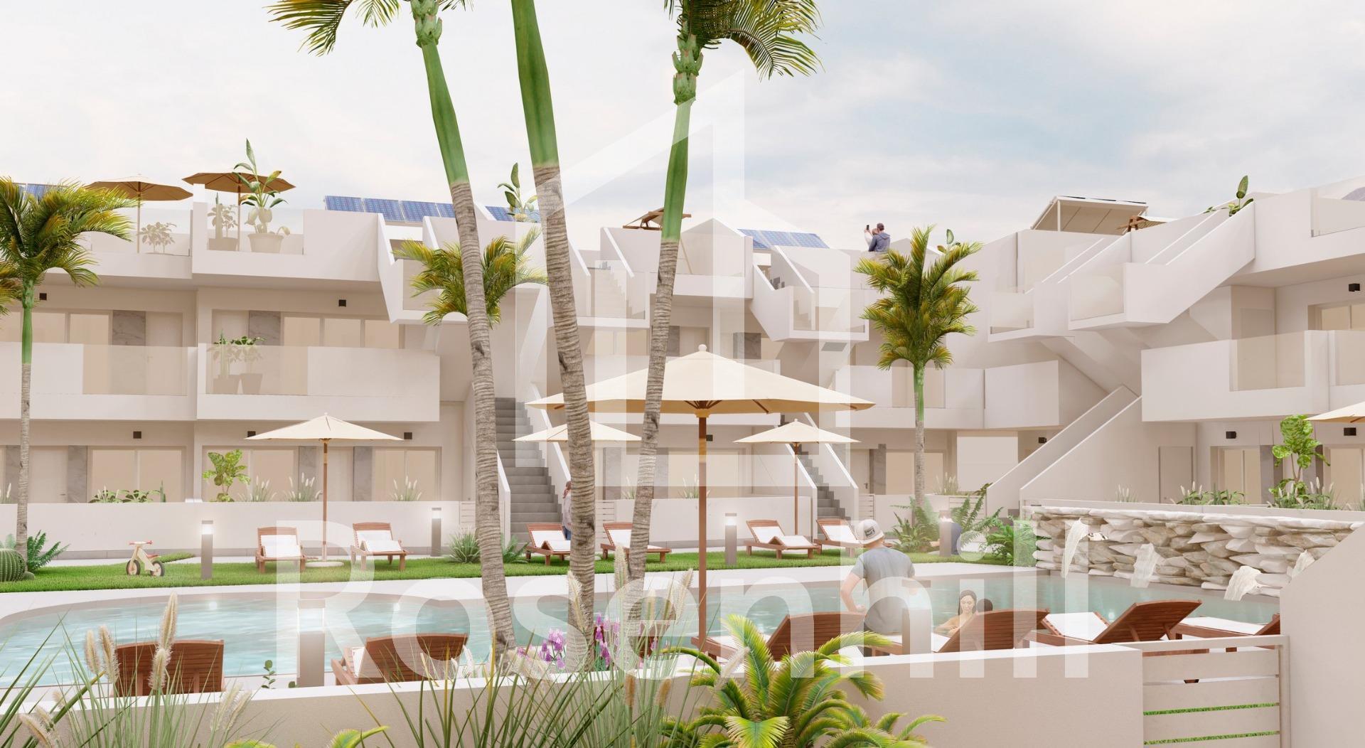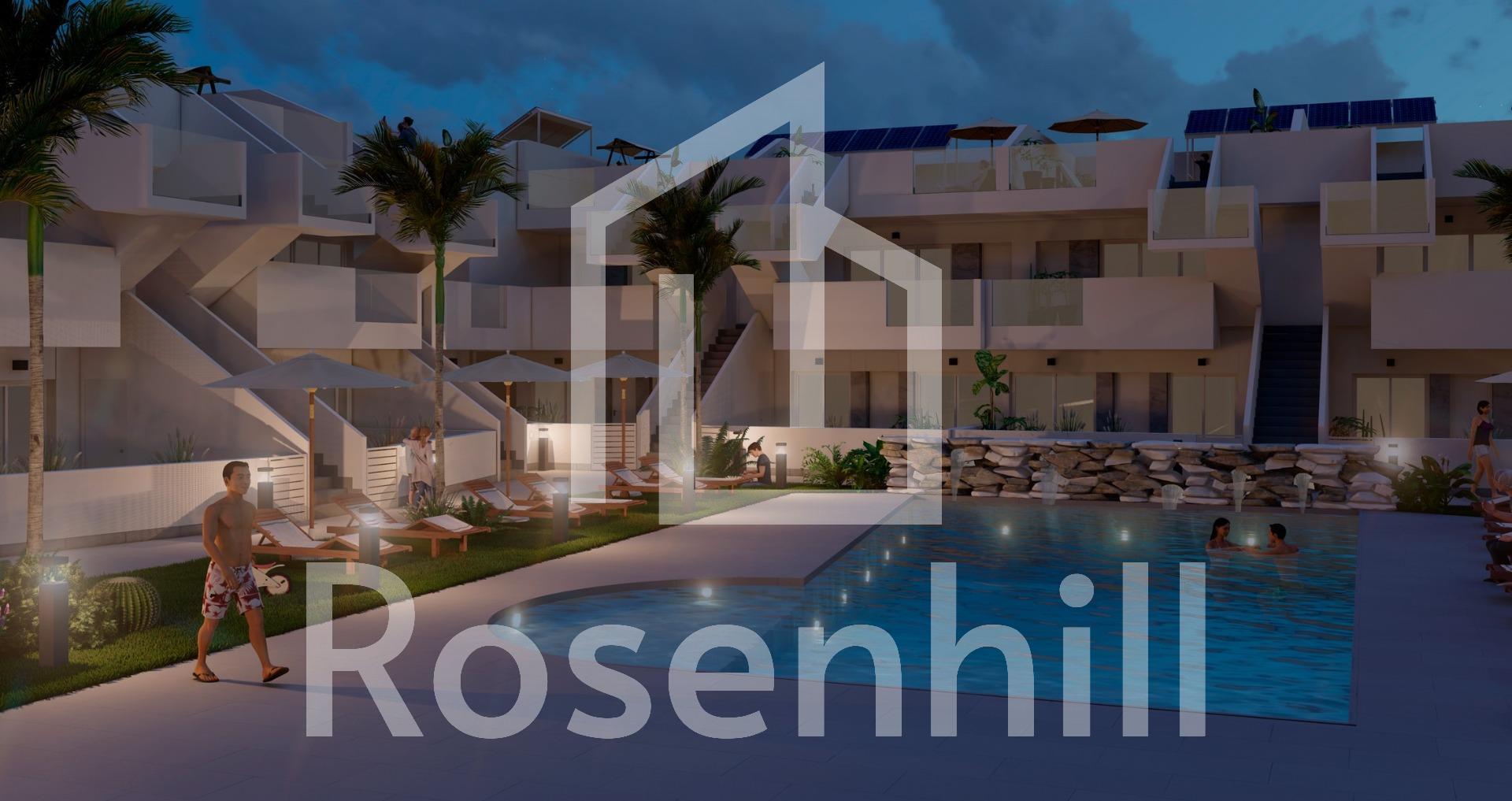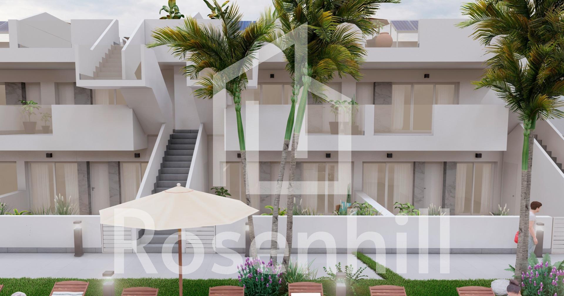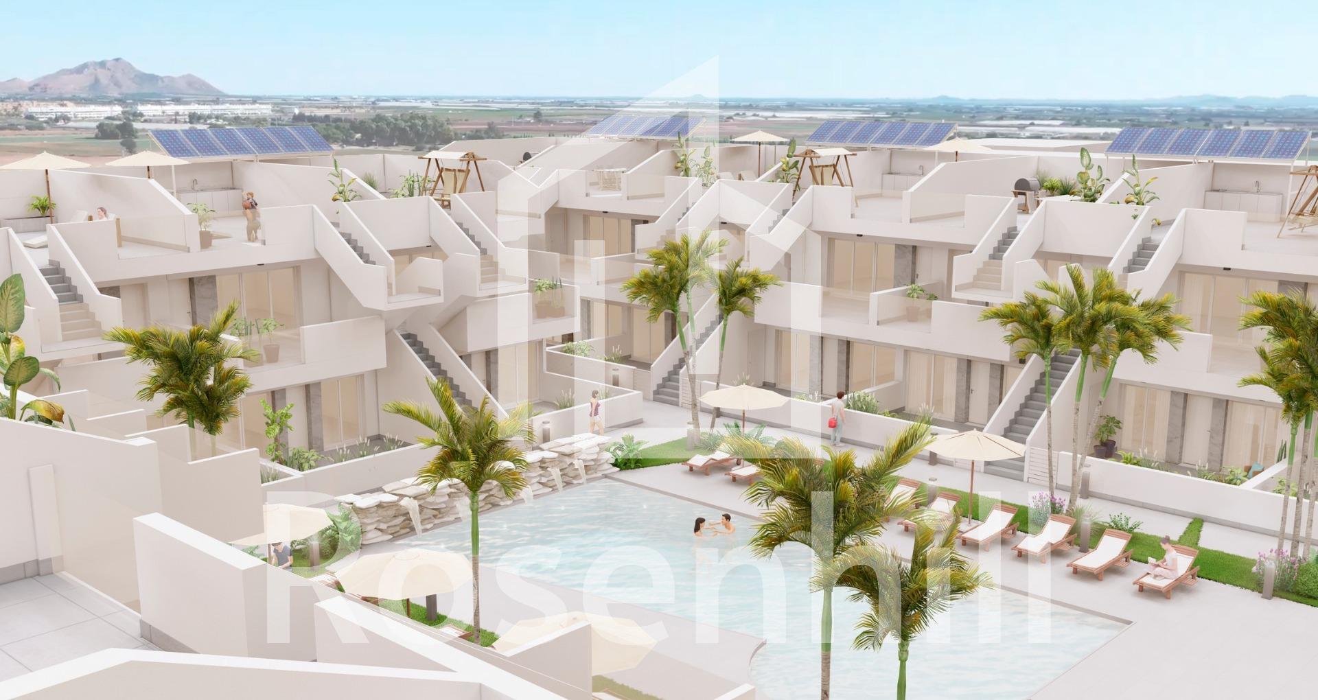 NEW BUILD BUNGALOWS IN ROLDAN New Build gated residential complex of bungalow apartments located in Roldán, Murcia. These exclusive bungalows are designed with 3 bedrooms and 2 bathrooms, terrace on the ground floor and with 2 bedrooms and 2 bathrooms and solarium for the upper floor. The interiors, elegant and functional, have high quality floors, fully fitted kitchens in white combined with imitation wood, including electrical appliances. The bathrooms have a vanity unit with washbasin and light. The bedrooms include lined wardrobes with drawers and sliding doors and each property has pre-installation for ducted air conditioning. The exteriors are not less impressive, including a communal swimming pool and a beautiful sport area and childrens playground on artificial grass to enjoy. Each property has parking space. Storerooms are optional at an extra cost. Roldan itself is a traditional town with all the local amenities you will need including Supermarkets, Restaurants, Bars, Health Clinic, Pharmacy, Police Station, Petrol Station, Mechanics, Dentists, Doctors and more. The nearby golf resorts of La Torre, & Terrazas are easily accessible, Corvera Airport is 15 minutes away & the beaches of the Mar Menor just 20 minutes drive.