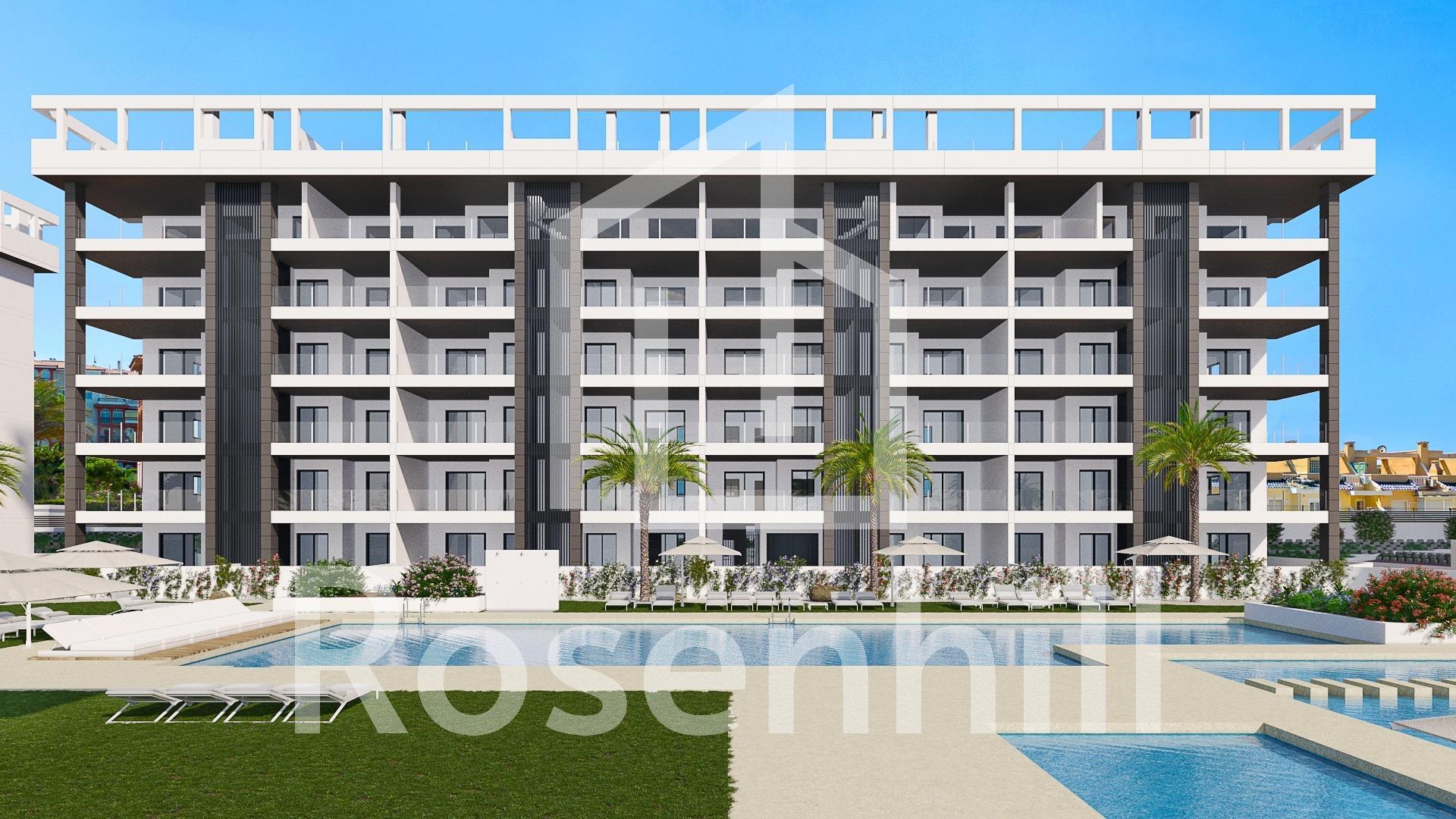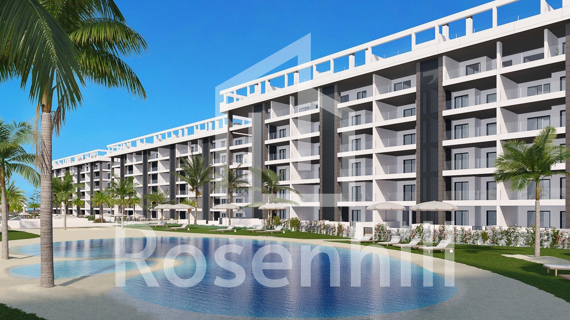 NEW BUILD GATED URBANIZATION IN TORREVIEJA ONLY 700M FROM THE BEACH New Build residential complex of 362 apartments with large community areas in Torrevieja. You can choose between luxury 2 bedrooms and 2 bathrooms apartments , 3 bedrooms and 2 bathrooms penthouses with private solarium and 2 bedroom, 2 bathroom ground floor apartments with private garden. -Modern designs and quality finishes and materials -Almost all apartments will have sea views -All apartments comes with large front terraces facing the community areas -Communal areas with two swimming pools for adults, children’s pool, children’s area, gym, sports area and spa, bicycle parking and vehicle parking area -700 meters to La Mata Beach, 10 minutes walking -In front of Torremarina Shopping Center with Mercadona, restaurants, cafes and other shops Torrevieja is a Spanish town in the province of Alicante, on the Costa Blanca. It is known for its typically Mediterranean climate and coastline. It has boardwalks with resorts along its sandy beaches. The small Museum of the Sea and Salt houses exhibitions on the fishing and salt history of the city. In the interior, the Lagunas de La Mata-Torrevieja Natural Park has trails and two salty lagoons, one pink and the other green. Alicante airport located 40 minutes away and Murcia airport about 1 hour away.