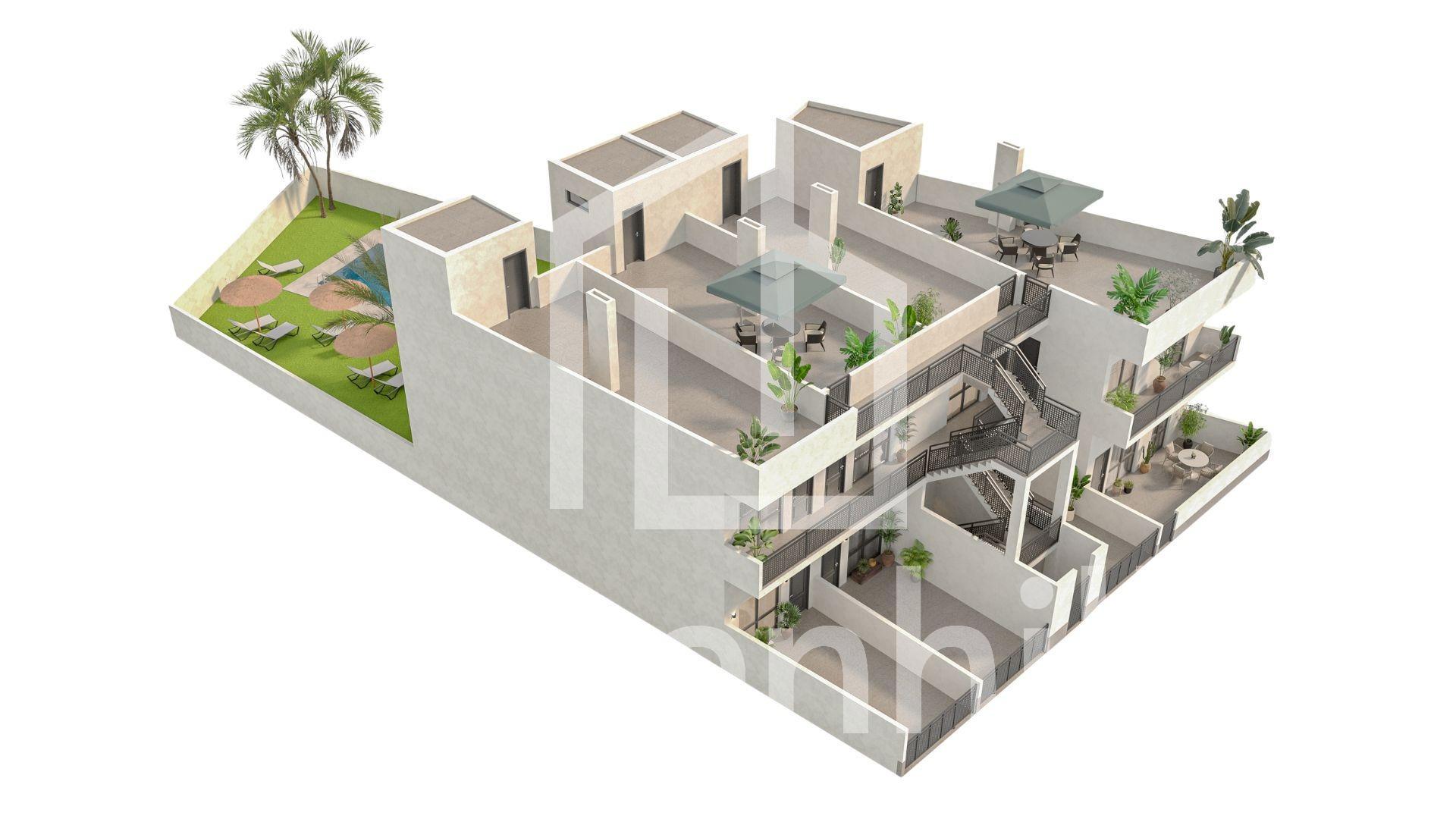 New Build Homes in La Canalosa with Communal Pool Rural Tranquillity with Modern Amenities Welcome to this exclusive residential development in La Canalosa, a charming hamlet in Hondón de las Nieves, Alicante. This new-build development offers a peaceful lifestyle surrounded by nature, with all the amenities you need to enjoy everyday life. With a total of 8 homes with 2 bedrooms and 1 bathroom, it is the ideal option for those seeking peace, comfort and connection with the natural environment. Property Types to Suit All Tastes The ground floor properties have front terraces and rear patios, and three of them offer space to park your car within the private plot. The upper floor properties have a private solarium with storage room, ideal for enjoying the sun all year round and the excellent Mediterranean climate that characterises the area. Specifications and Features Each home has been designed with a practical and modern approach: Pre-installation of ducted air conditioning Security entrance door Bathroom cabinet with mirror High-quality exterior carpentry The residential complex also has a communal swimming pool surrounded by landscaped areas, perfect for relaxing and enjoying time with the family. Natural surroundings and healthy lifestyle La Canalosa is the ideal destination for those who value a simple, healthy lifestyle surrounded by nature. Its rural landscapes invite you to take walks in the open air, go hiking, cycling or simply enjoy the silence and beauty of the surroundings. Just a few minutes away, Hondón de las Nieves offers additional services, local history and a renowned wine tradition. Distances to points of interest Local school: 0.1 km Sports facilities: 0.3 km Medical centre: 3 km Central market: 4 km Golf course: 16 km Shopping centres: 17 km Elche: 26 km Alicante: 26 km Alicante-Elche Airport: 33 km Costa Blanca beaches: 38 km Invest in Wellbeing and Nature This development represents an excellent opportunity to acquire a modern home in a unique and well-connected rural setting. Perfect as a main residence, holiday home or investment with great potential for capital appreciation. Contact us today to schedule your visit and discover your new home in La Canalosa.