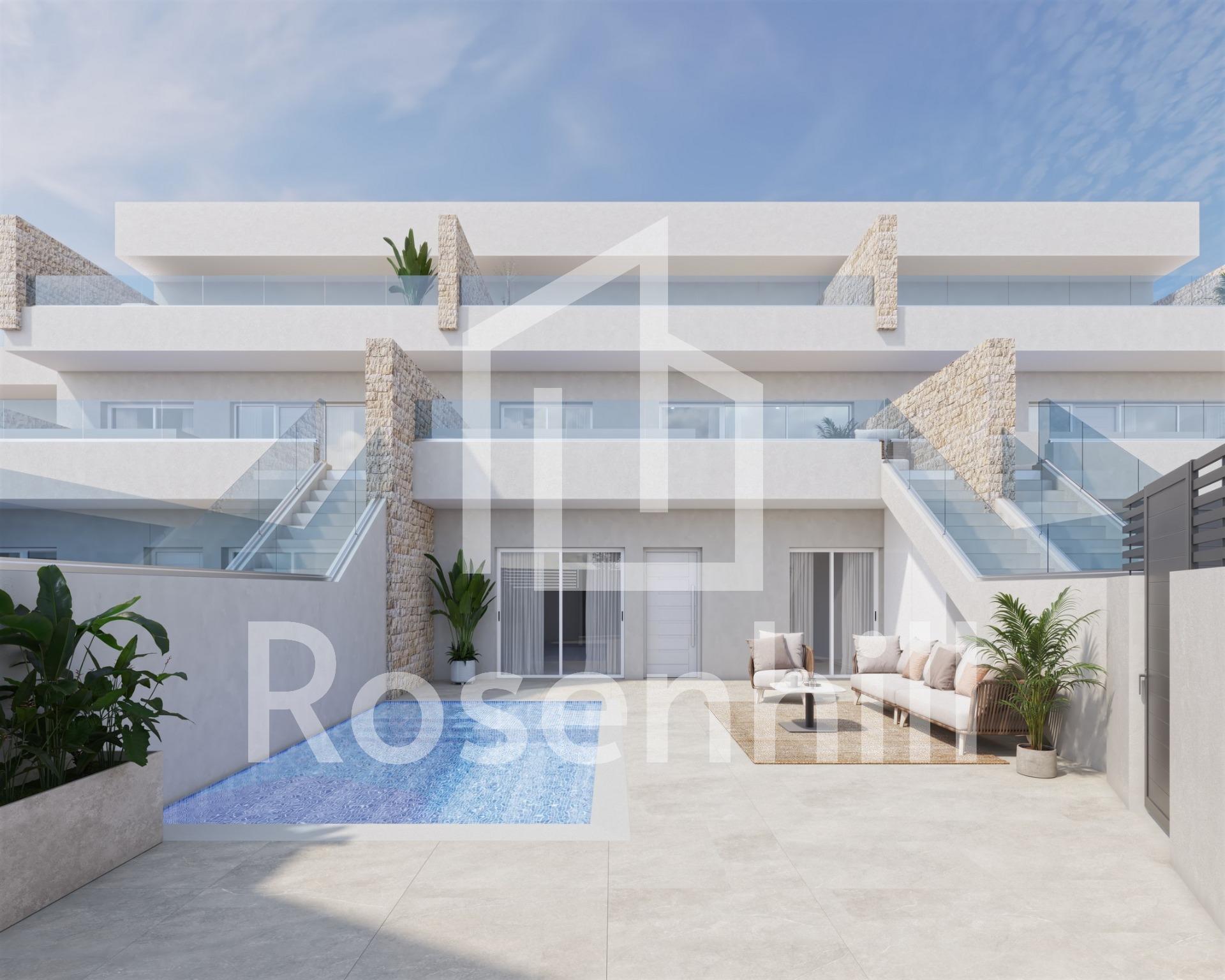 New build homes in Pilar de la Horadada with private pool Modern homes close to the beach Discover this exclusive new build residential complex in Pilar de la Horadada, which offers bungalows just 2.5 km from the beach. Designed for comfort and style, these homes are an excellent opportunity to enjoy life on the Costa Blanca. Spacious and stylish homes This development offers 2 or 3 bedroom homes with 2 bathrooms and private parking. Choose from: Ground floor bungalows with private garden. Top floor bungalows with open terrace. 1 Townhouse with 3 bedrooms and corner plot. Each property is built with high quality materials and modern finishes, including: All properties have private swimming pool. Pre-installation of ducted air conditioning. Aluminium exterior carpentry with thermal break and double glazing. Security entrance door for peace of mind. Aerothermal system for efficient hot water production. Fitted wardrobes in bedrooms. Privileged location in Pilar de la Horadada Pilar de la Horadada is a charming Spanish town in the southernmost part of the Costa Blanca. It offers a vibrant main street with numerous shops, supermarkets, restaurants and picturesque squares. The stunning beaches of Torre de la Horadada and Mil Palmeras are only 5 minutes away, with fine golden sand a picturesque promenade. The town also offers well-developed cycle paths and hiking trails, as well as a variety of sporting activities. Convenient access to key destinations Lo Romero Golf Course – 5 km (10 minutes drive). Corvera Airport (Murcia) – 40 km (40 minutes drive). Alicante Airport – 55 km (55 minutes drive). Shopping Centres (La Zenia Boulevard) – 15 km (15 minutes by car). Torre de la Horadada Marina – 3 km (5 minutes drive). Secure your dream home today Don’t miss out on this fantastic opportunity to own a brand new home in a prime location. Contact us today for more information and to arrange a viewing.