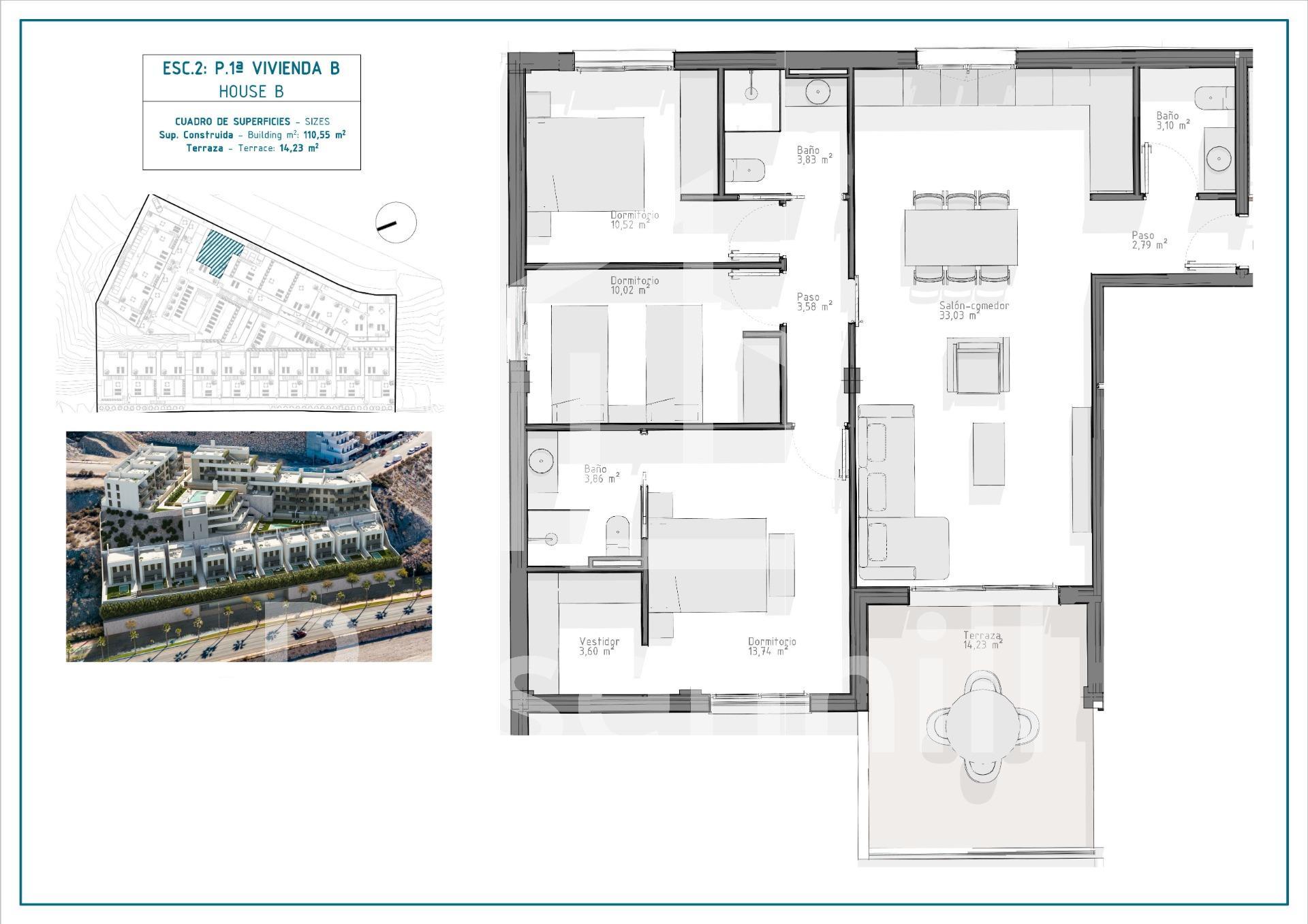 NEW BUILD RESIDENTIAL COMPLEX IN AGUILAS New Build exclusive residential complex of apartments and villas in Aguilas. New Build complex consist of 36 apartments with 3 and 2 bedrooms distributed in 4 modern blocks, equipped with 2 communal swimming pools and community garage with parking space and storage room for each property; and 10 elegant villas of 4 bedrooms and 3 bathrooms, each one with its own private pool. This residential complex has been designed with excellence in mind, offering spacious terraces on the ground and first floors and solariums on the upper floors, where the view of the horizon becomes a canvas of experiences. The houses have fully equipped kitchens and bathrooms and pre-installation for ducted air conditioning. Complex located 800 metres from the sea, next to a Shopping Centre. Aguilas located in exceptional area on Costa Cálida at only 50 minutes from the new Murcia or Almeria airport and 1h30 from Alicante airport. Aguilas it is a small city with many amenities, a long beach to walk and relax in the sun. Is a perfect enclave for diving, water sports, hiking and golf. It has 28 kilometers of coastline in which there are 35 beaches with different types of sand thickness located in different landscapes, from coves and virgin beaches in natural settings to the urban beaches of the town of Aguilas. Its warm desert climate is present all year round with an annual average of 22º with mild temperatures in winter and very hot in summer.