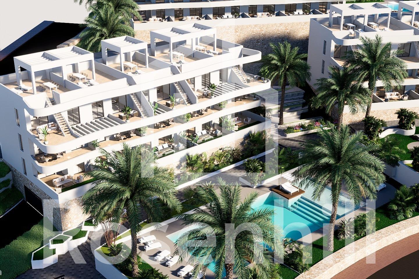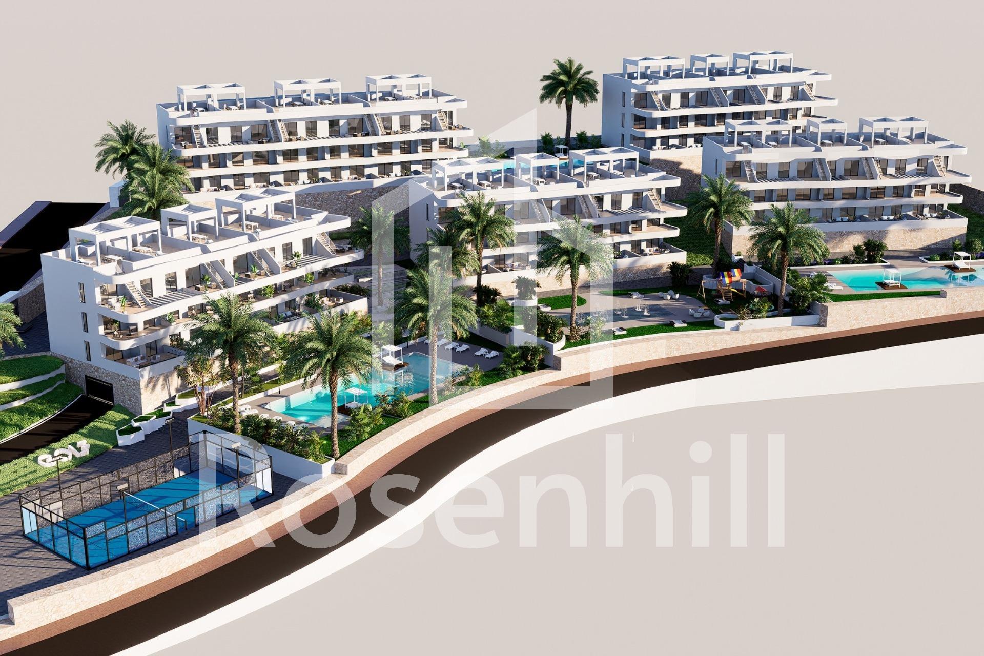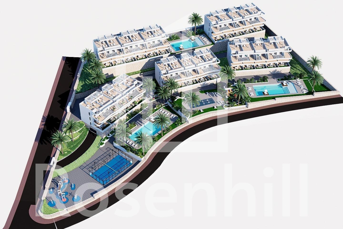 NEW BUILD RESIDENTIAL COMPLEX IN FINESTRAT New Build residential complex in Balcon de Finestrat. This complex of modern apartments with 2 bedrooms, 2 bathrooms, open plan kitchen with the living area. Some of the apartments will have sea views. Ground floor apartment with a private gardens, middle floor apartments with the terraces and top floor apartments has a terraces and private solariums. Each property has private underground parking space. The properties have access to the communal area with 3 swimming pools, parking, paddle, playground, calisthenics. It is a great opportunity and privilege to be able to live with this environment of golf and beach, close to all amenities of all services considered one of the best places to invest. Finestrat located in the Marina Baixa region of the Costa Blanca. Benidorm is just a five-minute drive from the properties and offers all the services you would need including shops, bars, restaurants, supermarkets, banks, pharmacies and several private international schools. Close to the beaches of Levante, Poniente and Cala de Finestrat, with more than 6km in length that are among the best in Europe awarded by the European Union with Blue Flags. All leisure services such as the theme parks of Aqua Natura, Terra Mítica, Terra Natura, Aqualandia and Mundomar, Sierra Cortina and Villaitana Golf courses, hiking and climbing in Puig Campana an incomparable natural setting or enjoy of nautical sports. Distance to the sea 4 km, to the airport 26 km and to the golf 1km.