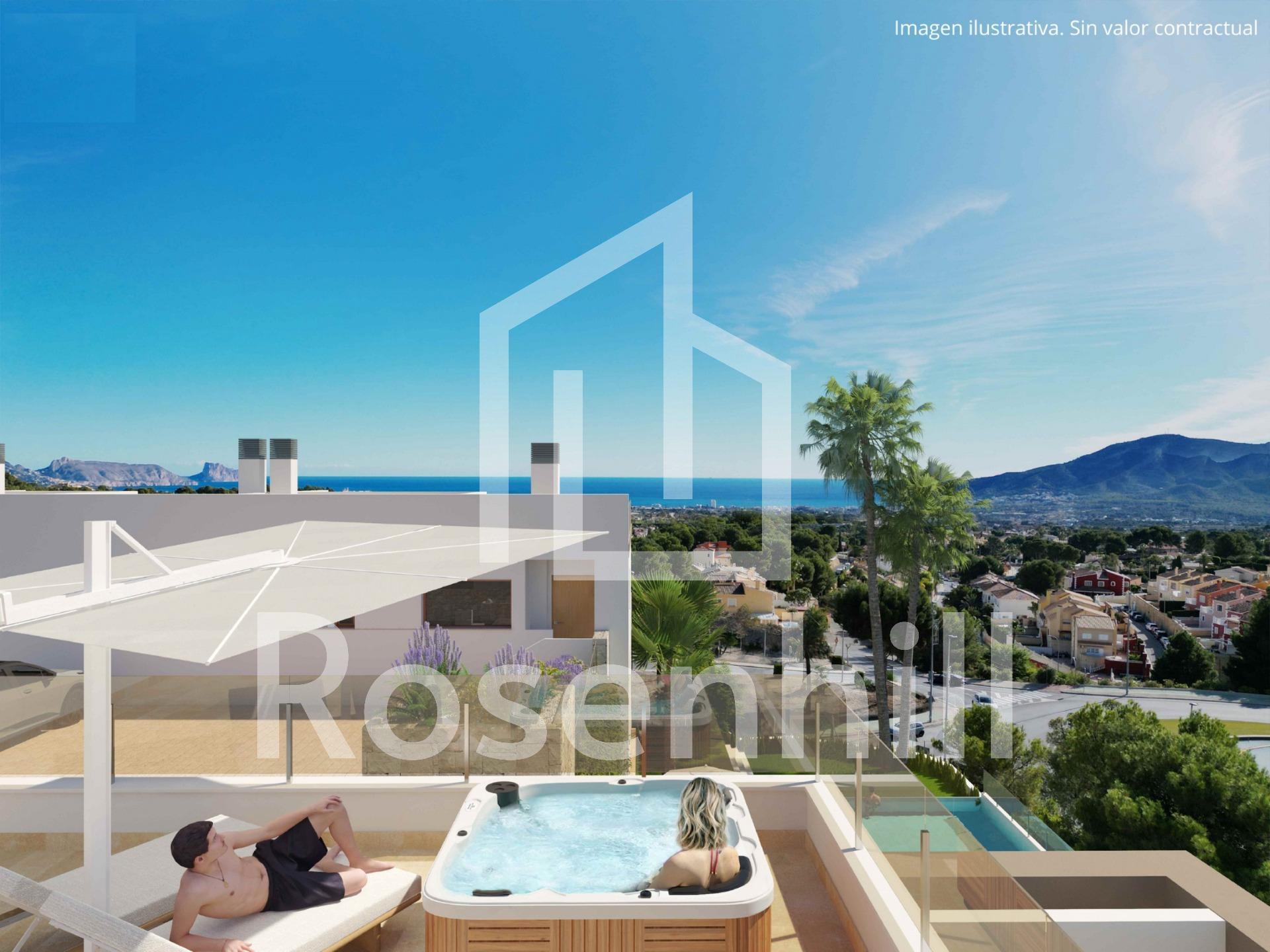 NEW BUILD RESIDENTIAL COMPLEX IN LA NUCIA New Build residential complex of independent and semi-detached villas with communal pool in La Nucia. Development of contemporary design and construction where you can enjoy the climate, excellent sunshine, spectacular views of the bays of Benidorm and Albir and a healthy lifestyle. Close to all services and the sports city of La Nucia. The sizes of the modern properties and their configuration make them ideal for clients who need more space, who want to make part of their properties profitable for renting while they continue to have their own homes, or who want a space for games, an office or an area for the youngest members of the family. The properties build over 3 floors, has 4 bedrooms, 3 bathrooms, guest toilet, open plan kitchen with the lounge area, fitted wardrobes, several terraces with views, parking for two vehicles and a garden with direct access to the communal areas. Many of them also have a solarium where you can enjoy evenings outdoors with your friends. La Nucía is a municipality in the comarca of Marina Baixa, Alicante. It borders the municipalities of Altea, Callosa d’En Sarrià, Benidorm, Polop and L’Alfàs del Pi. La Nucia is located in a fruit valley between Benidorm and Callosa d’En Sarrià, 3 km from the coast of Altea. The urban center is on a promontory overlooking the Mediterranean Sea, 51 km north of Alicante and 8 km north of Benidorm.