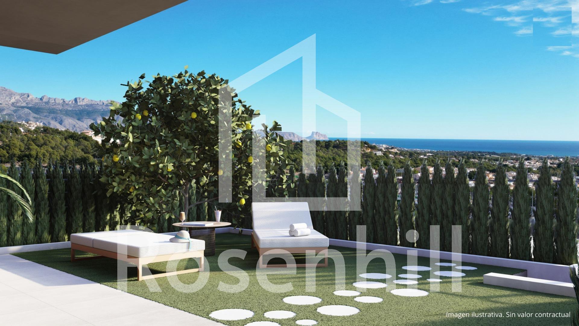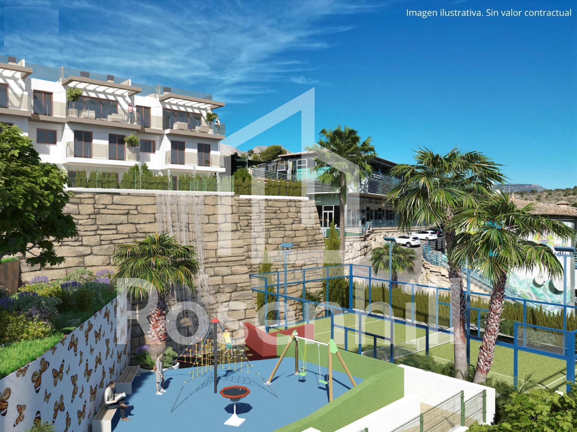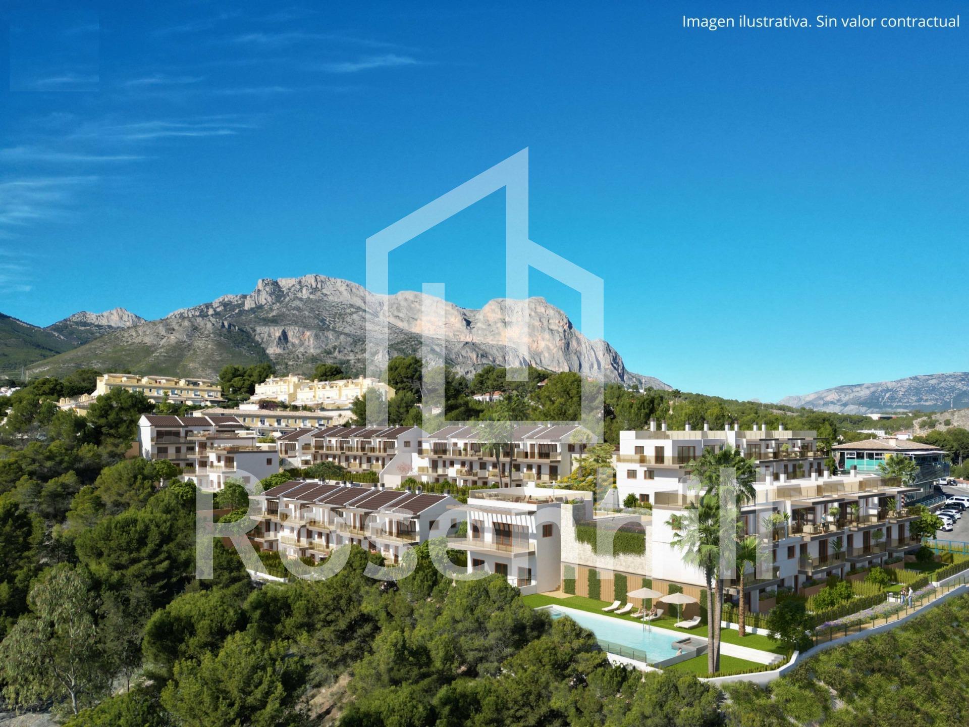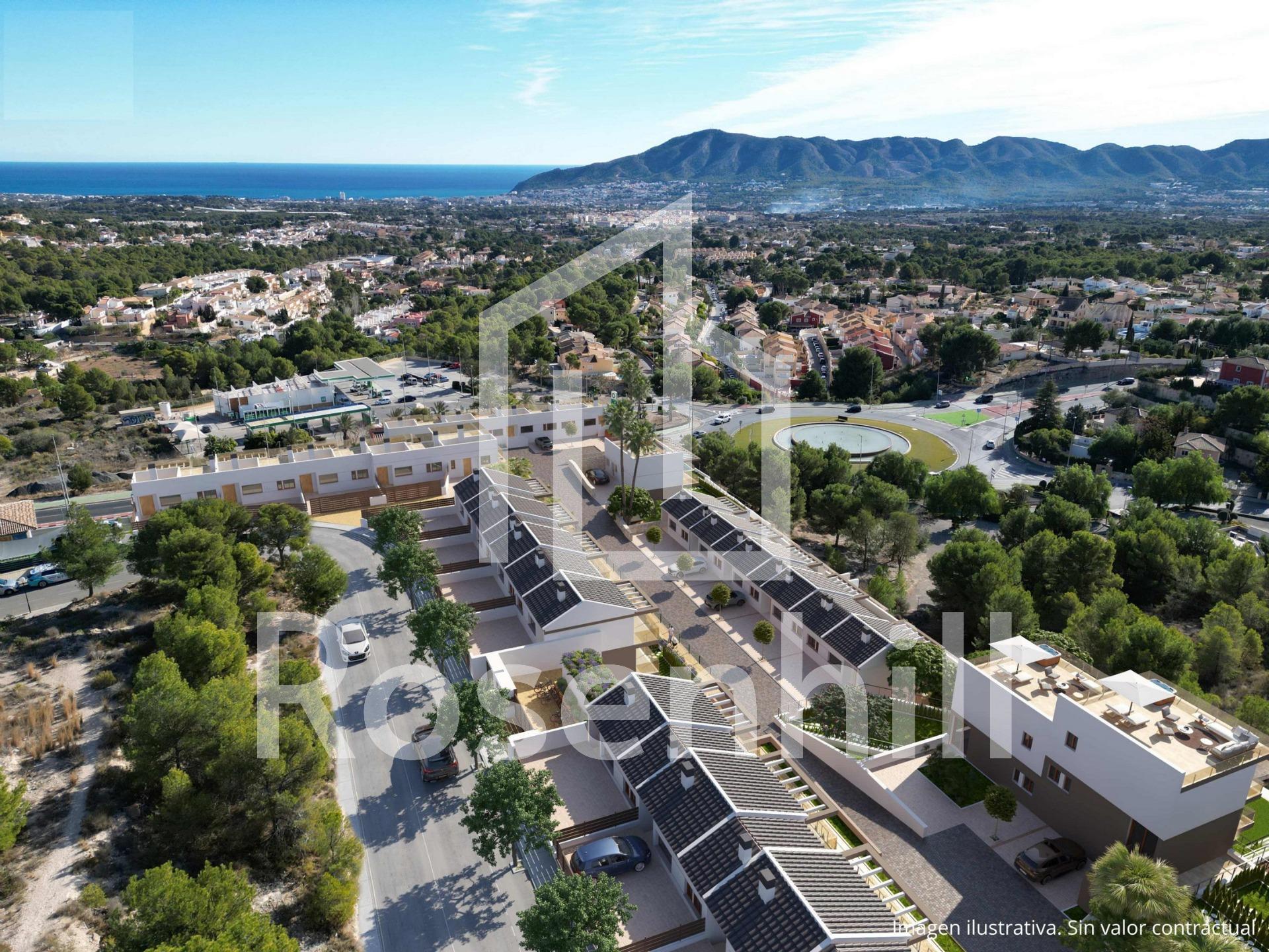 NEW BUILD RESIDENTIAL COMPLEX IN LA NUCIA New Build residential complex of independent and semi-detached villas with communal pool in La Nucia. Development of contemporary design and construction where you can enjoy the climate, excellent sunshine, spectacular views of the bays of Benidorm and Albir and a healthy lifestyle. Close to all services and the sports city of La Nucia. The sizes of the modern properties and their configuration make them ideal for clients who need more space, who want to make part of their properties profitable for renting while they continue to have their own homes, or who want a space for games, an office or an area for the youngest members of the family. The properties build over 3 floors, has 4 bedrooms, 3 bathrooms, guest toilet, open plan kitchen with the lounge area, fitted wardrobes, several terraces with views, parking for two vehicles and a garden with direct access to the communal areas. Many of them also have a solarium where you can enjoy evenings outdoors with your friends. La Nucía is a municipality in the comarca of Marina Baixa, Alicante. It borders the municipalities of Altea, Callosa d’En Sarrià, Benidorm, Polop and L’Alfàs del Pi. La Nucia is located in a fruit valley between Benidorm and Callosa d’En Sarrià, 3 km from the coast of Altea. The urban center is on a promontory overlooking the Mediterranean Sea, 51 km north of Alicante and 8 km north of Benidorm.