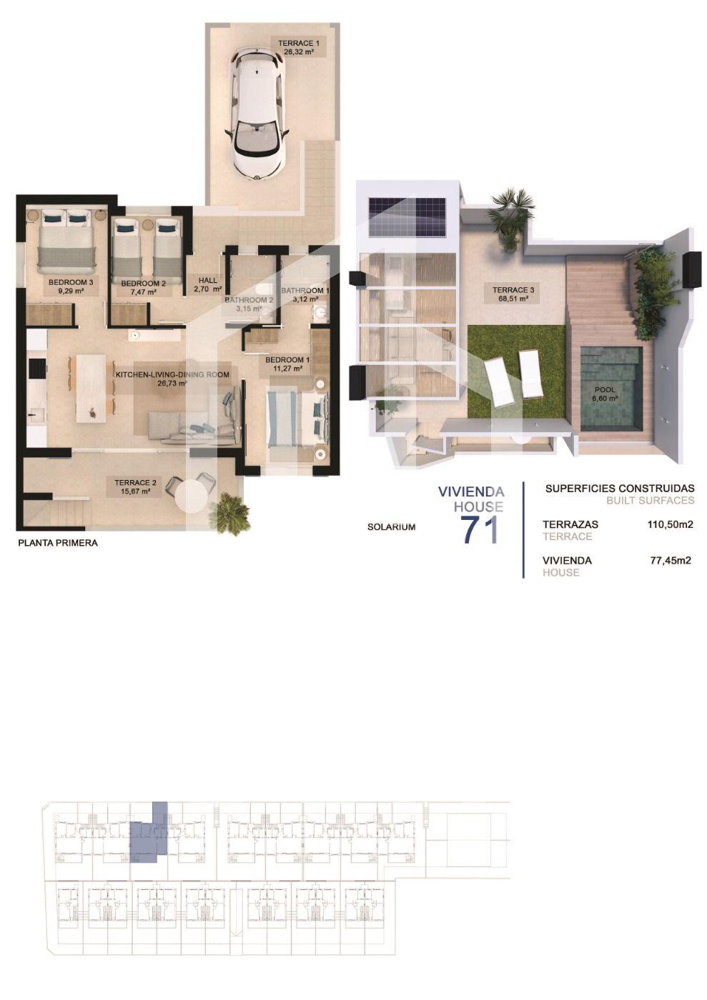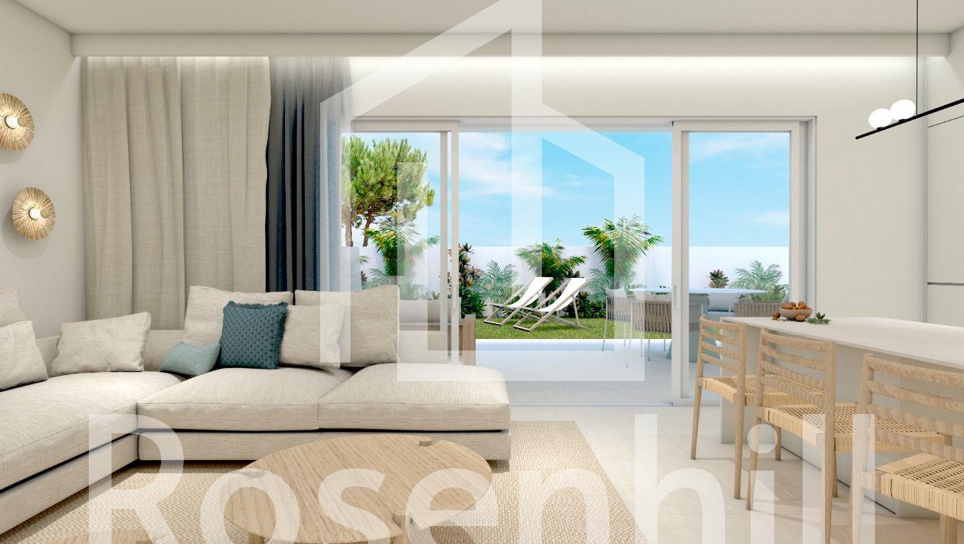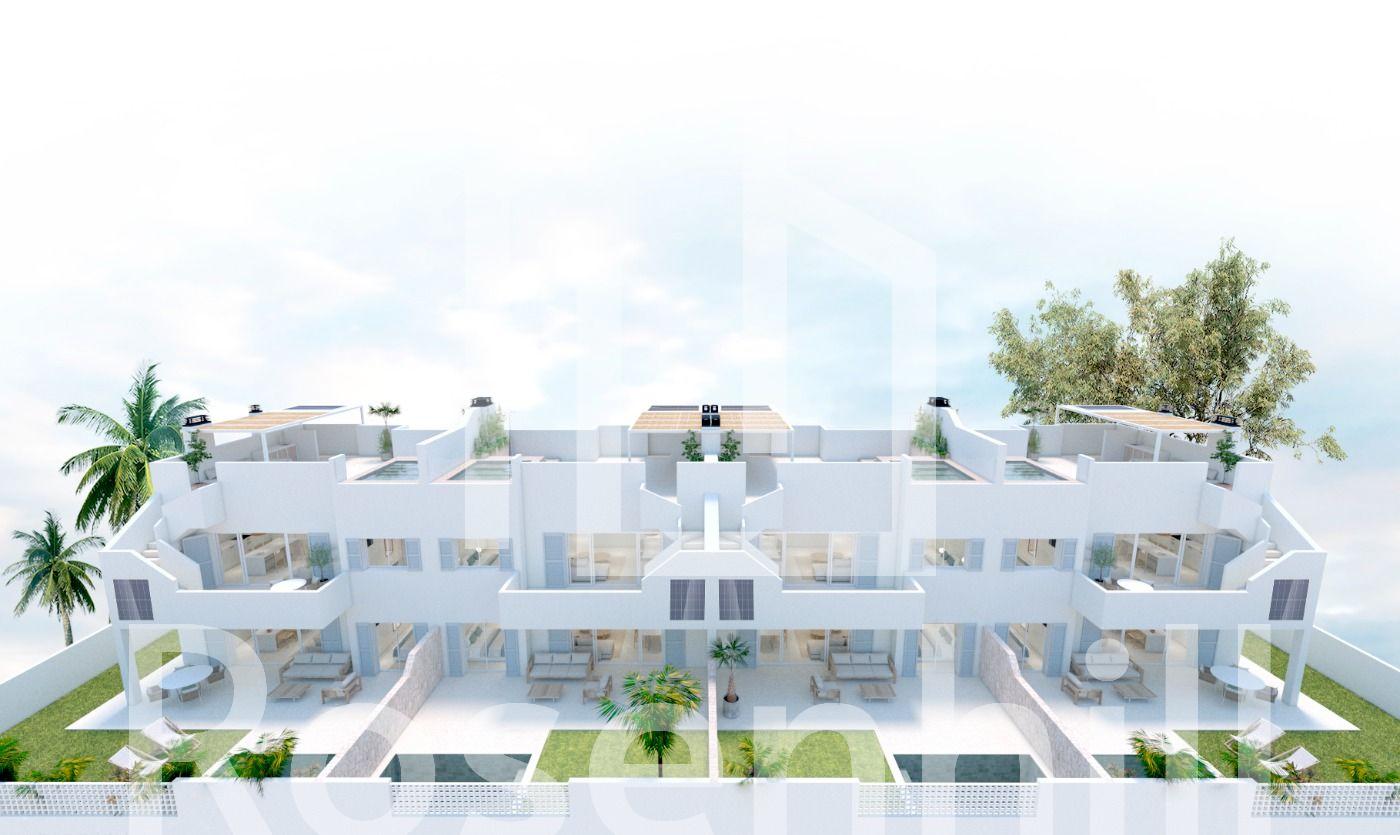 NEW BUILD RESIDENTIAL COMPLEX IN TORRE DE LA HORADADA New Build residential complex of bungalow apartments in Torre de la Horadada only 450m from the beach. All properties has 3 bedrooms, 2 bathrooms, open plan kitchen with the lounge area, fitted wardrobes and terrace. Beautiful bungalows on the ground floor has private garden with the pool, bungalow on the top floor has private solarium with the pool. All properties has private parking. Torre de la Horadada is located south of Alicante in a beautiful location on the coast. The beautiful beaches of Torre de la Horadada and Mil Palmeras have fine sand beautiful promenade. There are lots of restaurants, bars and shops, also water sports, diving and snorkelling. It is well connected just 40 minutes from Alicante and Murcias Corvera airports, with large commercial shopping centres and multiple golf courses all within easy reach.