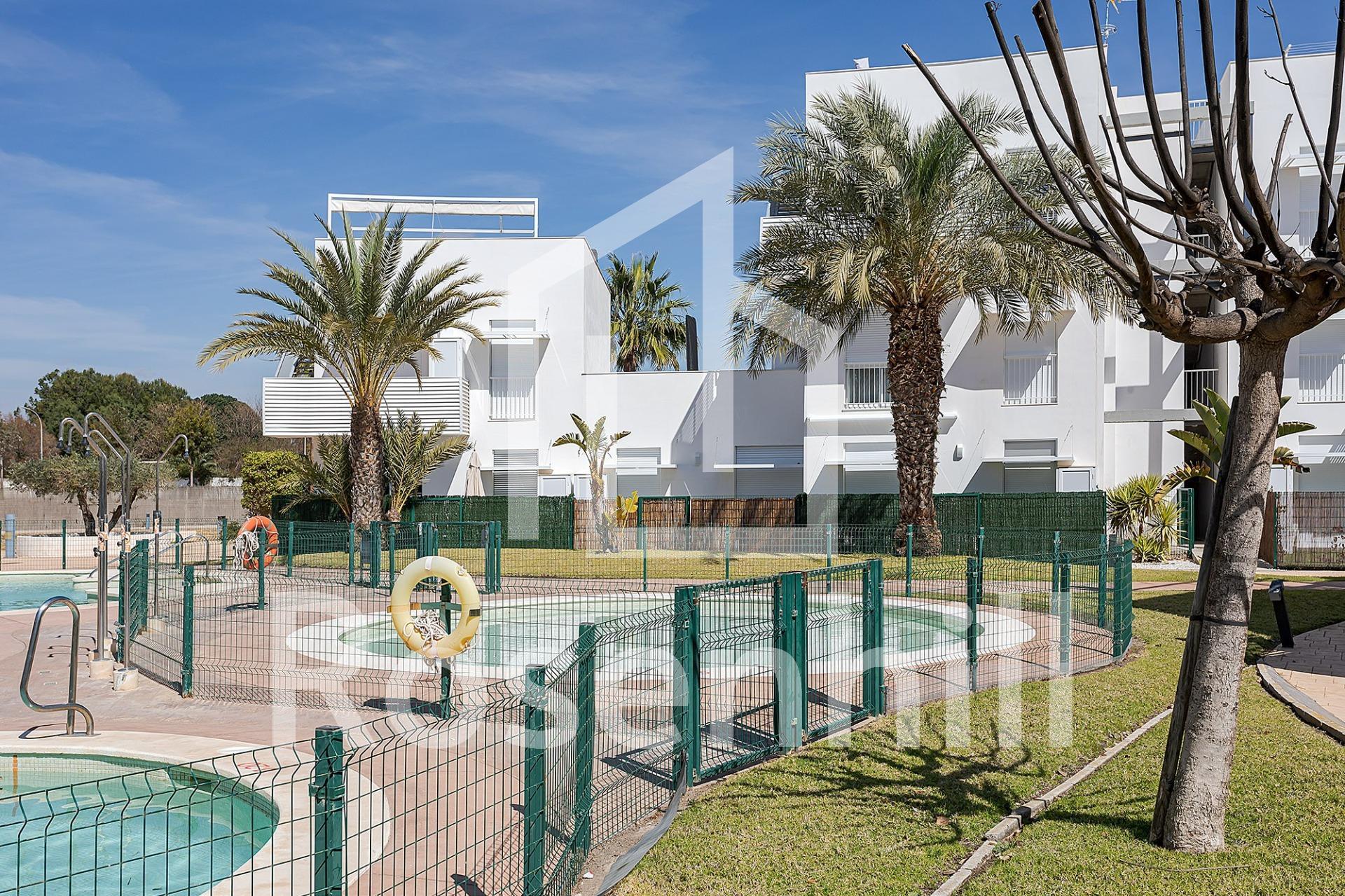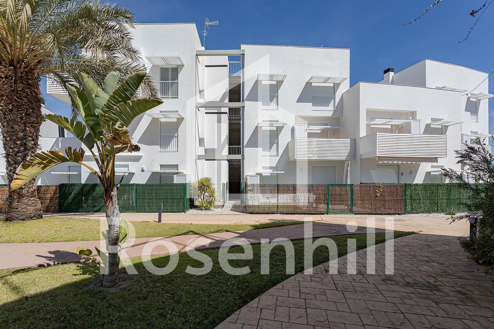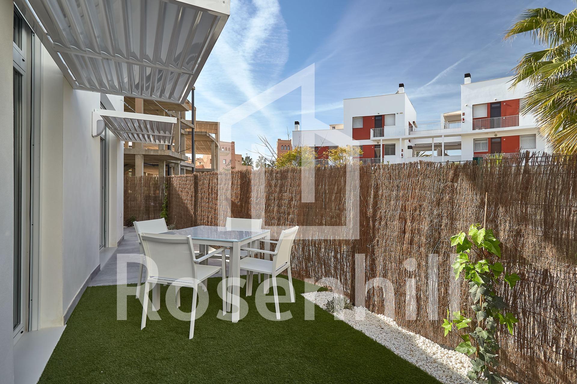 NEW BUILD RESIDENTIAL COMPLEX IN VERA New Build residential of apartments in Vera just 400m from the huge Vera beach named “El Playazo”. The typologies are ground floor with two private gardens, one in each orientation, which allows you to enjoy sun or shade whenever you want depending on the time of day or the season of the year. The first floors have terraces and the penthouses have large solariums. All the apartments have extra height ceilings (2.95 m) providing a great feeling of spaciousness. The kitchen comes fully furnished and equipped integrated with the living-dining area with a bar area. The doors and fitted wardrobes are lacquered in white and the floor is made of laminated wood. The hot-cold air conditioning and the hot water are generated by a state-of-the-art DAIKIN Aerothermal device, a technology that saves up to 70% of electricity consumption compared to traditional systems. All bathrooms come with a shower instead of a bathtub, with recessed mirrors and also with a stone countertop and glass partition in the main bathroom. The blinds in the living room and master bedroom are electric, hermetically sealed and with adjustable slats. The gardens and solarium are delivered with the floors finished combining artificial grass and a beautiful paving imitating wood. Each house includes a private outdoor parking space. Each block of the promotion has an independent elevator. Both the buildings and the apartments have a series of bioclimatic architecture characteristics (orientation, insulation, windows and shutters, pergolas) that allow optimal natural regulation of ventilation, temperature and light throughout the different seasons of the year. The communal areas are made up of pedestrian squares and green areas, with a large swimming pool for adults and another for children in the central square. The entire urbanization is free of architectural barriers for the disabled. Here tranquillity and relaxation are guaranteed. Vera is one of the best naturist places in Europe, recognized for the quality and purity of their waters. It offers six kilometres of beaches (Las Marinas-Bolaga, Puerto Rey, El Playazo, Quitapellejos). Vera bordering with the famous tourist destinations such as Mojacar and the Almanzora Caves. Residential complex located about 1,5 hour drive away from Murcia – Corvera airport and about 2 hours away from Alicante airport.