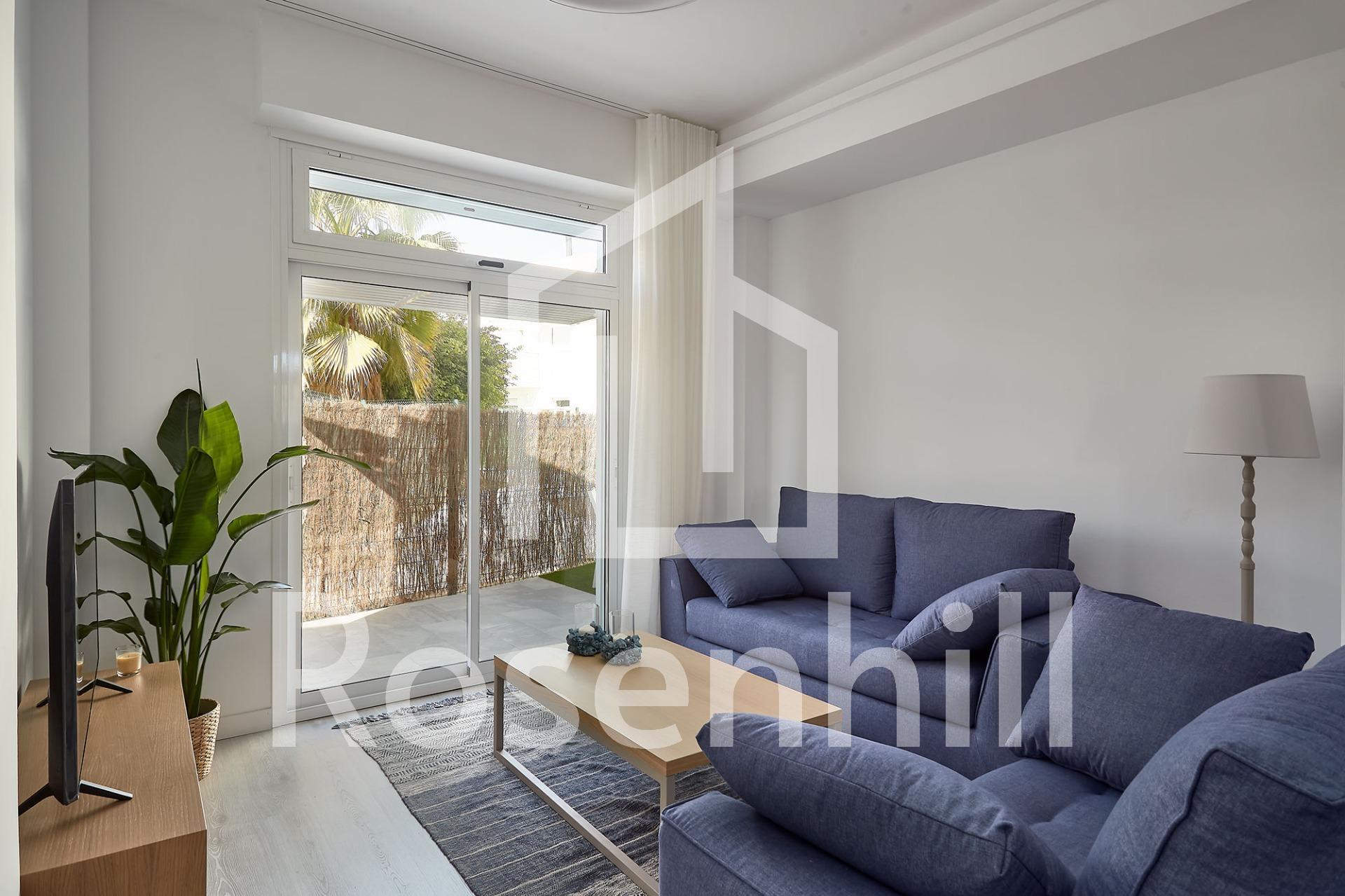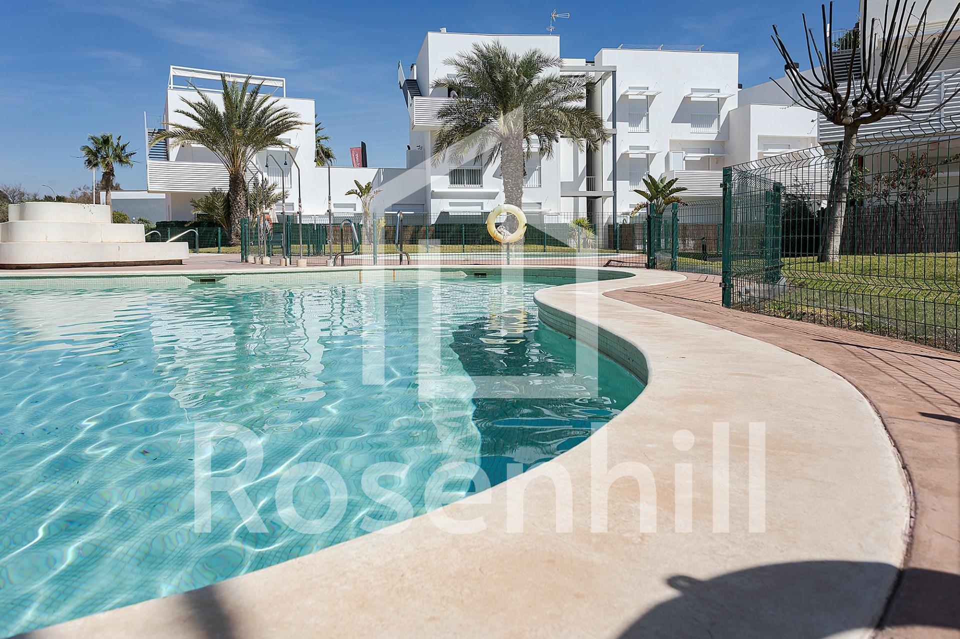 NEW BUILD RESIDENTIAL COMPLEX IN VERA New Build residential of apartments in Vera just 400m from the huge Vera beach named “El Playazo”. The typologies are ground floor with two private gardens, one in each orientation, which allows you to enjoy sun or shade whenever you want depending on the time of day or the season of the year. The first floors have terraces and the penthouses have large solariums. All the apartments have extra height ceilings (2.95 m) providing a great feeling of spaciousness. The kitchen comes fully furnished and equipped integrated with the living-dining area with a bar area. The doors and fitted wardrobes are lacquered in white and the floor is made of laminated wood. The hot-cold air conditioning and the hot water are generated by a state-of-the-art DAIKIN Aerothermal device, a technology that saves up to 70% of electricity consumption compared to traditional systems. All bathrooms come with a shower instead of a bathtub, with recessed mirrors and also with a stone countertop and glass partition in the main bathroom. The blinds in the living room and master bedroom are electric, hermetically sealed and with adjustable slats. The gardens and solarium are delivered with the floors finished combining artificial grass and a beautiful paving imitating wood. Each house includes a private outdoor parking space. Each block of the promotion has an independent elevator. Both the buildings and the apartments have a series of bioclimatic architecture characteristics (orientation, insulation, windows and shutters, pergolas) that allow optimal natural regulation of ventilation, temperature and light throughout the different seasons of the year. The communal areas are made up of pedestrian squares and green areas, with a large swimming pool for adults and another for children in the central square. The entire urbanization is free of architectural barriers for the disabled. Here tranquillity and relaxation are guaranteed. Vera is one of the best naturist places in Europe, recognized for the quality and purity of their waters. It offers six kilometres of beaches (Las Marinas-Bolaga, Puerto Rey, El Playazo, Quitapellejos). Vera bordering with the famous tourist destinations such as Mojacar and the Almanzora Caves. Residential complex located about 1,5 hour drive away from Murcia – Corvera airport and about 2 hours away from Alicante airport.