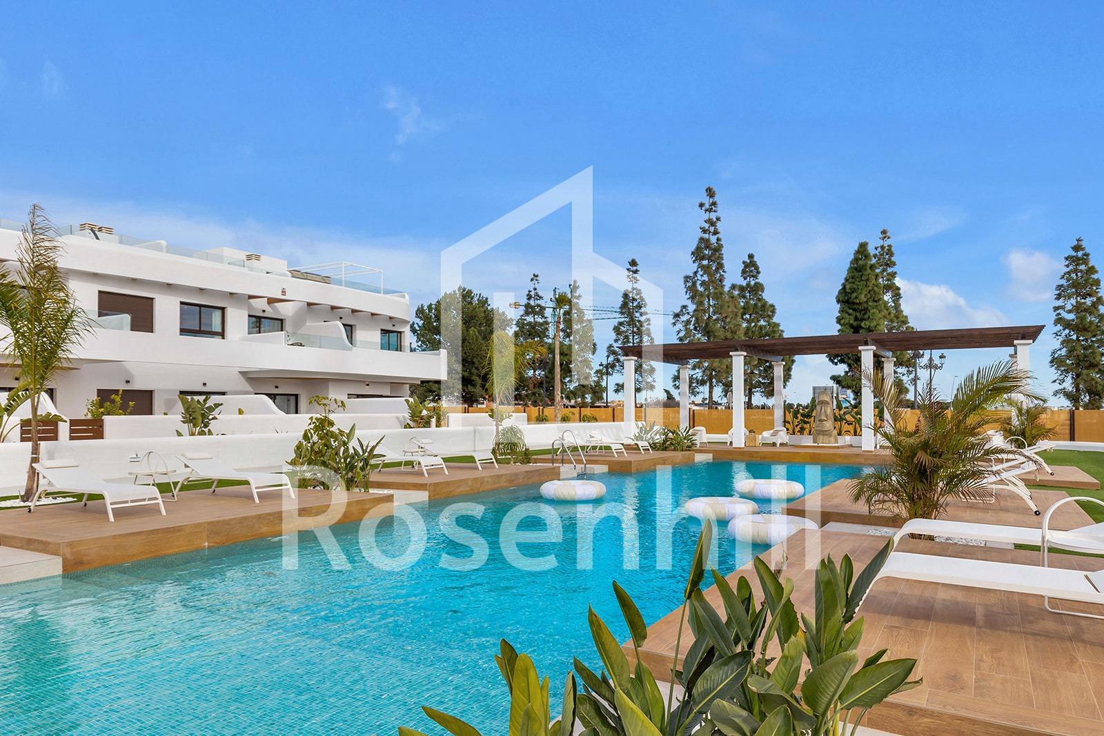New Build Residential Complex Near Serena Golf and the Mar Menor in Los Alcazares Modern Coastal Living on the Costa Calida Discover this attractive new build residential complex located in Los Alcazares, one of the most popular seaside towns on the Costa Calida. Situated just 500 m from the beaches of the Mar Menor and within walking distance of the town center, this development offers an excellent combination of coastal living, golf surroundings and everyday convenience. Los Alcazares is well known for its relaxed atmosphere, long promenades, warm shallow waters and a wide range of restaurants, shops and services open all year round. Contemporary Apartments Designed for Comfort The development consists of 29 modern homes with 2 or 3 bedrooms, designed with clean architectural lines and high quality finishes. Buyers can choose between ground floor apartments with private garden and terrace, middle floor homes with spacious terraces, or penthouses with private terrace and rooftop solarium offering open views. Many of the properties enjoy views towards Serena Golf and the Mar Menor, creating a calm and pleasant living environment. All homes are designed to maximize natural light and functionality, making them ideal as a permanent residence, holiday home or investment property. High Quality Features and Communal Areas Each property includes a private parking space and a storage room. The specifications are designed to provide comfort and energy efficiency, including double glazed windows with thermal break, pre installation of ducted air conditioning, aerothermal system for domestic hot water, electric shutters in bedrooms and a complete interior and exterior lighting package. Bathrooms are delivered fully equipped with furniture, mirror and shower screen. Residents can enjoy attractive communal areas with landscaped gardens and a communal swimming pool, perfect for relaxing and enjoying the Mediterranean climate. Selected blocks are equipped with lifts for added convenience. Prime Location Between Golf and Sea This residential complex enjoys a privileged location next to Serena Golf, one of the most renowned golf courses in the area, and just a short walk from the calm waters of the Mar Menor. The area is ideal for swimming, sailing, paddleboarding and other water sports throughout the year. Key distances include Mar Menor beaches at 0.5 km, Serena Golf directly next to the development, Los Alcazares town center at 2 km, Cartagena at 22 km and Murcia city at 40 km. Murcia Corvera Airport is approximately 30 km away and Alicante Airport is around 90 km. An Ideal Home or Investment Opportunity With its excellent location, modern design and proximity to both golf and the sea, this new residential complex in Los Alcazares offers an outstanding lifestyle opportunity on the Costa Calida. Contact us today to receive more information or to arrange a private viewing and secure your new home by the Mar Menor.