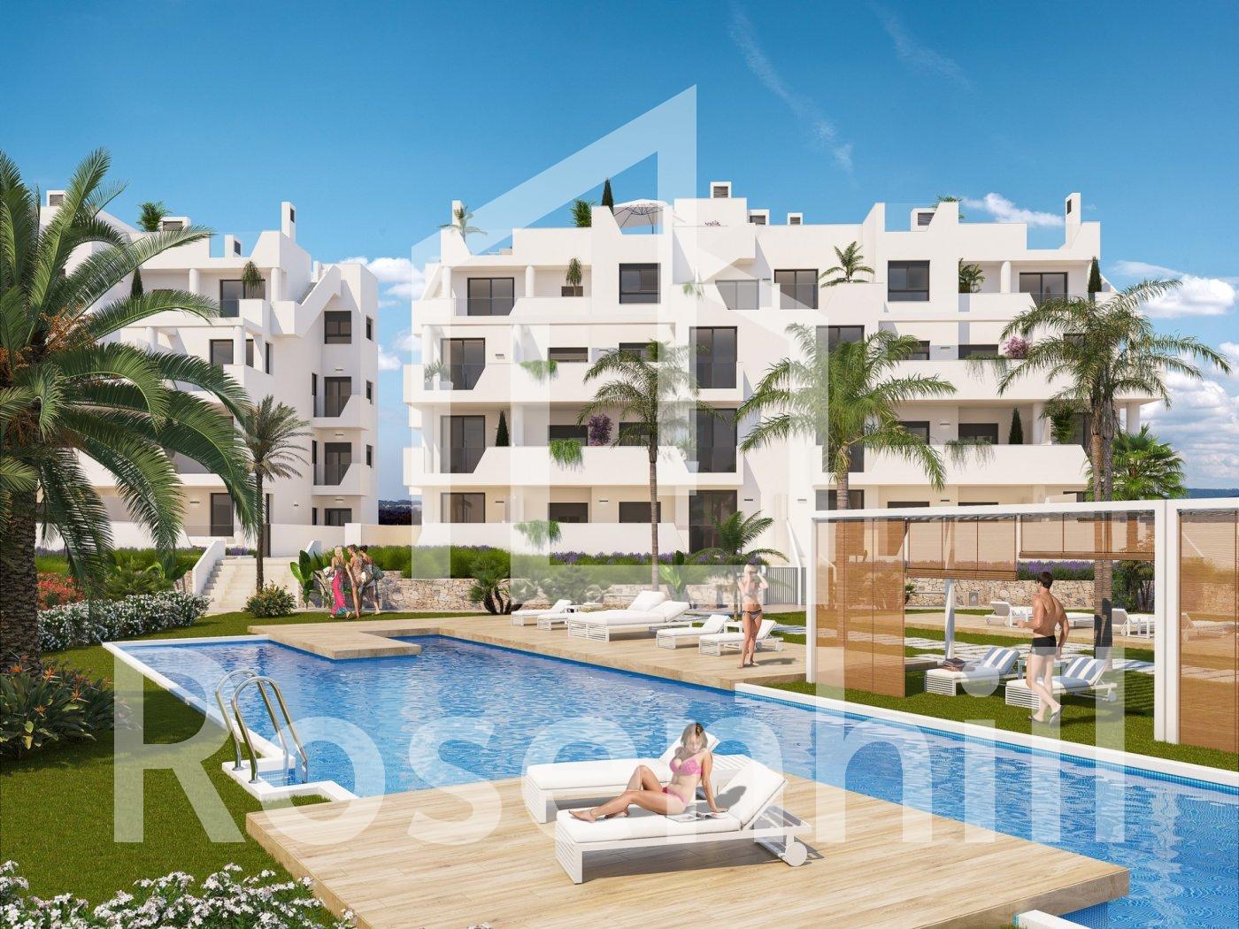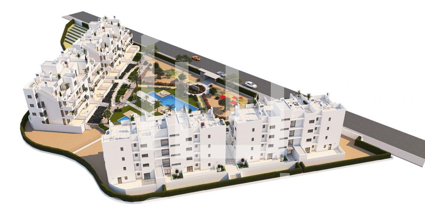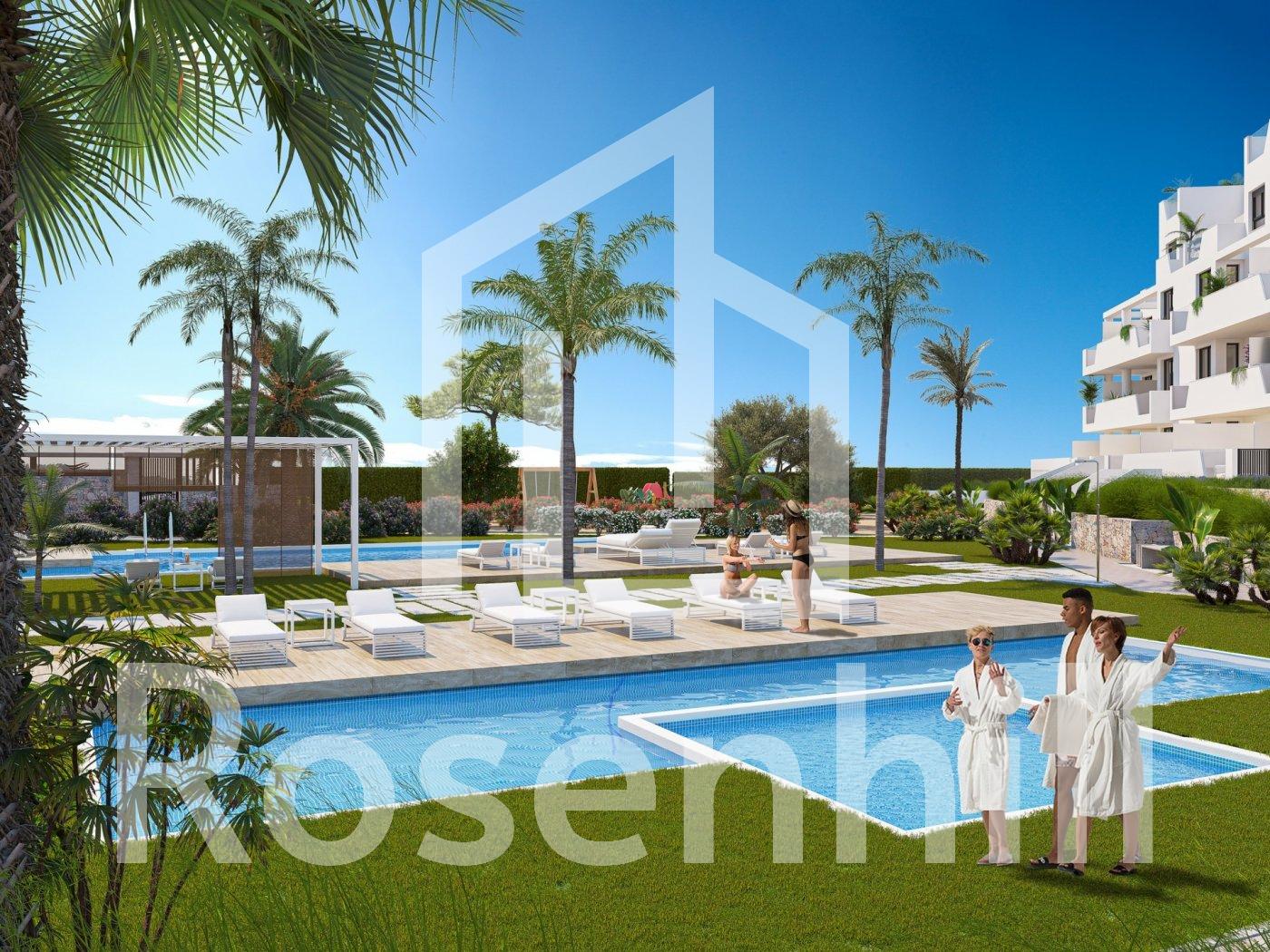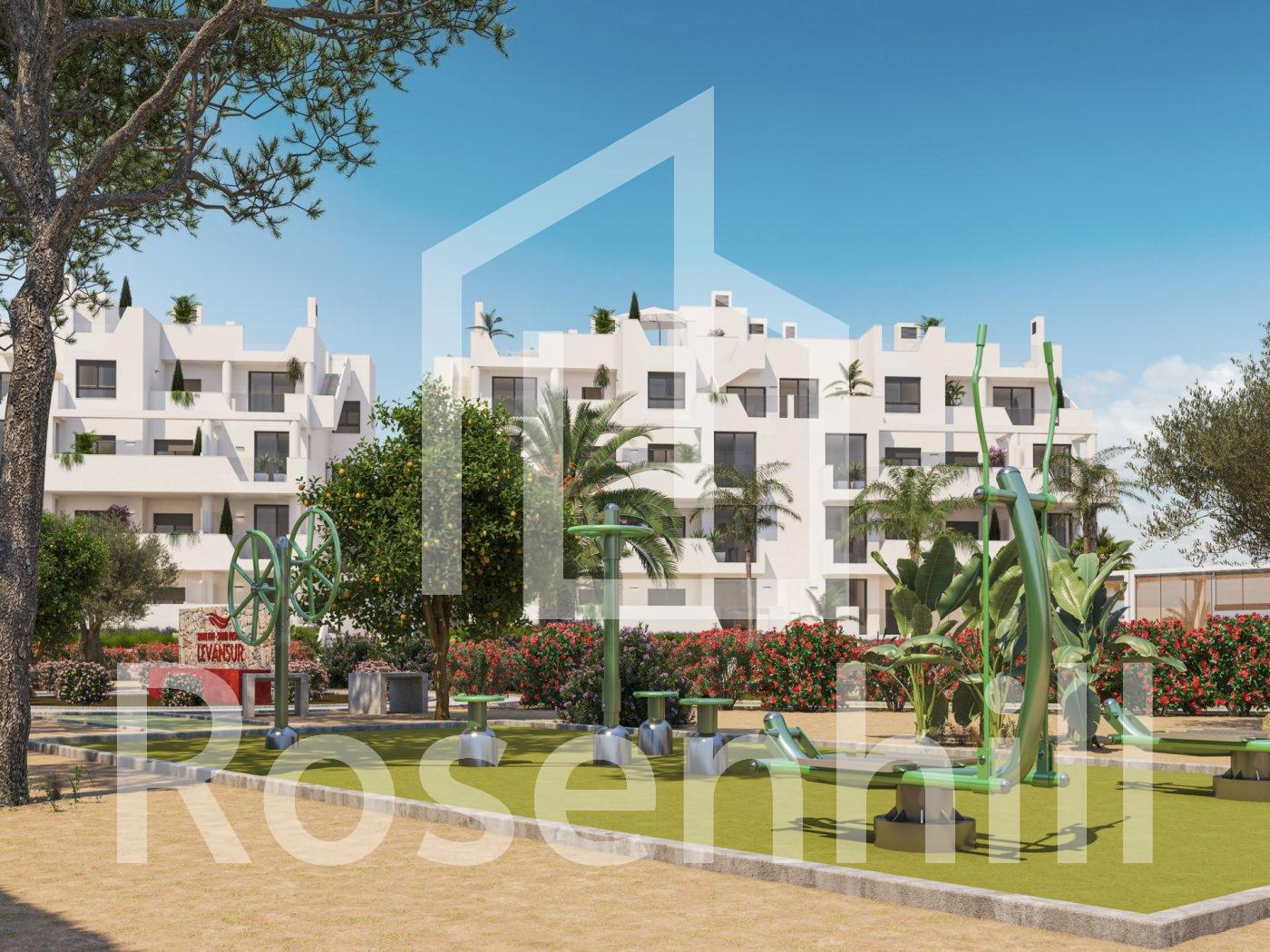 NEW BUILD RESIDENTIAL IN PRIVATE GATED RESORT IN PROVINCE OF MURCIA New Build residential complex has 60 apartments distributed in 4 blocks with terraced area for ground, first and second floors, community swimming pool, heated swimming pool and solarium with Summer kitchen on the penthouses, to enjoy all hours of sunshine every day of the year. The properties have 2 bedrooms and 2 bathrooms as well as parking space and storage room in the basement. These homes are designed with a contemporary style and open planned concept, comprising a fully-fitted kitchen and lounge-dining room. The properties will meet the highest standards and included: Kitchen completely furnished and equipped with oven and microwave in column, integrated fridge and dishwasher, induction hob and extractor fan. LED Lighting: inside the property (dining room, kitchen, corridors and bathrooms), and as well as in outdoor areas. Lined wardrobes with drawers. Motorised blinds in bedrooms. Heated floors in bathrooms. Fully fitted bathrooms with toilet, vanity unit, mirror, shower with rain effect and screen panels. Pre-installation for ducted air conditioning. Pre-installation of charging point for electric vehicles. Solarium with Summer kitchen, with pre-installation for electric appliances. Community swimming pool. Heated swimming pool. Parking space and storage room in the basement. Located in a private gated resort, with a main access entrance and 24 hours security. The resort is designed around an impressive 126.000 m2 green area. It comprises walking and cycling paths, sport facilities, paddle and tennis courts, a mini-golf course, gardens, dog parks, leisure areas, clubhouse…. Also in the central area is the jewel of the resort, a crystal-clear artificial lake of almost 17.000m2 of water surface, surrounded by white sandy beaches and palm trees, bringing a piece of the Caribbean to the Murcia Region. There are 2 islands in the lake, one of them has its own bar, there are also “beach Chiringuitos” spread around the lake. The resort is strategically located less than 4 km from the beach and the town of Los Alcázares, where you can practice various water sports, surrounded by several golf courses and the city of Cartagena less than 15 minutes by car and 22 km from Murcia airport, therefore having a wide cultural, gastronomic and sports offer within reach.