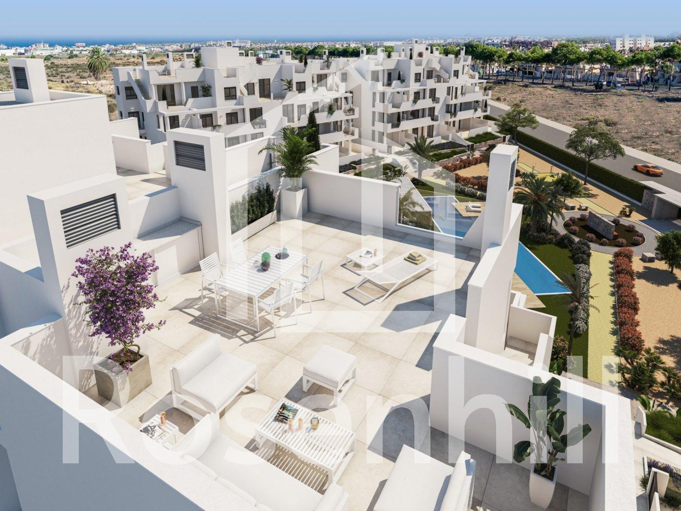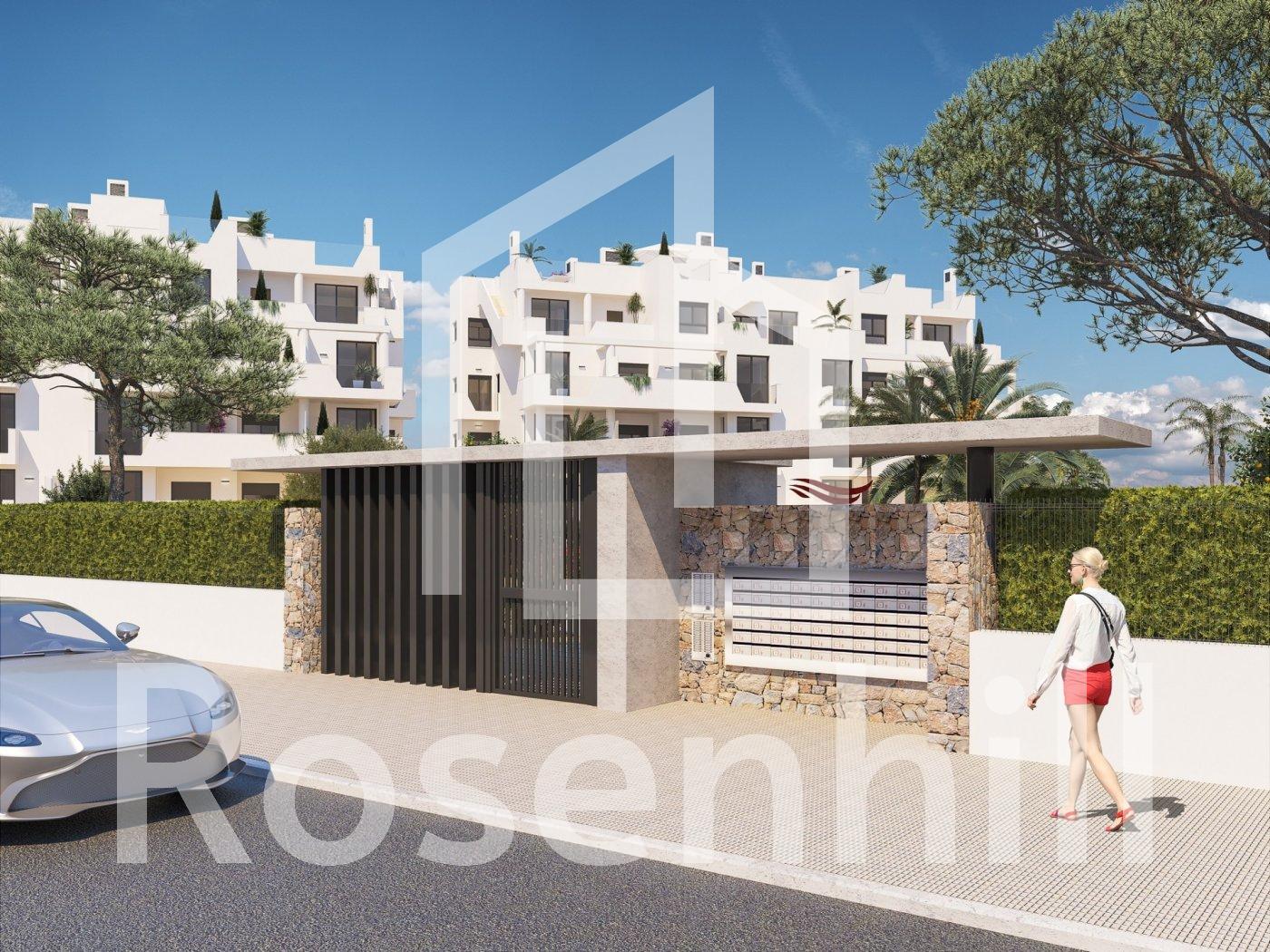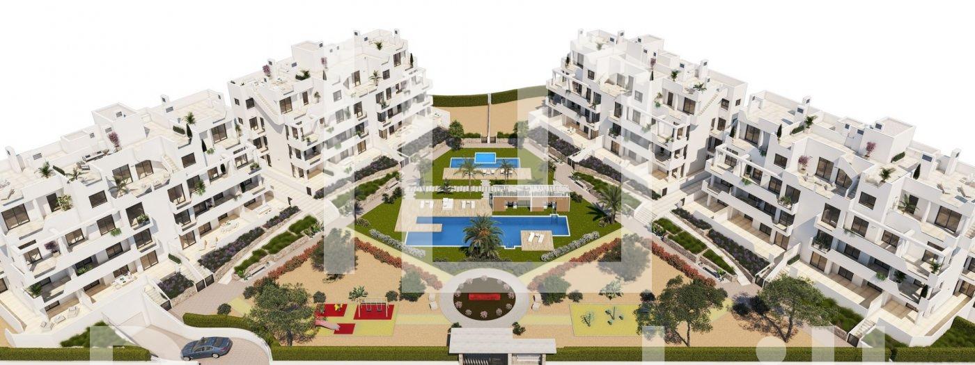 NEW BUILD RESIDENTIAL IN PRIVATE GATED RESORT IN PROVINCE OF MURCIA New Build residential complex has 60 apartments distributed in 4 blocks with terraced area for ground, first and second floors, community swimming pool, heated swimming pool and solarium with Summer kitchen on the penthouses, to enjoy all hours of sunshine every day of the year. The properties have 2 bedrooms and 2 bathrooms as well as parking space and storage room in the basement. These homes are designed with a contemporary style and open planned concept, comprising a fully-fitted kitchen and lounge-dining room. The properties will meet the highest standards and included: Kitchen completely furnished and equipped with oven and microwave in column, integrated fridge and dishwasher, induction hob and extractor fan. LED Lighting: inside the property (dining room, kitchen, corridors and bathrooms), and as well as in outdoor areas. Lined wardrobes with drawers. Motorised blinds in bedrooms. Heated floors in bathrooms. Fully fitted bathrooms with toilet, vanity unit, mirror, shower with rain effect and screen panels. Pre-installation for ducted air conditioning. Pre-installation of charging point for electric vehicles. Solarium with Summer kitchen, with pre-installation for electric appliances. Community swimming pool. Heated swimming pool. Parking space and storage room in the basement. Located in a private gated resort, with a main access entrance and 24 hours security. The resort is designed around an impressive 126.000 m2 green area. It comprises walking and cycling paths, sport facilities, paddle and tennis courts, a mini-golf course, gardens, dog parks, leisure areas, clubhouse…. Also in the central area is the jewel of the resort, a crystal-clear artificial lake of almost 17.000m2 of water surface, surrounded by white sandy beaches and palm trees, bringing a piece of the Caribbean to the Murcia Region. There are 2 islands in the lake, one of them has its own bar, there are also “beach Chiringuitos” spread around the lake. The resort is strategically located less than 4 km from the beach and the town of Los Alcázares, where you can practice various water sports, surrounded by several golf courses and the city of Cartagena less than 15 minutes by car and 22 km from Murcia airport, therefore having a wide cultural, gastronomic and sports offer within reach.