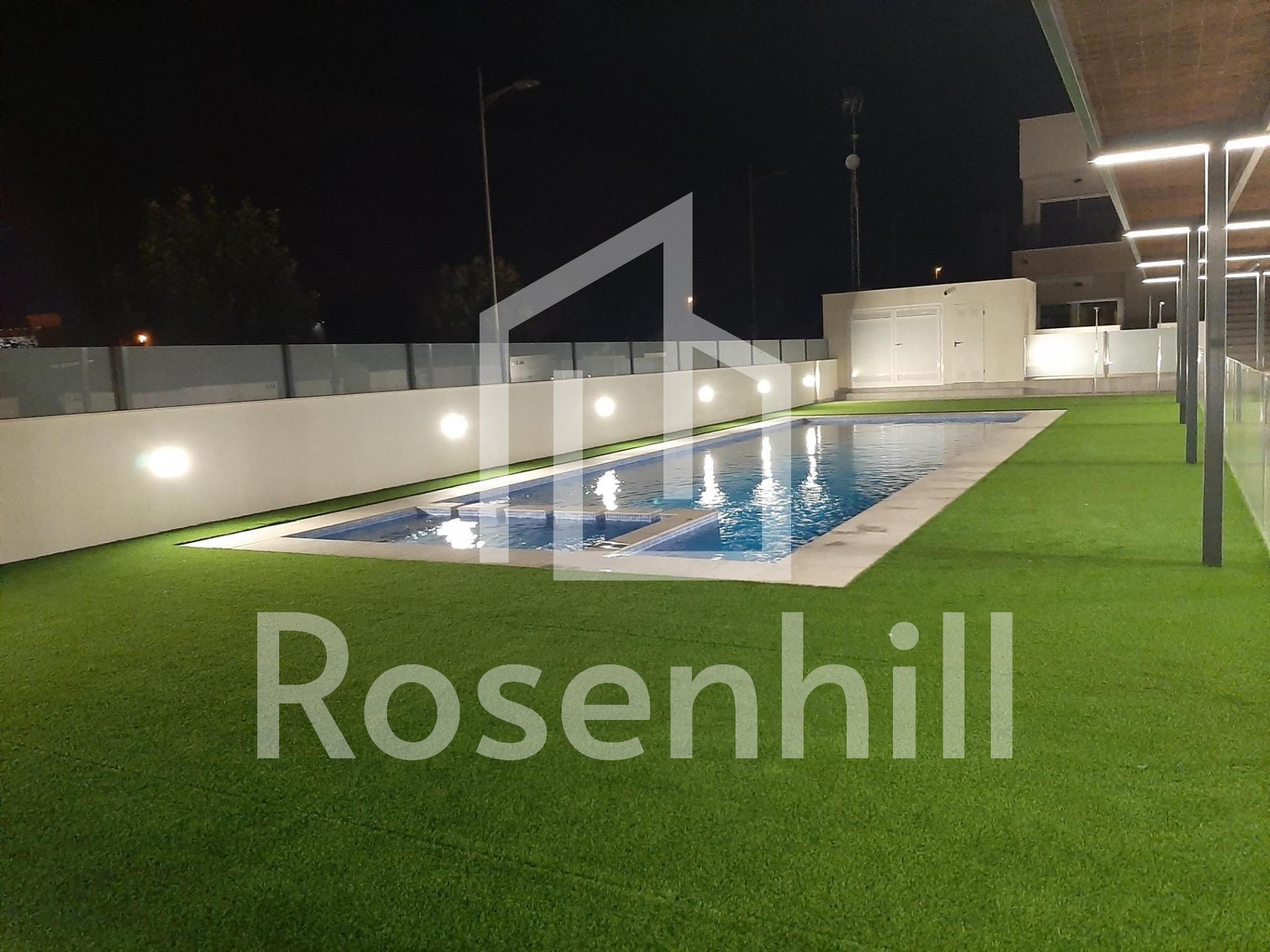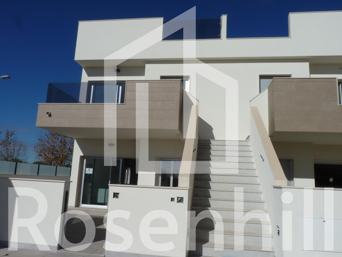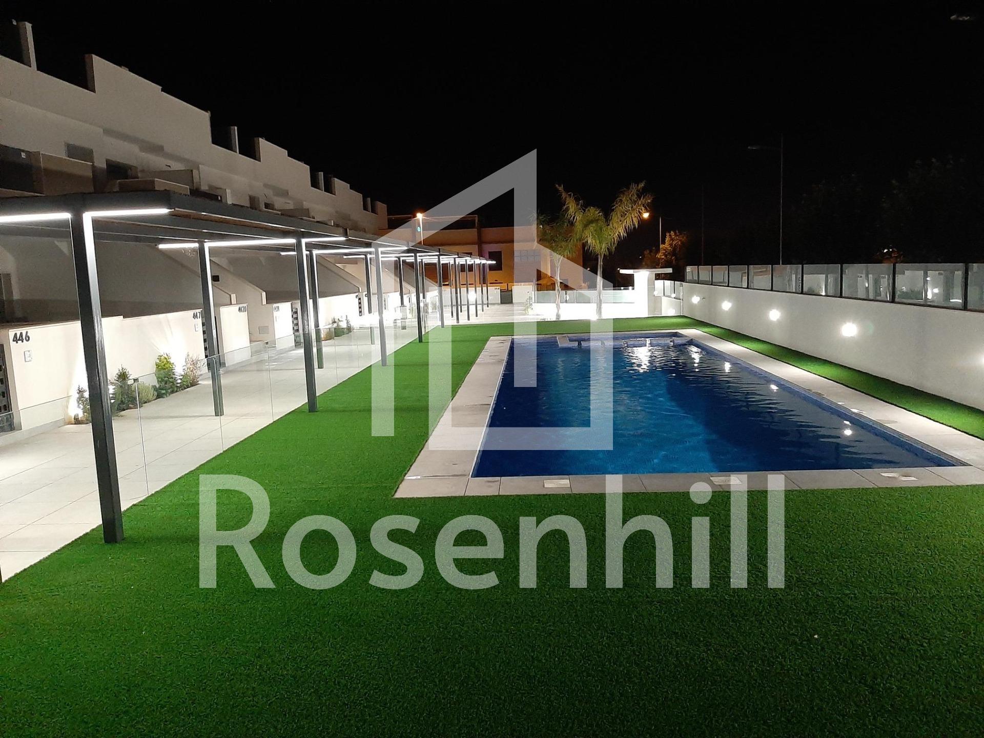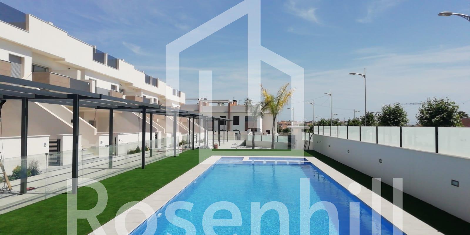 New-build residential complex of modern bungalows and townhouses in Pilar de la Horadada. The new-build townhouses have 3 bedrooms, 3 bathrooms, an open-plan kitchen with a spacious living-dining room, built-in wardrobes, and a terrace. All homes have a private parking space and storage room. Ground floor bungalows with private garden and top floor bungalows with private solarium All properties have a private parking space and storage. Pilar de la Horadada is a typical Spanish village in the most southern part of the Costa Blanca. The large main street has supermarkets, lots of shops, restaurants and bars and some lovely squares. The beautiful beaches of Torre de la Horadada and Mil Palmeras with fine sand promenade is just 5 minutes away. The airports of Corvera (Murcia) and Alicante are respectively 40 and 55 minutes away