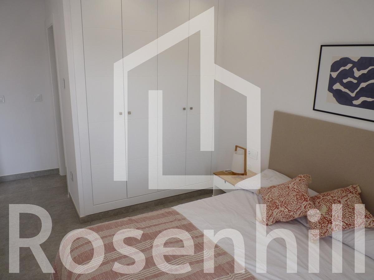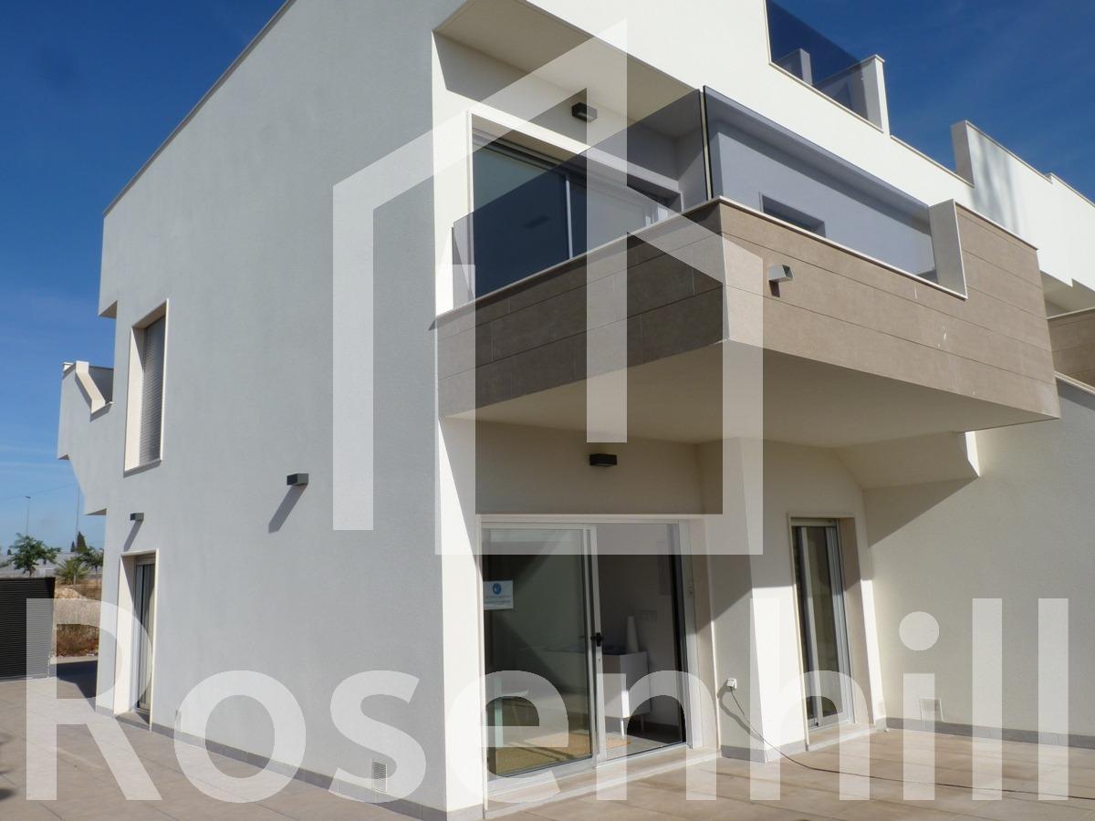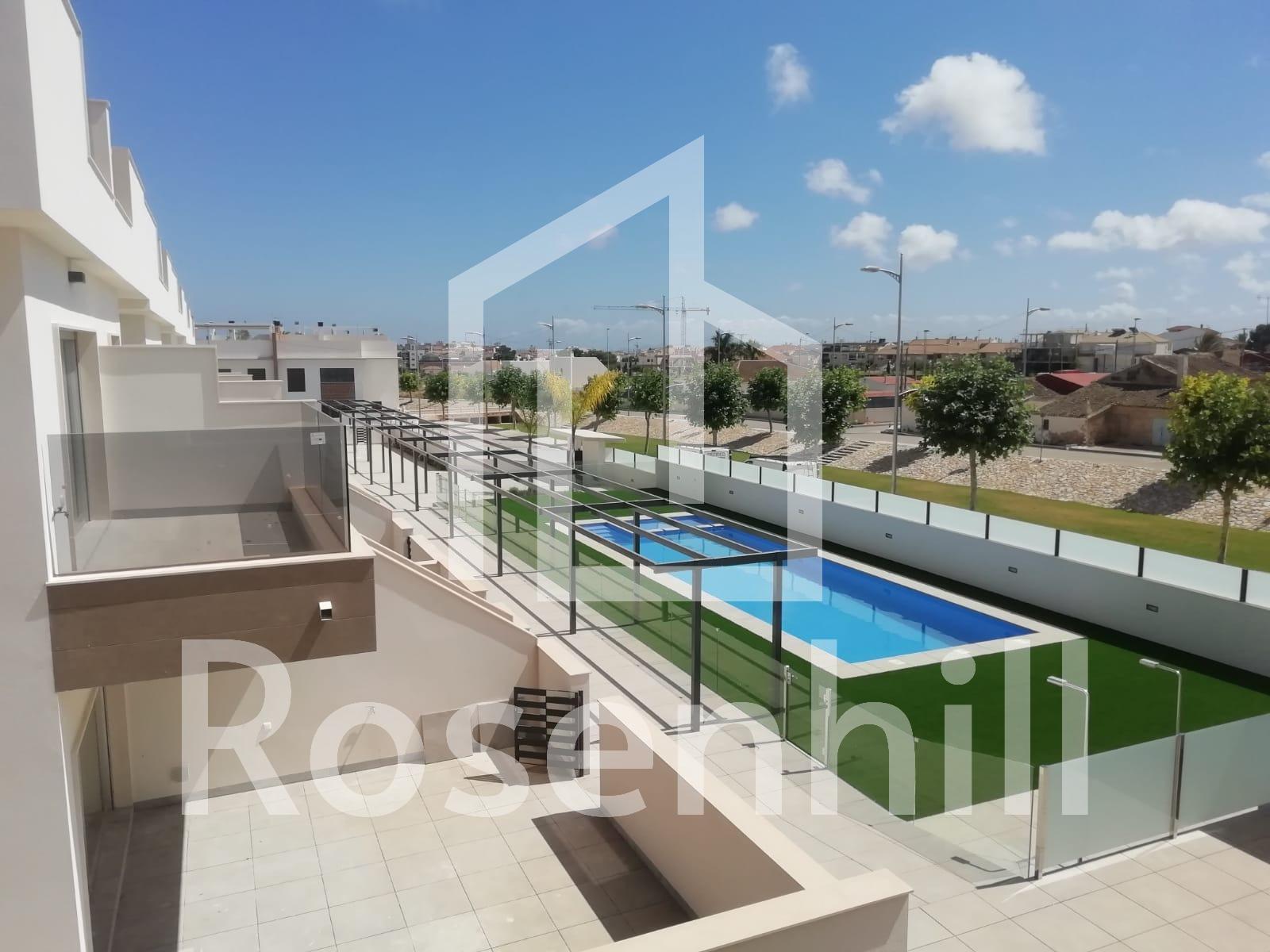 New-build residential complex of modern bungalows and townhouses in Pilar de la Horadada. The new-build townhouses have 3 bedrooms, 3 bathrooms, an open-plan kitchen with a spacious living-dining room, built-in wardrobes, and a terrace. All homes have a private parking space and storage room. Ground floor bungalows with private garden and top floor bungalows with private solarium All properties have a private parking space and storage. Pilar de la Horadada is a typical Spanish village in the most southern part of the Costa Blanca. The large main street has supermarkets, lots of shops, restaurants and bars and some lovely squares. The beautiful beaches of Torre de la Horadada and Mil Palmeras with fine sand promenade is just 5 minutes away. The airports of Corvera (Murcia) and Alicante are respectively 40 and 55 minutes away