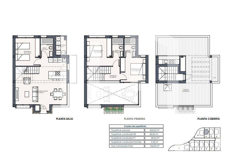 NEW BUILD RESIDENTIAL OF VILLAS IN LOS MONTESINOS New Build villas with 3 bedrooms and 3 bathrooms, open plan kitchen with living room-dining room. All villas have a terrace, a private swimming pool, a private garden, and a driveway. Basements are also available at an extra cost. They are all built with high-quality materials using advanced technology for our clients’ comfort and convenience. The typical town of Los Montesinos is strategically located 10 minutes by car from the beaches and leisure of Torrevieja (with all the services of a big city: theatre, 2 hospitals, international schools, etc.), from several golf courses and with easy access to the A7 motorway to reach Alicante airport in 20 min. In the urbanization there are supermarkets and bars for day-to-day service, being a rural and quiet environment. The climate in this area guarantees 300 days of sunshine a year with an average temperature of 20ºC, which, together with the rich gastronomy and cultural and sports activities available in its surroundings, makes this area an ideal place to establish a second residence for vacation or a quiet place to live permanently.