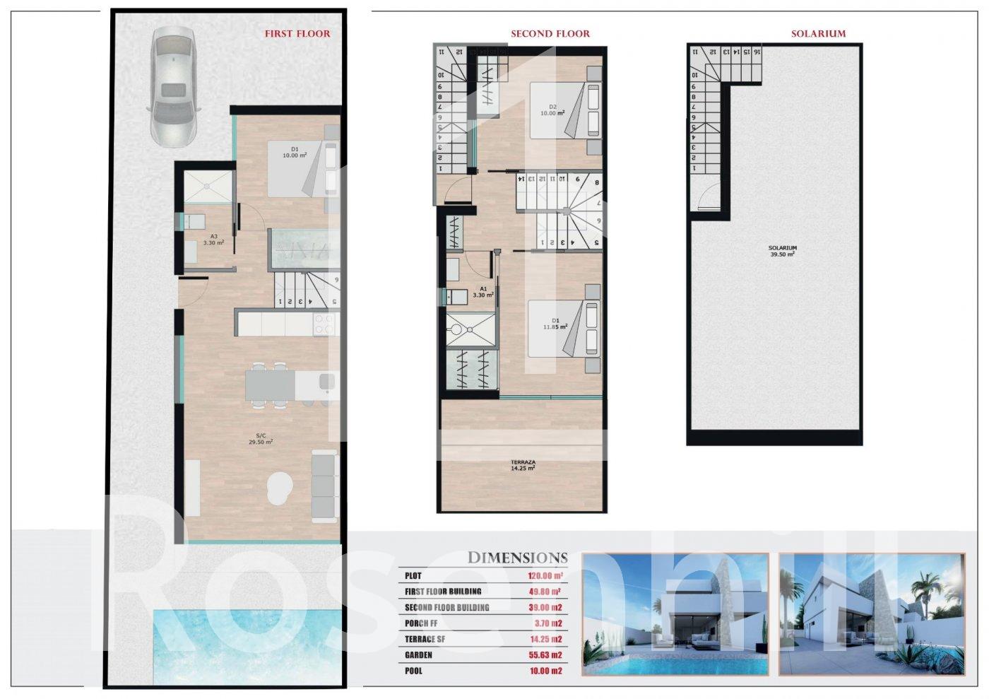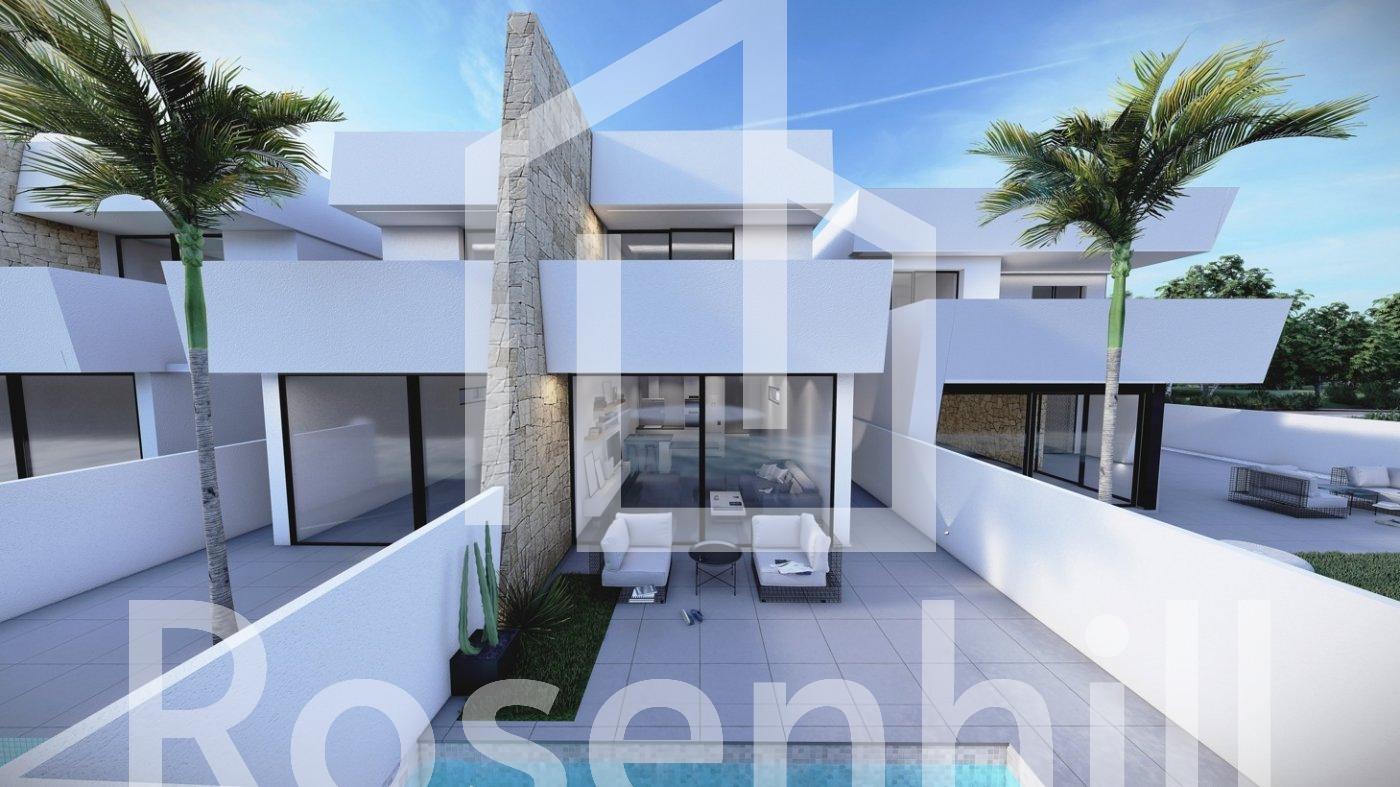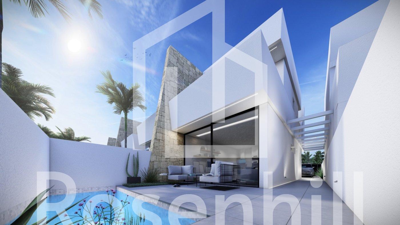 NEW BUILD SEMI DETACHED VILLAS IN SANTIAGO DE LA RIBERA New Build residential of detached and semi detached villas with private pools in Santiago de la Ribera (650 metres from the beaches) Properties designed to provide the very best open plan living space, featuring double full glass sliding doors that open directly on to a large terrace with private swimming pool, terrace and parking area. Villas offer 3 generously sized bedrooms (first floor with en-suite), and a further bathroom on the ground floor with walk in shower. The ground floor living area features a fully fitted kitchen with drop down table open plan lounge / dining area, fully fitted kitchen zone with appliances, exterior storage room and terraced areas to the side of the villa, from master bedroom and from the lounge area. The villas are perfectly situated as they are walking distance to Dos Mares shopping centre and many other shops, bars, restaurants and the beautiful beaches of the Mar Menor. The Wednesday & Saturday street market is just 150 metres away. Only 20 minutes to the popular Zenia Boulevard, 30 minutes from Cartagena city. This area offers a variety of sports activities, including seasonal water sports … With some particularly good golf courses very close by! Santiago de la Ribera is a coastal town administratively dependent on the municipality of San Javier. It has 4 km of beach that are a great attraction for tourists from different origins. Murcia/Corvera airport is 30 minutes away and Alicante airport is an hour drive away.