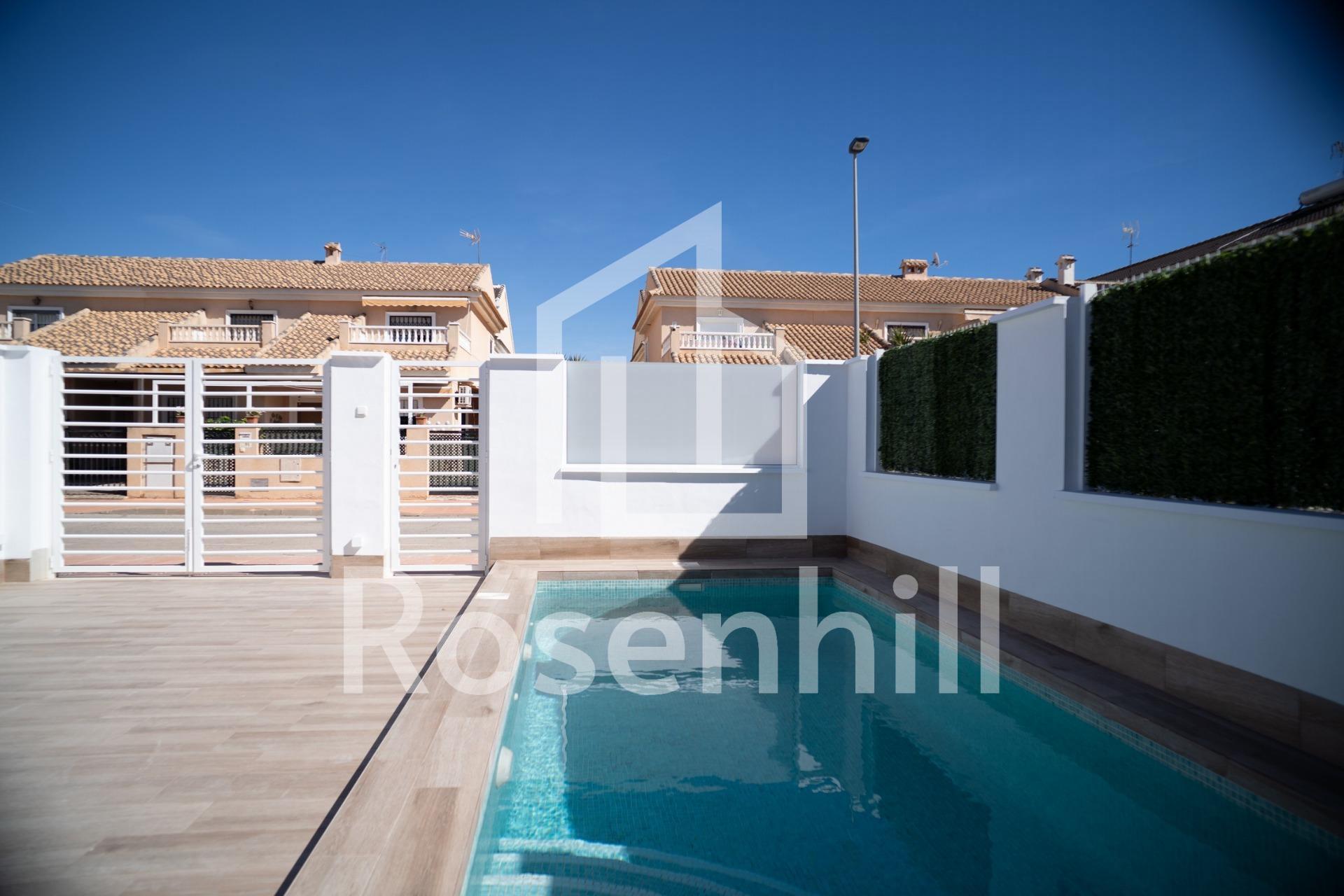 NEW BUILD TOWNHOUSES IN SAN JAVIER New Build luxury complex of 24 one level villas or on 2 floors with private pool, terraced area and solarium with Summer kitchen that allows you to enjoy all hours of sunshine, every day of the year. Each villa has 2 or 3 bedrooms and 2 fitted bathrooms on one level or 3 bedrooms and 3 fitted bathrooms on two levels. Designed with a contemporary style and open planned concept, comprising a fully-fitted kitchen and lounge-dining room. The development is located in San Javier (Murcia), near the beach, surrounded by services, parks, sports facilities and several Golf Courses. The property will meet the highest standards and will be equipped with: Private swimming pool with shower. Kitchen completely furnished and equipped with oven, microwave, fridge, integrated dishwasher, hob and extractor fan. Lighting: inside the property (dining room, kitchen, corridors and bathrooms) as well as in outdoor areas. Lined wardrobes with drawers. Fully fitted bathrooms with toilet, vanity unit, mirror and shower with screen panels. Pre-installation for ducted air conditioning. Solarium with Summer kitchen. Parking space on the plot. San Javier is close to all amenities with easy access to the beach, water sports, shops and the transport network. Here you can enjoy all of the facilities that San Javier has to offer such as the local shops, bars and restaurants as well as being near to shopping centres, the airport of Murcia and all of the beautiful places to be found along the Mar Menor. Corvera/Murcia airport is 30 minutes away and Alicante airport is 45 minutes away.