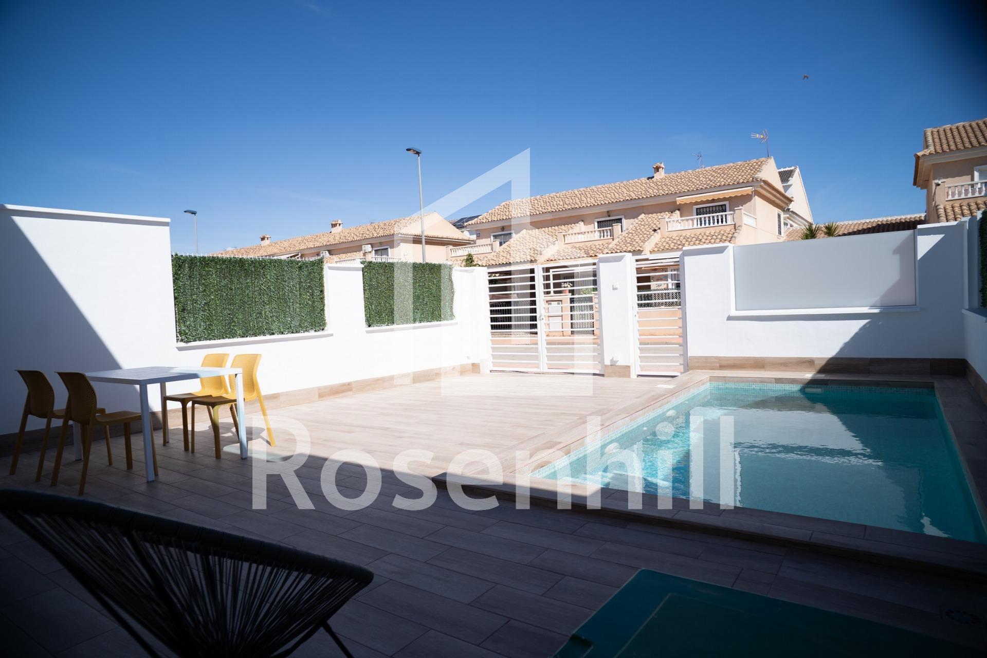 NEW BUILD TOWNHOUSES IN SAN JAVIER New Build luxury complex of 24 one level villas or on 2 floors with private pool, terraced area and solarium with Summer kitchen that allows you to enjoy all hours of sunshine, every day of the year. Each villa has 2 or 3 bedrooms and 2 fitted bathrooms on one level or 3 bedrooms and 3 fitted bathrooms on two levels. Designed with a contemporary style and open planned concept, comprising a fully-fitted kitchen and lounge-dining room. The development is located in San Javier (Murcia), near the beach, surrounded by services, parks, sports facilities and several Golf Courses. The property will meet the highest standards and will be equipped with: Private swimming pool with shower. Kitchen completely furnished and equipped with oven, microwave, fridge, integrated dishwasher, hob and extractor fan. Lighting: inside the property (dining room, kitchen, corridors and bathrooms) as well as in outdoor areas. Lined wardrobes with drawers. Fully fitted bathrooms with toilet, vanity unit, mirror and shower with screen panels. Pre-installation for ducted air conditioning. Solarium with Summer kitchen. Parking space on the plot. San Javier is close to all amenities with easy access to the beach, water sports, shops and the transport network. Here you can enjoy all of the facilities that San Javier has to offer such as the local shops, bars and restaurants as well as being near to shopping centres, the airport of Murcia and all of the beautiful places to be found along the Mar Menor. Corvera/Murcia airport is 30 minutes away and Alicante airport is 45 minutes away.