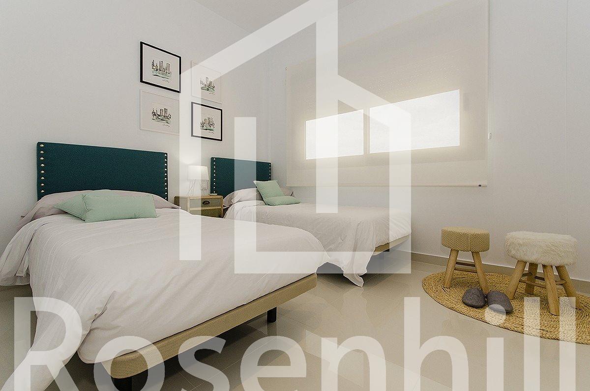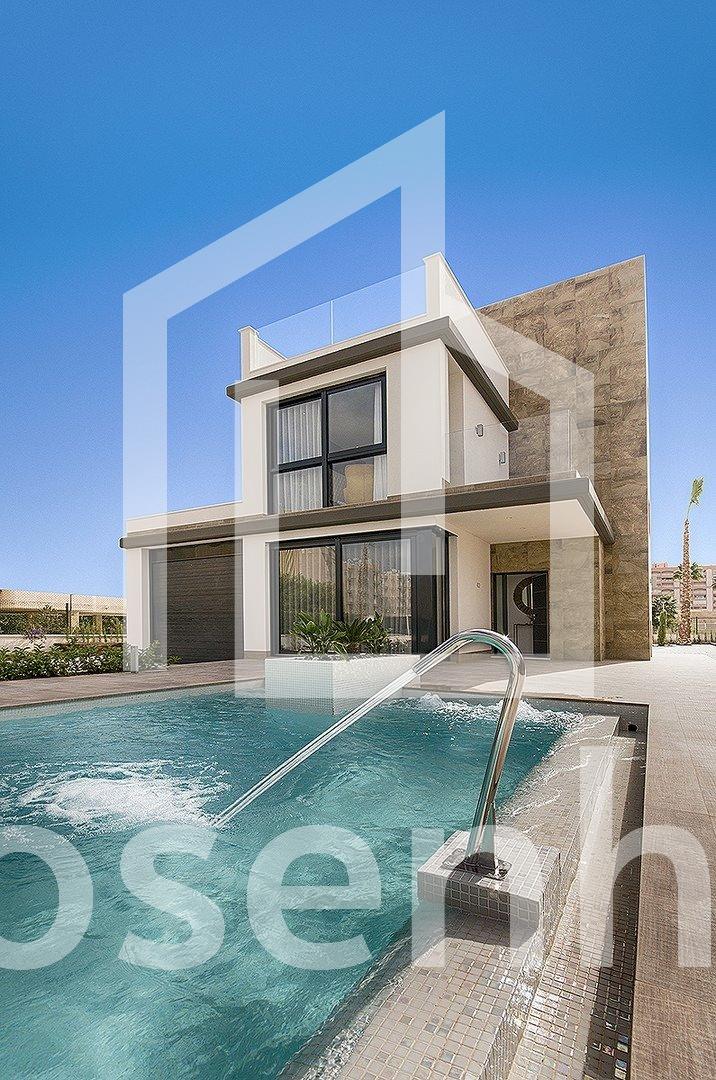 NEW BUILD VILLA IN ORIHUELA COSTA (CAMPOAMOR) Do you want to enjoy an exclusive vacation near the sea? Impossible not to fall for this ultra-modern villa in Orihuela Costa with 4 bedrooms, 2 bathrooms, private pool, garden and luxury extras, according to personal preferences. Its delicate infrastructure integrates with nature providing a quiet and isolated environment. Built with the highest quality materials, this elegant property is surrounded by abundant vegetation and a few meters from the cleanest beaches in Campoamor: Playa de la Glea, Aguamarina and Cabo Roig. It is a pleasure to have these three beautiful beaches that have been awarded with the Blue Flag within reach. Whenever you need a moment of reflection, you can go down to touch its crystal clear waters or lie down on its soft sand to read a book while listening to the placid sound of the sea. In the surroundings you will find all the essential services to live all year round: supermarkets, pharmacies, cafes, restaurants, shopping centers … And if you are also enthusiastic about golf, less than 10 minutes away you can choose between three privileged golf courses of international recognition where put your aim to the test: Las Colinas Golf, Villamartín or Las Ramblas. The promotion includes several models of homes with 2,3,4 and up to 5 bedrooms. This particular villa consists of 4 double bedrooms, 2 bathrooms, a fully equipped American kitchen, an open living-dining room with great lighting, access to the garden and the beautiful pool. In addition, the price includes: Underfloor heating and mirror in bathrooms Indoor and outdoor lights Built-in wardrobes Security door Pre-installation of air conditioning Top brand appliances The house follows the trend of open concept design, enhancing spacious spaces and offering a greater sense of comfort and well-being in its interiors.