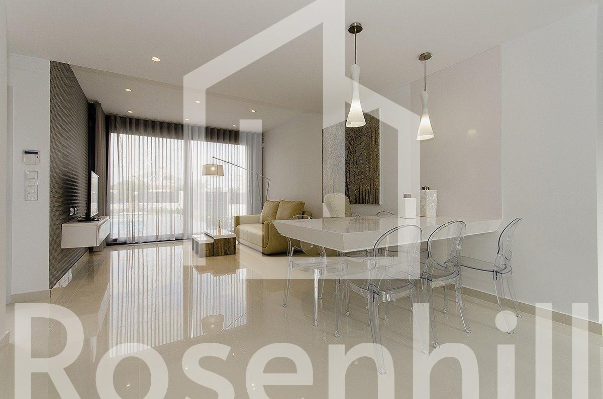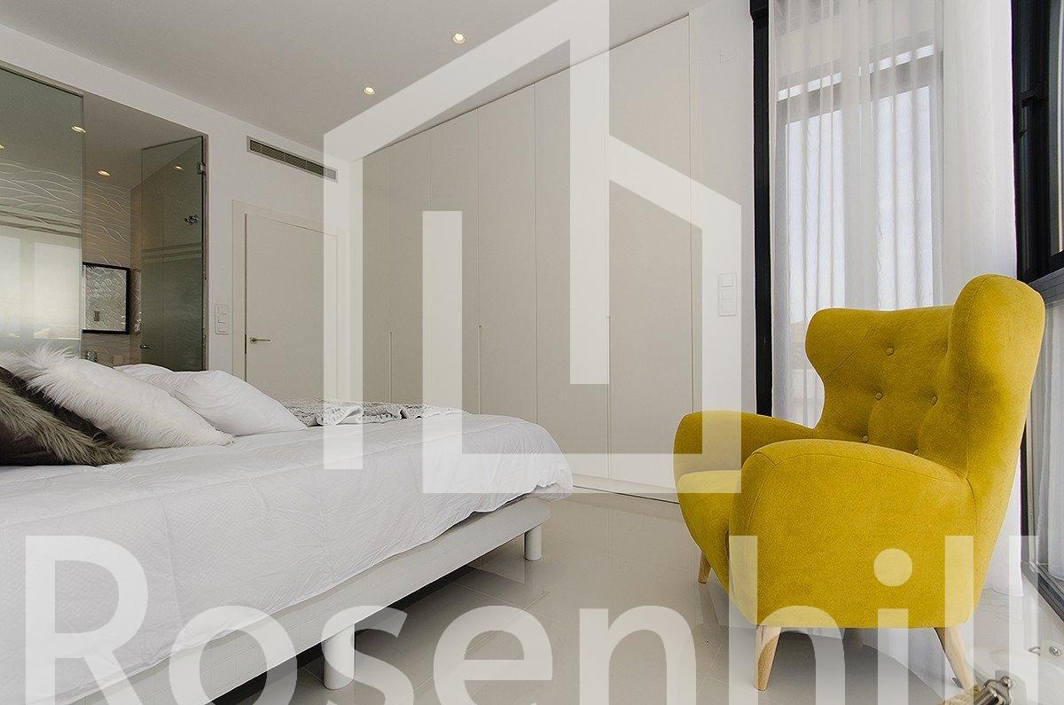 NEW BUILD VILLA IN ORIHUELA COSTA (CAMPOAMOR) Do you want to enjoy an exclusive vacation near the sea? Impossible not to fall for this ultra-modern villa in Orihuela Costa with 4 bedrooms, 2 bathrooms, private pool, garden and luxury extras, according to personal preferences. Its delicate infrastructure integrates with nature providing a quiet and isolated environment. Built with the highest quality materials, this elegant property is surrounded by abundant vegetation and a few meters from the cleanest beaches in Campoamor: Playa de la Glea, Aguamarina and Cabo Roig. It is a pleasure to have these three beautiful beaches that have been awarded with the Blue Flag within reach. Whenever you need a moment of reflection, you can go down to touch its crystal clear waters or lie down on its soft sand to read a book while listening to the placid sound of the sea. In the surroundings you will find all the essential services to live all year round: supermarkets, pharmacies, cafes, restaurants, shopping centers … And if you are also enthusiastic about golf, less than 10 minutes away you can choose between three privileged golf courses of international recognition where put your aim to the test: Las Colinas Golf, Villamartín or Las Ramblas. The promotion includes several models of homes with 2,3,4 and up to 5 bedrooms. This particular villa consists of 4 double bedrooms, 2 bathrooms, a fully equipped American kitchen, an open living-dining room with great lighting, access to the garden and the beautiful pool. In addition, the price includes: Underfloor heating and mirror in bathrooms Indoor and outdoor lights Built-in wardrobes Security door Pre-installation of air conditioning Top brand appliances The house follows the trend of open concept design, enhancing spacious spaces and offering a greater sense of comfort and well-being in its interiors.