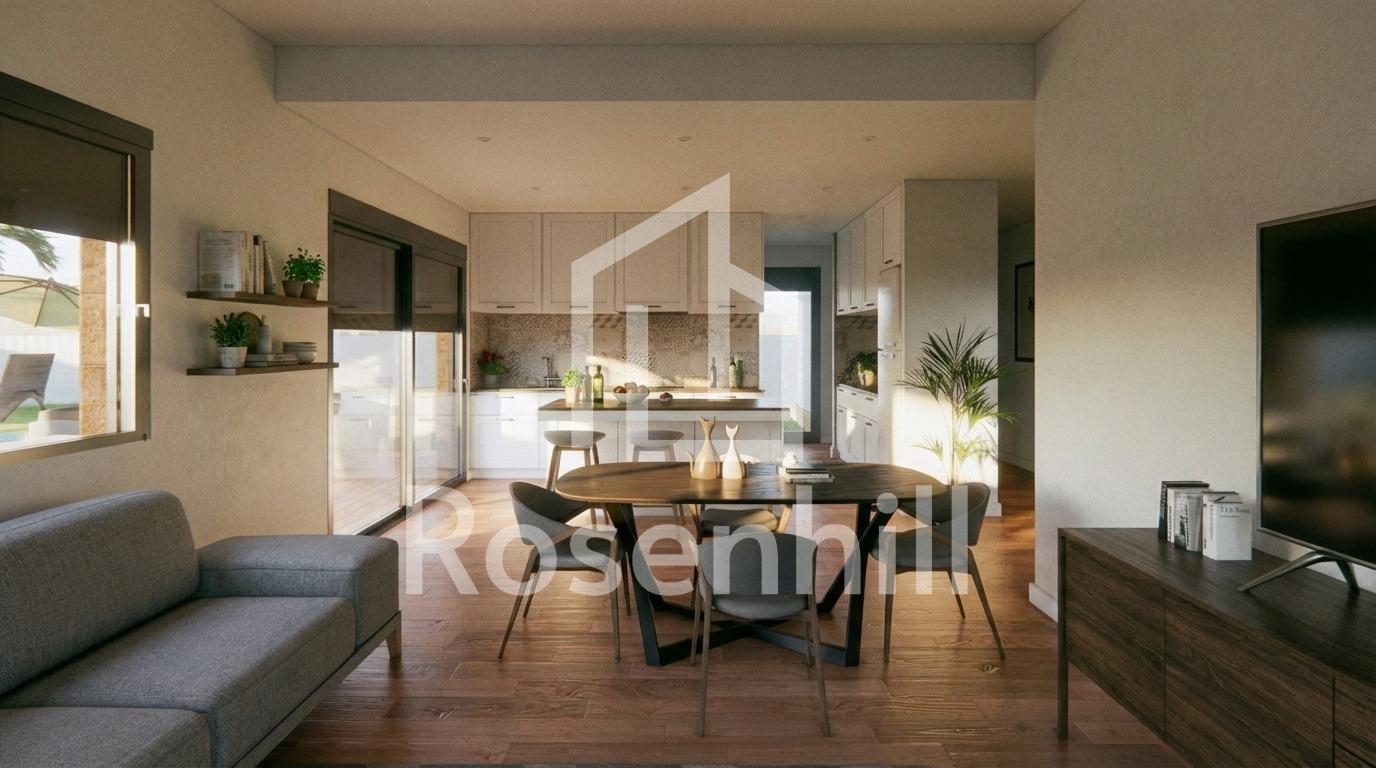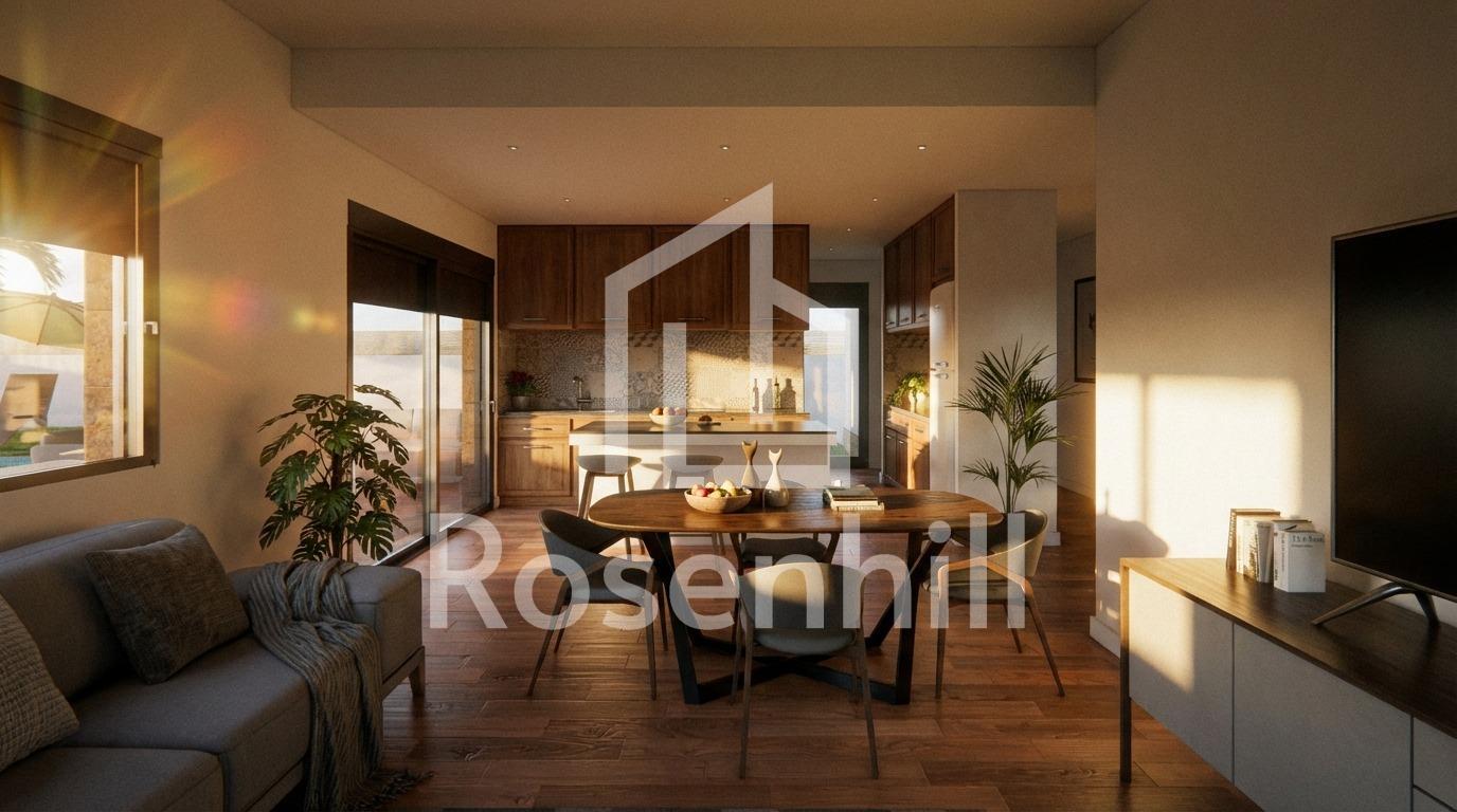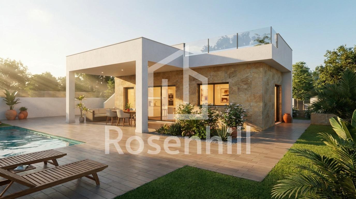 New Build Villa with Private Pool in Vistabella, Jacarilla Exclusive New Build Villa in a Natural and Golf Setting This new build villa under self promotion regime is located in the peaceful area of Vistabella, within the municipality of Jacarilla. Set in a natural environment between the Vistabella Golf course and the La Pedrera reservoir, this property offers privacy, open views and a relaxed Mediterranean lifestyle. The area is ideal for those seeking tranquility while remaining close to the coast, golf courses and everyday services. Vistabella is a well known residential area popular with international buyers thanks to its golf course, local restaurants and proximity to Orihuela Costa and Torrevieja. Jacarilla maintains its traditional Spanish charm, offering local shops, services and a friendly atmosphere all year round. Modern Single Level Layout with Spacious Outdoor Areas The villa is distributed on one single floor and has been designed to combine comfort, functionality and natural light. It offers 3 bedrooms and 2 bathrooms, including a master bedroom with ensuite bathroom. The open plan living and dining area connects seamlessly with the modern kitchen, creating a bright and welcoming living space. A covered terrace of 22 sqm provides direct access to the private garden, where a private swimming pool and landscaped areas invite you to enjoy the outdoor lifestyle. The generous 750 sqm plot also includes on plot parking space for two vehicles. Private Solarium with Open Views One of the highlights of this villa is the impressive private solarium of 120 sqm, accessed via an external staircase. From here, you can enjoy open panoramic views of the surrounding countryside, perfect for sunbathing, entertaining or relaxing throughout the year. Quality Specifications and Energy Efficient Features The villa is built with quality materials and modern specifications to ensure comfort and efficiency. Features include a reinforced security entrance door, aerothermal system for domestic hot water, electric blinds in the living room and bedrooms, and preinstallation of ducted air conditioning. These elements provide an ideal base for a comfortable and energy efficient home. Excellent Location Close to Golf, Nature and the Coast Vistabella Golf is located approximately 2 km away, while the La Pedrera reservoir is just 1.5 km from the property, ideal for nature lovers and outdoor activities. The beaches of Orihuela Costa are around 15 km away. Alicante International Airport is approximately 55 km away, offering easy connections to major European destinations. Several additional golf courses and shopping areas can be reached within 10 to 15 km. A Unique Opportunity on the Costa Blanca This new build villa in Vistabella is perfect as a permanent residence, holiday home or investment opportunity in a sought after location. Contact us today to receive more information and secure your new home in the heart of the Costa Blanca.