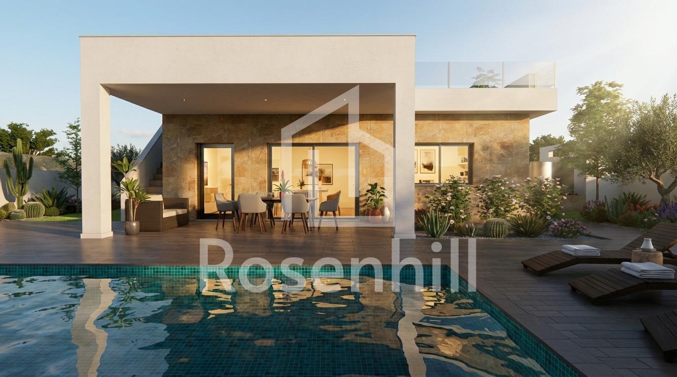 New Build Villa with Private Pool in Vistabella, Jacarilla Exclusive New Build Villa in a Natural and Golf Setting This new build villa under self promotion regime is located in the peaceful area of Vistabella, within the municipality of Jacarilla. Set in a natural environment between the Vistabella Golf course and the La Pedrera reservoir, this property offers privacy, open views and a relaxed Mediterranean lifestyle. The area is ideal for those seeking tranquility while remaining close to the coast, golf courses and everyday services. Vistabella is a well known residential area popular with international buyers thanks to its golf course, local restaurants and proximity to Orihuela Costa and Torrevieja. Jacarilla maintains its traditional Spanish charm, offering local shops, services and a friendly atmosphere all year round. Modern Single Level Layout with Spacious Outdoor Areas The villa is distributed on one single floor and has been designed to combine comfort, functionality and natural light. It offers 3 bedrooms and 2 bathrooms, including a master bedroom with ensuite bathroom. The open plan living and dining area connects seamlessly with the modern kitchen, creating a bright and welcoming living space. A covered terrace of 22 sqm provides direct access to the private garden, where a private swimming pool and landscaped areas invite you to enjoy the outdoor lifestyle. The generous 750 sqm plot also includes on plot parking space for two vehicles. Private Solarium with Open Views One of the highlights of this villa is the impressive private solarium of 120 sqm, accessed via an external staircase. From here, you can enjoy open panoramic views of the surrounding countryside, perfect for sunbathing, entertaining or relaxing throughout the year. Quality Specifications and Energy Efficient Features The villa is built with quality materials and modern specifications to ensure comfort and efficiency. Features include a reinforced security entrance door, aerothermal system for domestic hot water, electric blinds in the living room and bedrooms, and preinstallation of ducted air conditioning. These elements provide an ideal base for a comfortable and energy efficient home. Excellent Location Close to Golf, Nature and the Coast Vistabella Golf is located approximately 2 km away, while the La Pedrera reservoir is just 1.5 km from the property, ideal for nature lovers and outdoor activities. The beaches of Orihuela Costa are around 15 km away. Alicante International Airport is approximately 55 km away, offering easy connections to major European destinations. Several additional golf courses and shopping areas can be reached within 10 to 15 km. A Unique Opportunity on the Costa Blanca This new build villa in Vistabella is perfect as a permanent residence, holiday home or investment opportunity in a sought after location. Contact us today to receive more information and secure your new home in the heart of the Costa Blanca.
