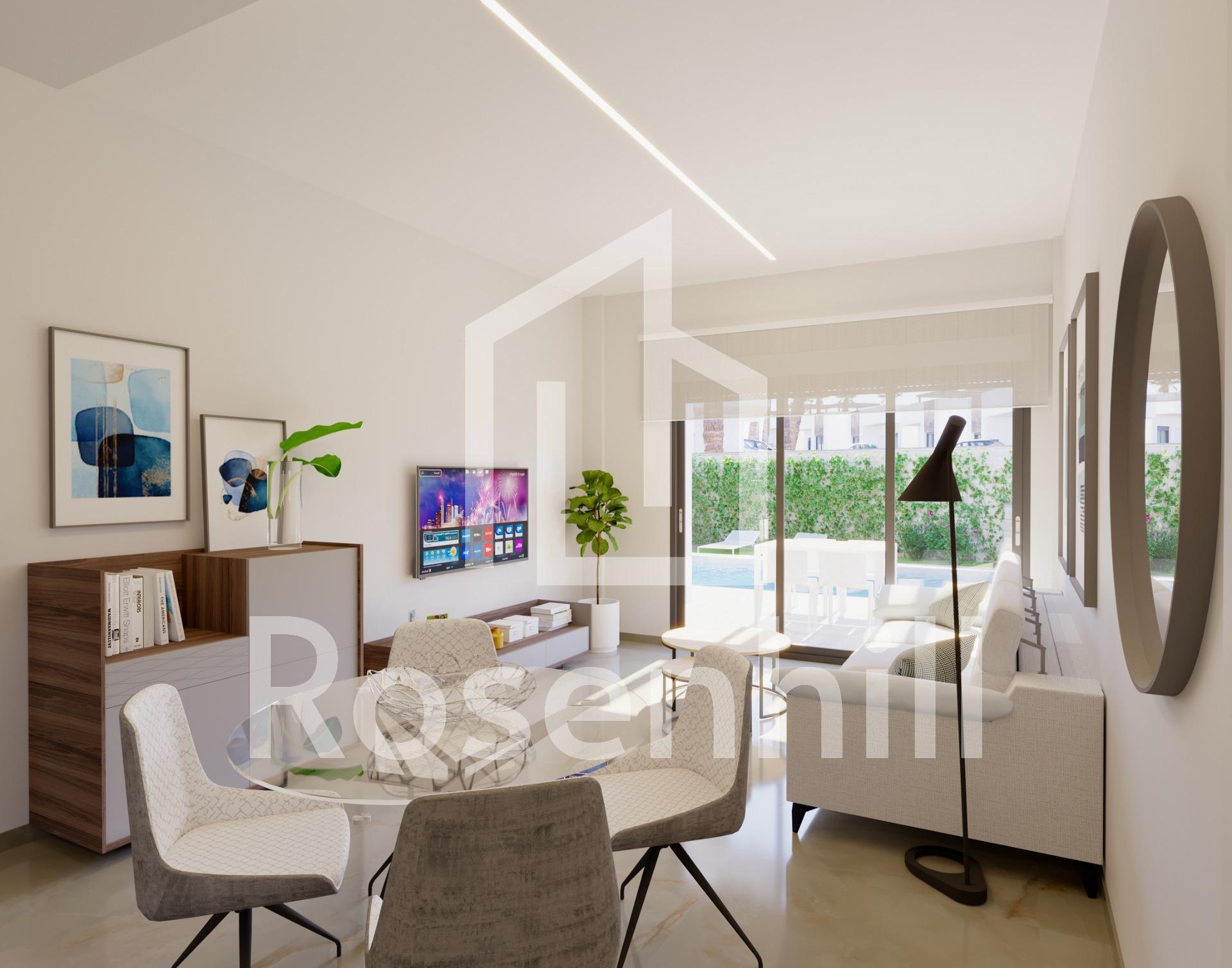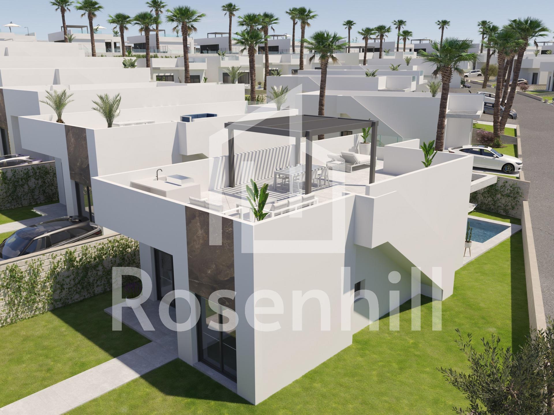 NEW BUILD VILLAS IN ALGORFA GOLF RESORT New Build residential of independent villas in La Finca Golf course, Algorfa. Villas build over 1 floor and consists of 3 bedrooms, 2 bathrooms, open plan kitchen, the living room with open views to the terrace, solarium, private garden with the pool and parking. Residential complex located in La Finca Golf resort, in the municipality of Algorfa, in the Vega Baja area of the Costa Blanca South. Only 15 minutes drive from the sandy beaches of Guardamar del Segura, and only 35 minutes from Alicante airport. The larger towns of Almoradi, Benijófar and Ciudad Quesada are a short drive away. Torrevieja and Orihuela Costa, with their large shopping centres, are 15 minutes away.