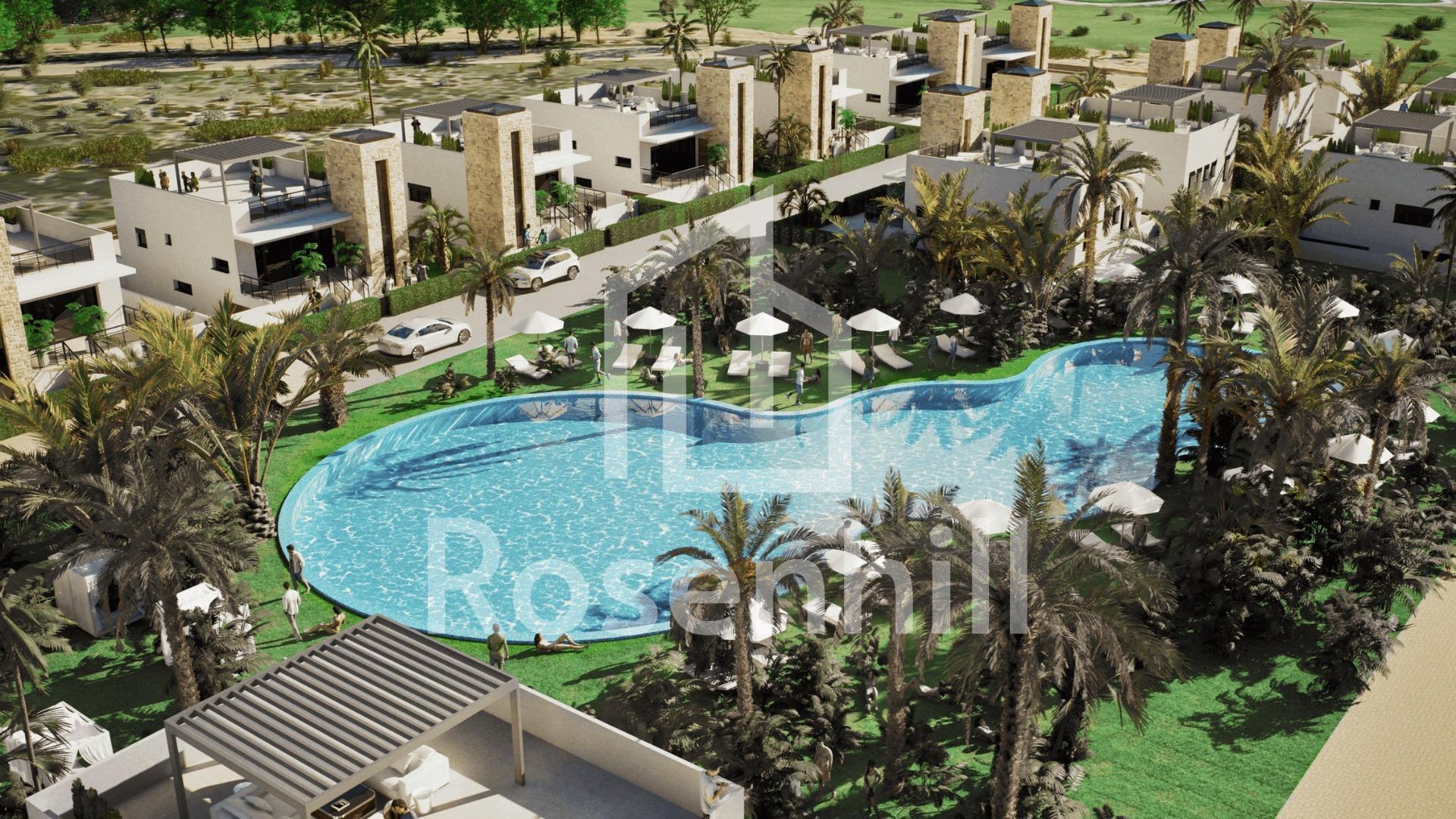 New Build Villas in Camposol Golf (Mazarron-Murcia) with Private Solarium and Basement Exclusive Residential Villas at Camposol Golf Discover this private residential complex of 69 independent villas located in a plot frontline to Camposol Golf in Mazarron, Murcia. Designed around a large central green oasis with a communal swimming pool and landscaped gardens, this development offers a peaceful and secure environment ideal for enjoying the Mediterranean lifestyle. The location combines tranquility with convenience, as the nearby village of El Saladillo provides daily services, shops and local amenities within a short distance. The beautiful beaches of Puerto de Mazarron are just 14 km away, making this an excellent option for both permanent living and holiday homes. Modern Single Level Villas with Flexible Layouts The development offers a selection of modern villas built on one level, available in two or three bedroom configurations. All homes include two bathrooms, one of them en suite, designed with functionality and comfort in mind. Each villa is set on a private plot starting from 300 m2, providing outdoor space for relaxation and entertainment. The properties also feature a private solarium, offering additional outdoor living space with open views of the surrounding golf course and landscape. Basement and Customization Potential A key feature of these villas is the inclusion of a spacious basement, allowing owners to customize the space according to their needs. This area can be adapted into a gym, storage room, home cinema or additional living space, offering great flexibility and added value. The villas are designed with interior stairs connecting all levels, ensuring easy access between the basement, main living area and rooftop solarium. Quality Features and Comfortable Living These new build homes are delivered with high quality finishes and modern features. The kitchens come fully furnished and equipped with appliances, while the bathrooms are completed with shower screens and fittings. Additional features include pre installation for air conditioning, built in wardrobes, electric shutters and a full LED lighting package, ensuring comfort and convenience from day one. Prime Location in Mazarron Near Golf and Coast Camposol is a well established residential area known for its golf course, relaxed atmosphere and international community. Mazarron offers a wide range of services, restaurants and leisure options, while the nearby coast is famous for its sandy beaches and crystal clear waters. Key distances include Camposol Golf on your doorstep, El Saladillo village 2 km, Puerto de Mazarron beaches 14 km, Mazarron town center 10 km, Murcia Corvera Airport 35 km and Cartagena city 40 km. Ideal Investment and Lifestyle Opportunity in Murcia This development offers an excellent opportunity to own a modern villa in a golf front location with great potential for customization and strong rental appeal. Contact us today to receive more information or to arrange a viewing and secure your new villa in Camposol-Mazarron.
