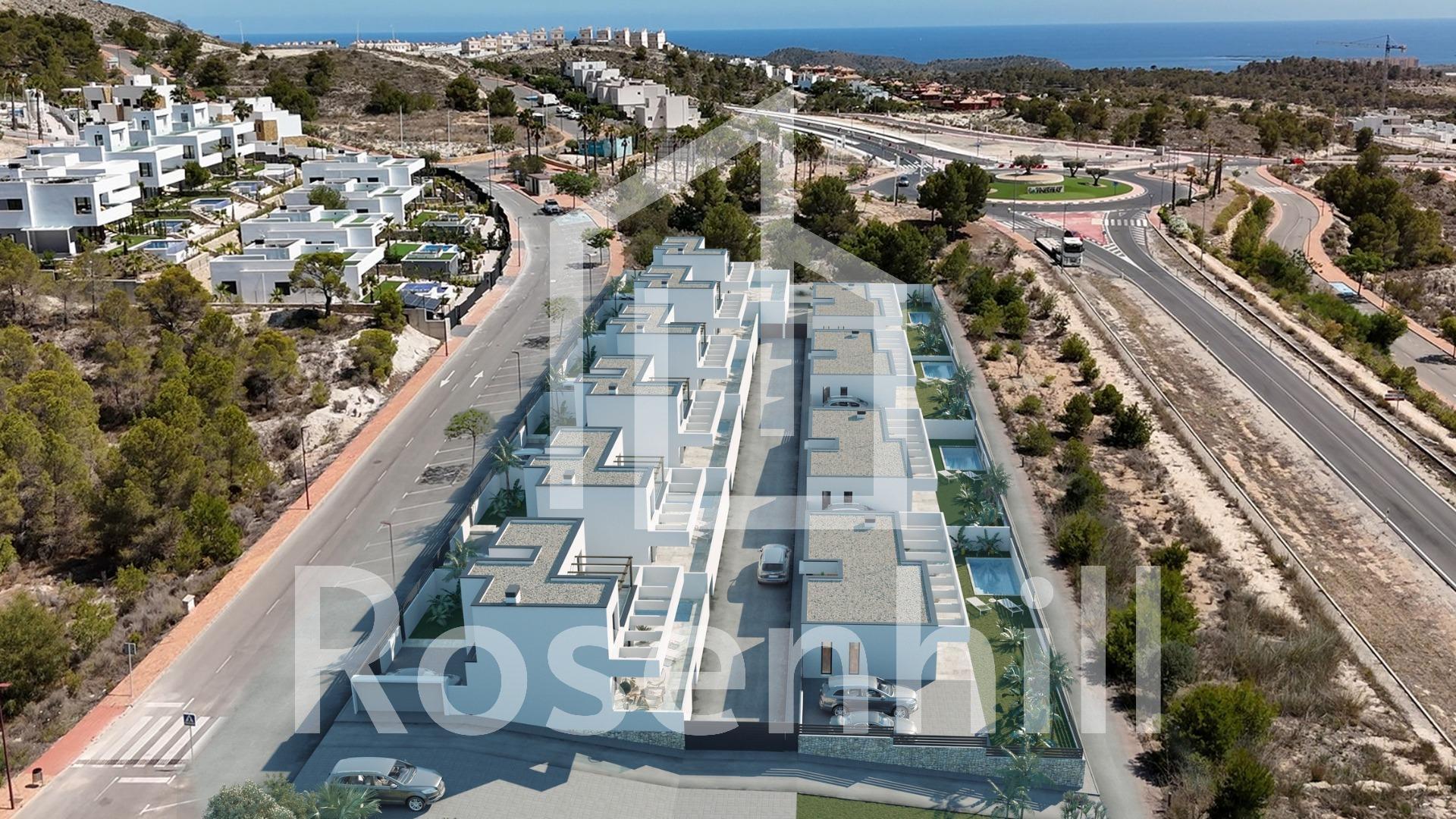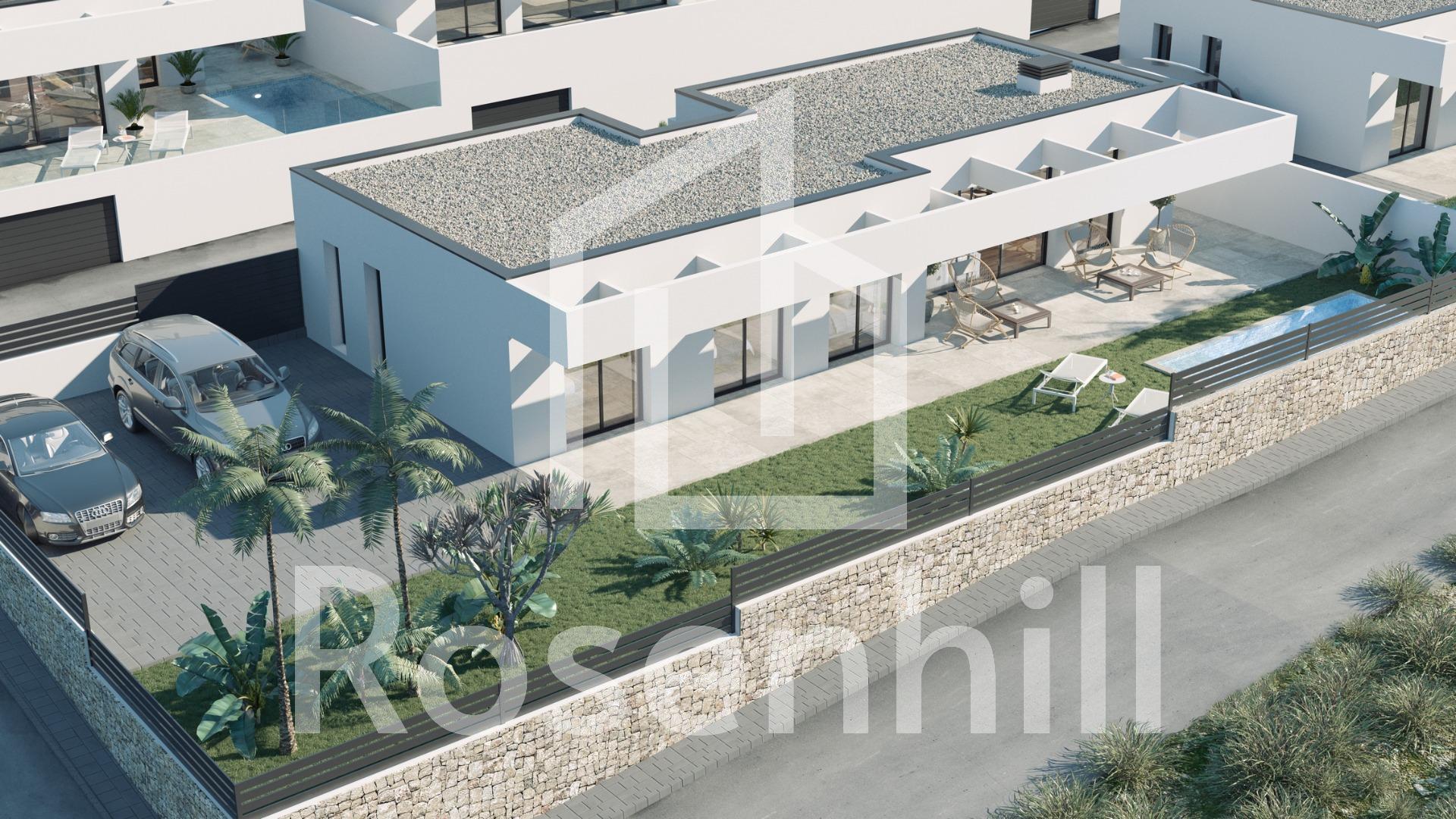 NEW BUILD VILLAS IN FINESTRAT New Build project of 10 modern design villas, in a natural setting with views of the sea and the mountains, near the Puig Campana golf course, and a short distance from the towns of Finestrat and Benidorm. The project will be divided into two construction phases, which in turn include two types of homes, with 1 or 2 floors, 3 double bedrooms, 2 or 3 complete bathrooms, living-dining room with integrated kitchen, laundry room, large terrace and garden, private pool, outdoor parking, 1 or 2 multipurpose basements and in some models closed underground garage. An options for a solarium at an extra cost. Villas built with the best qualities and latest advances in construction, among others: - Glass railings that do not break the continuity of the views. - First quality porcelain stoneware flooring. - Armoured entrance door. - Aluminium exterior carpentry with thermal bridge break and double insulating glass with low emissivity with air chamber and safety in areas at risk of breakage. - Smooth interior carpentry, made of white lacquered wood with stainless steel handles and fittings. - Fully equipped sliding wardrobes and dressing rooms. - Production of domestic hot water through a heat pump system with a 100L accumulator tank, with the support of solar panels on the roof. - High-grade electrical installation 9.2kw. - Installation of air conditioning through ducts with machines included. - Minimalist design kitchens, fully equipped with island, furniture and appliances included. - Private pool with lighting and beach area with pavement or artificial grass. - Fully customisable multipurpose basement, depending on the model with a garage area for a vehicle and pre-installation for an electric vehicle. Villas is located in a privileged environment on the Costa Blanca, in an elevated area at the foot of the mountains, surrounded by nature and other similar urbanisations, with excellent views of the sea and its surroundings. Very well connected by road with the nearby town of Finestrat, 10 minutes by car from shopping censers, the A7 motorway, the beaches and the nearby towns of Benidorm and Villajoyosa, and 30 minutes from the city of Alicante and its international airport.