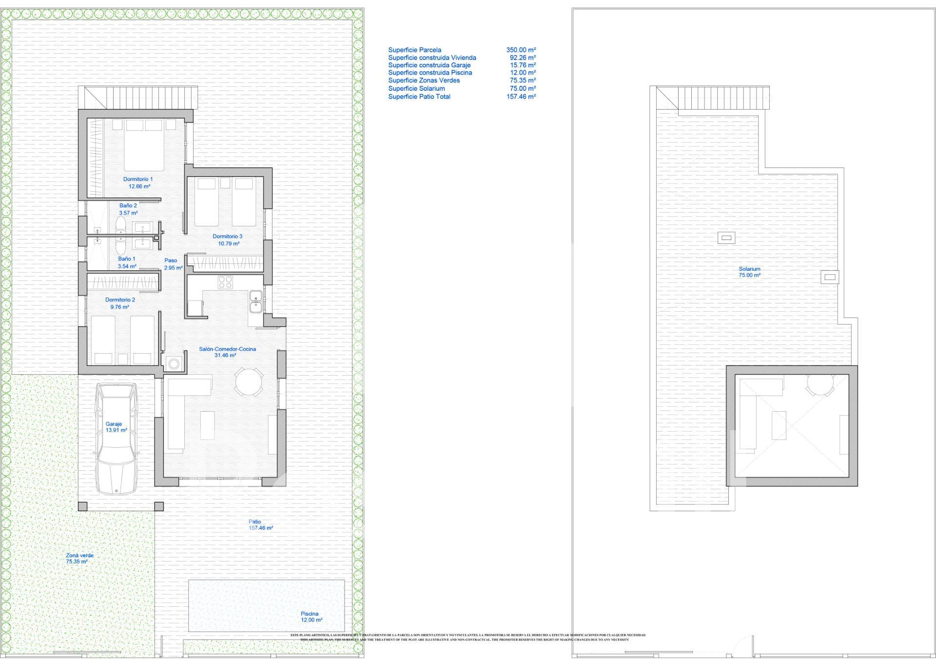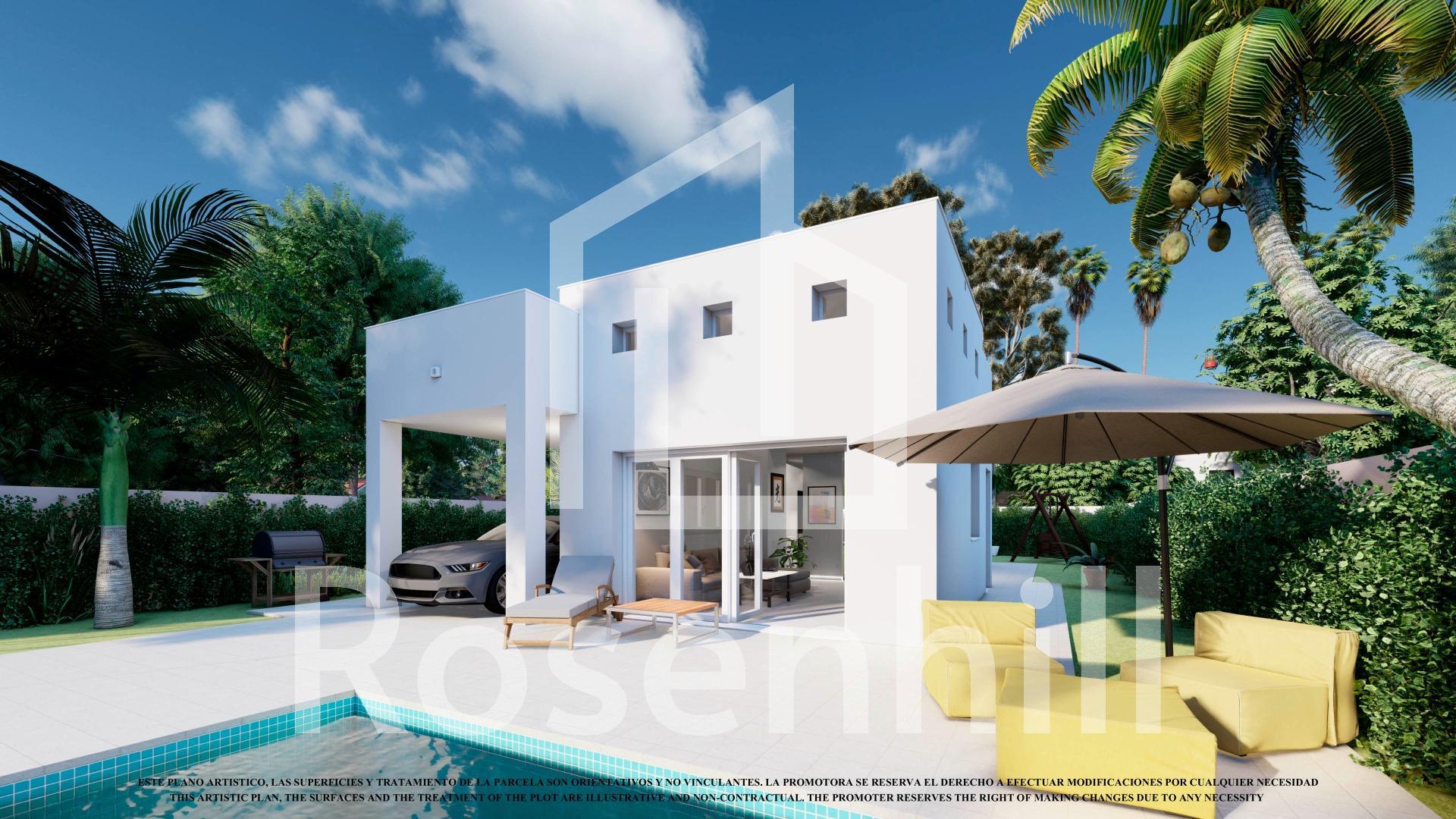 NEW BUILD VILLAS IN LOS ALCAZARES New Build detached villa build on the generous plot of 350m2 in Los Alcazares . Villa with 3 bedrooms and 2 bathrooms, open plan kitchen with the lounge area, fitted wardrobes, solarium, private garden with off road parking space and space for a swimming pool. An options for a private pool at an extra cost. Spacious living room has large sliding doors to a terrace. Ample terraces at the front and rear ensure that owners can sunbathe throughout the day. This villas have modern fitted kitchens with a choice of colours for kitchen units and wall tiles in both kitchens and bathrooms and also floors and terraces. Residential of villas located 1 km from the beach and the town of Los Alcázares, where you can practice various water sports, surrounded by several golf courses. City of Cartagena less than 15 minutes by car and 30 minutes from Murcia Corvera airport.